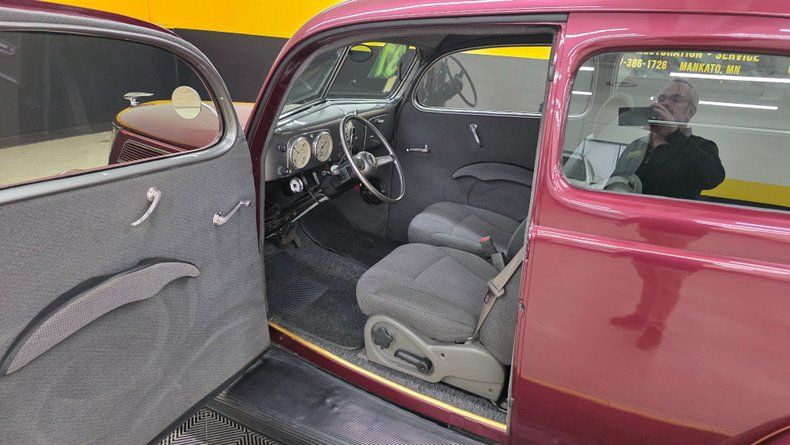 1937 Ford two-door sedan streetrod. This all-steel vehicle features a 350 small block V8 engine paired with a Turbo Hydramatic 350 automatic transmission. The exterior has a medium plum metallic paint with chrome American Racing torque thrust wheels and tasteful powder-coated grille details. Equipped with power steering, Mustang II front suspension, HEI ignition, a Ford 8-inch rear end, new battery, an Edelbrock 4 bbl carb and intake manifold, and an aluminum radiator with electric fan. Original venting style door windows are intact, as well as tilting windshield vent. Inside a very nice gray cloth interior with later model buckets seats including integrated seatbelts. The hood opens with the hood ornament by turning it to the left. The interior is restored with quality cloth upholstery, aftermarket steering wheel and Dolphin gauges, working wipers, and under the dash is a tachometer that also functions. Equipped with cruise control, and a radio that works as well as maintains its vintage stylings. On the road a very comfortable responsive ride, with great power steering and drivability.