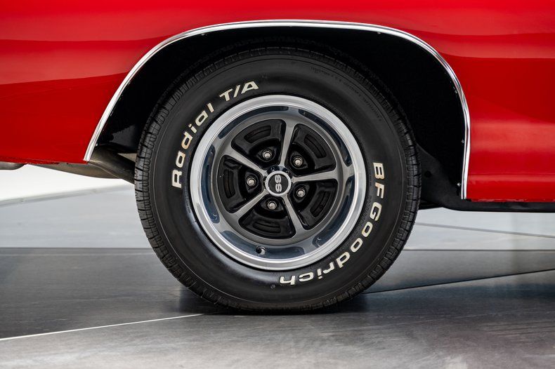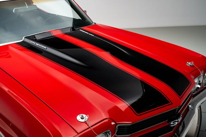 The body was restored to a high standard and refinished in its striking Cranberry Red, a color that perfectly complements the aggressive 1970 sheetmetal. Painted black stripes stretch across the cowl induction hood and decklid, emphasizing the Chevelle's squared shoulders and muscular proportions. Panel alignment is tight, chrome and trim present cleanly, and the car retains the visual authority that has made the 1970 Chevelle the definitive body style of the generation. Radial tires have been fitted for improved drivability while maintaining the car's period-correct stance.