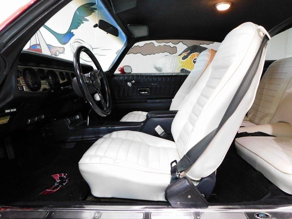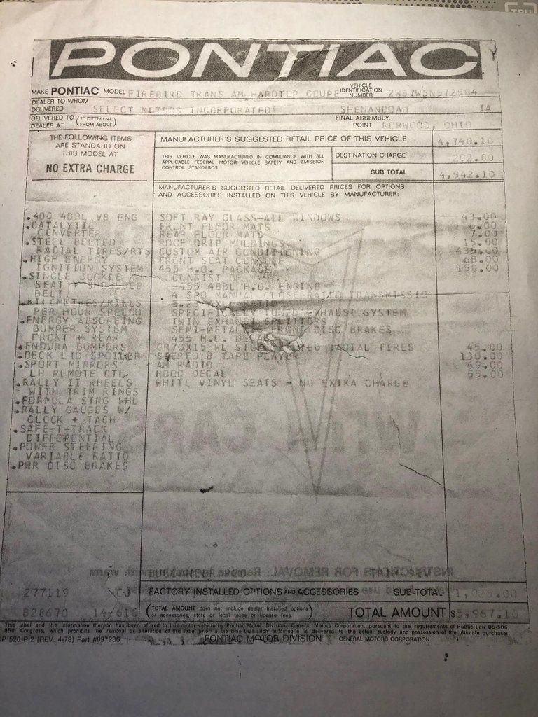Rare 1975 Pontiac Firebird Trans Am 455 coupe in Buccaneer Red over White/Black interior! 4-speed manual transmission, 15" steel wheels, recently replaced tires, Shaker hood, air conditioning, Hurst shifter, Kenwood stereo, manufacturer's literature, copy of window sticker, original sale documentation, recent service records and more! VIN: 2W87W5N572584. This 1975 Pontiac Firebird Trans Am is claimed to be one of 857 produced for the model year that were equipped with a 455ci V8. This example is finished in Red over White upholstery, and equipment includes a four-speed manual transmission, a Shaker hood, front disc brakes, front and rear spoilers, Trans Am decals, front bucket seats, air conditioning, a Hurst shifter, and a Kenwood cassette stereo. The car was acquired by the previous owner in April 2021, and subsequent work reportedly included rebuilding the front calipers and replacing the air-conditioning compressor, master cylinder, brake booster, shock absorbers, and tires. This Trans Am is now offered by the seller on behalf of his son with a copy of a window sticker, an original purchase contract, manufacturer's literature, and a clean title. The body was refinished in Red during prior ownership and features a "Screaming Chicken" hood decal, a Shaker hood, chrome window trim, front and rear spoilers, and quad exhaust tips. Factory 15" steel wheels are accented by chrome trim rings and are mounted with 225/60 BFGoodrich Radial T/A tires, which are said to have been recently installed. The seller reports that additional recent service included rebuilding the front brake calipers and replacing the master cylinder, brake booster, and shock absorbers. The cabin features high-back front bucket seats with White upholstery, along with contrasting Black door panels and carpets. Equipment includes air conditioning, a hurst shifter, and a kenwood cassette stereo. The seller states that the air-conditioning compressor was replaced during current ownership. The three-spoke steering wheel sits ahead of a 100-mph speedometer, a tachometer, and gauges for oil pressure, coolant temperature, fuel level, and voltage. The five-digit odometer shows 37k miles, approximately 900 of which were added during current ownership. The 455ci V8 was made available partway through the 1975 model year. Recent service reportedly included a coolant flush and replacement of the thermostat. Power is sent to the rear wheels through a four-speed manual transmission, which the seller notes weeps fluid. The transmission and differential were reportedly serviced during current ownership. The engine is stamped WX, which aligns with a 1975-production 455 V8. The engine serial number is shown in the gallery below. ST75 – 1975 model year FS87 – firebird coupe N – Norwood, Ohio assembly plant pnt 75l 75U – Buccaneer Red upper and lower paint TR91V – White upholstery A51 – bucket seats 07A – first week of July assembly blk – Black secondary interior color. Shipping available! We ship to you!