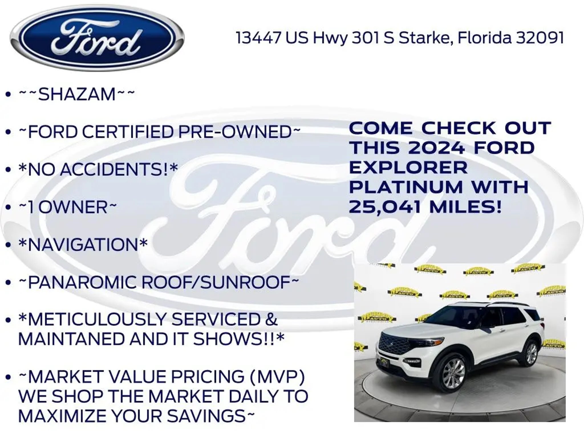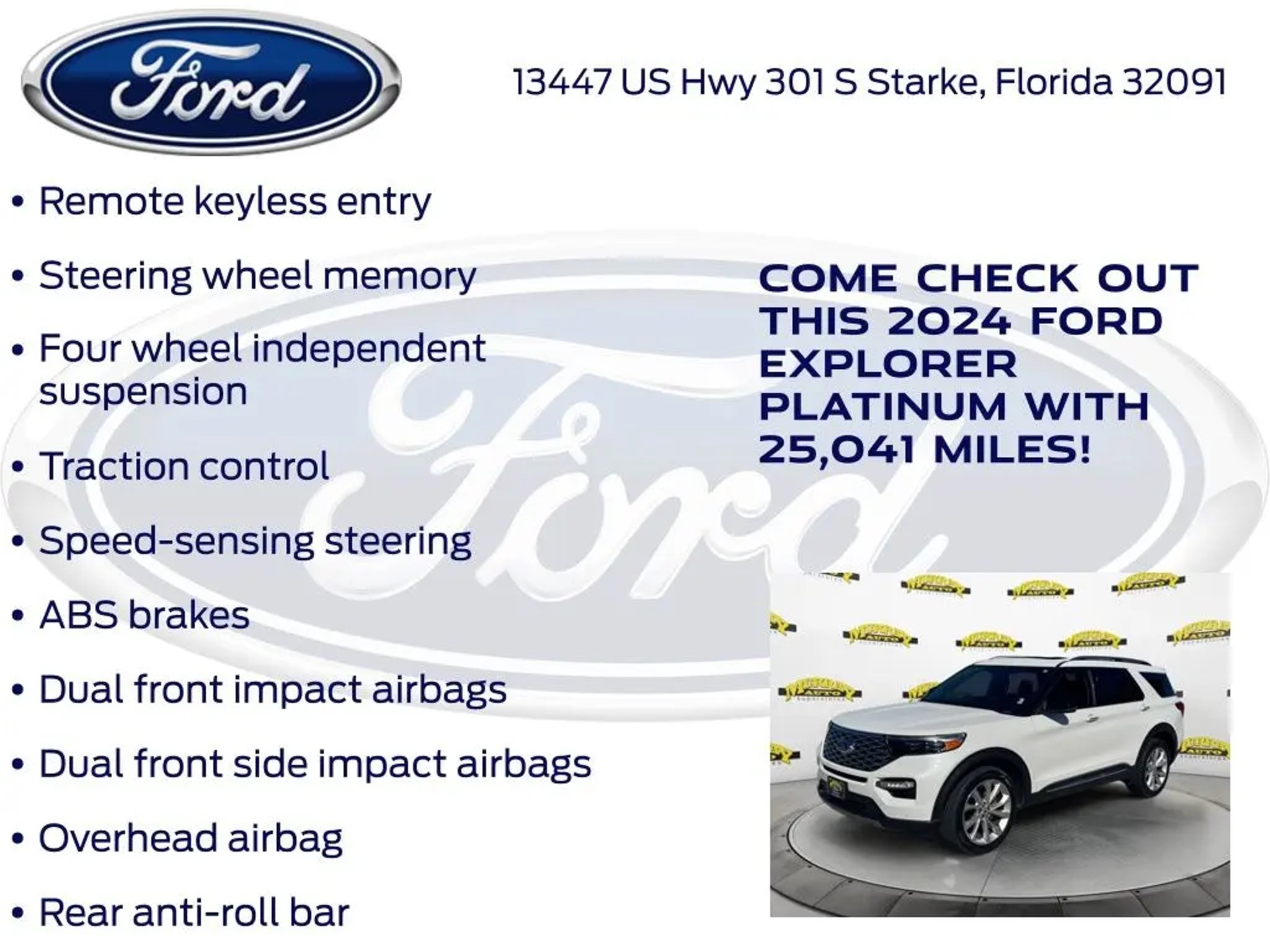 CARFAX One-Owner. Priced below KBB Fair Purchase Price! Murray Ford Superstore of Starke is pumped up to offer this good-looking 2024 Ford Explorer in White Metallic This vehicle is readily available and comes with the following Class IV Trailer Tow Package, Equipment Group 601A, Technology Package (10.1 LCD Capacitive Portrait Touchscreen and 2 Additional Speakers), Ford Gold Certified Certified, 4WD, 12 Speakers, 360-Degree Camera Credit, 3rd row seats: bench, 4-Wheel Disc Brakes, 4G LTE Wi-Fi Hotspot Credit, ABS brakes, Air Conditioning, Alloy wheels, AM/FM radio: SiriusXM, Auto High-beam Headlights, Auto-dimming door mirrors, Auto-dimming Rear-View mirror, Automatic temperature control, Brake assist, Bumpers: body-color, Compass, Delay-off headlights, Driver door bin, Driver vanity mirror, Dual front impact airbags, Dual front side impact airbags, Electronic Stability Control, Emergency communication system: SYNC 3 911 Assist, Exterior Parking Camera Rear, FordPass Connect, Four wheel independent suspension, Front anti-roll bar, Front Bucket Seats, Front Center Armrest, Front dual zone A/C, Front fog lights, Front License Plate Bracket, Front reading lights, Fully automatic headlights, Garage door transmitter, Genuine wood dashboard insert, Heated door mirrors, Heated front seats, Heated rear seats, Heated steering wheel, Illuminated entry, Knee airbag, Leather Htd/Ventilated Sport Captain's Chairs, Leather steering wheel, Low tire pressure warning, Navigation System, Occupant sensing airbag, Outside temperature display, Overhead airbag, Overhead console, Panic alarm, Passenger door bin, Passenger vanity mirror, Power door mirrors, Power driver seat, Power Liftgate, Power passenger seat, Power steering, Power windows, Radio data system, Radio: B&O Sound System by Bang & Olufsen, Rain sensing wipers, Rear air conditioning, Rear anti-roll bar, Rear reading lights, Rear window defroster, Rear window wiper, Remote keyless entry, Reverse Brake Assist Credit, Safe Deposit - Console Vault, Security system, Speed control, Speed-sensing steering, Speed-Sensitive Wipers, Split folding rear seat, Spoiler, Steering wheel memory, Steering wheel mounted audio controls, SYNC 3 Communications & Entertainment System, SYNC 3/Apple CarPlay/Android Auto, Tachometer, Telescoping steering wheel, Tilt steering wheel, Traction control, Trip computer, Turn signal indicator mirrors, Twin Panel Moonroof, Variably intermittent wipers, Ventilated front seats, Voice-Activated Touchscreen Navigation System, and Wheels: 21 Bright Machined-Face Aluminum; Ford Gold Certified Details: * Warranty Deductible: $100 * Limited Warranty: 12 Month/12,000 Mile (whichever comes first) after new car warranty expires or from certified purchase date * Powertrain Limited Warranty: 84 Month/100,000 Mile (whichever comes first) from original in-service date * Roadside Assistance * and 22,000 FordPass Rewards Points to use toward first two maintenance visits * Transferable Warranty * 172 Point Inspection * Vehicle History 15 Year 150,000 mile warranty at no cost applies to all vehicles excluding Transit Vans, DRW Trucks, any SVT Models, or similar vehicles. See sales for details! All vehicles will have a $999.00 dealer fee added to the total sale price (excludes A,Z,D, and X plan customers). Taxes, tag, title fees and a $125 Electronic filling fee will be added to all vehicles in accordance with state laws of customers registering address. *** We make every effort to provide you with the most accurate, up-to-the-minute information, however it is your responsibility to verify with the Dealer that all details listed and installed options are accurate for this specific vehicle. To ensure accuracy, please contact the dealership to verify the exact options, features and programs that are included and are available for this specific vehicle prior to purchase. Price Does not Include any dealer installed options or accessories. *Dealer Discount includes $1000