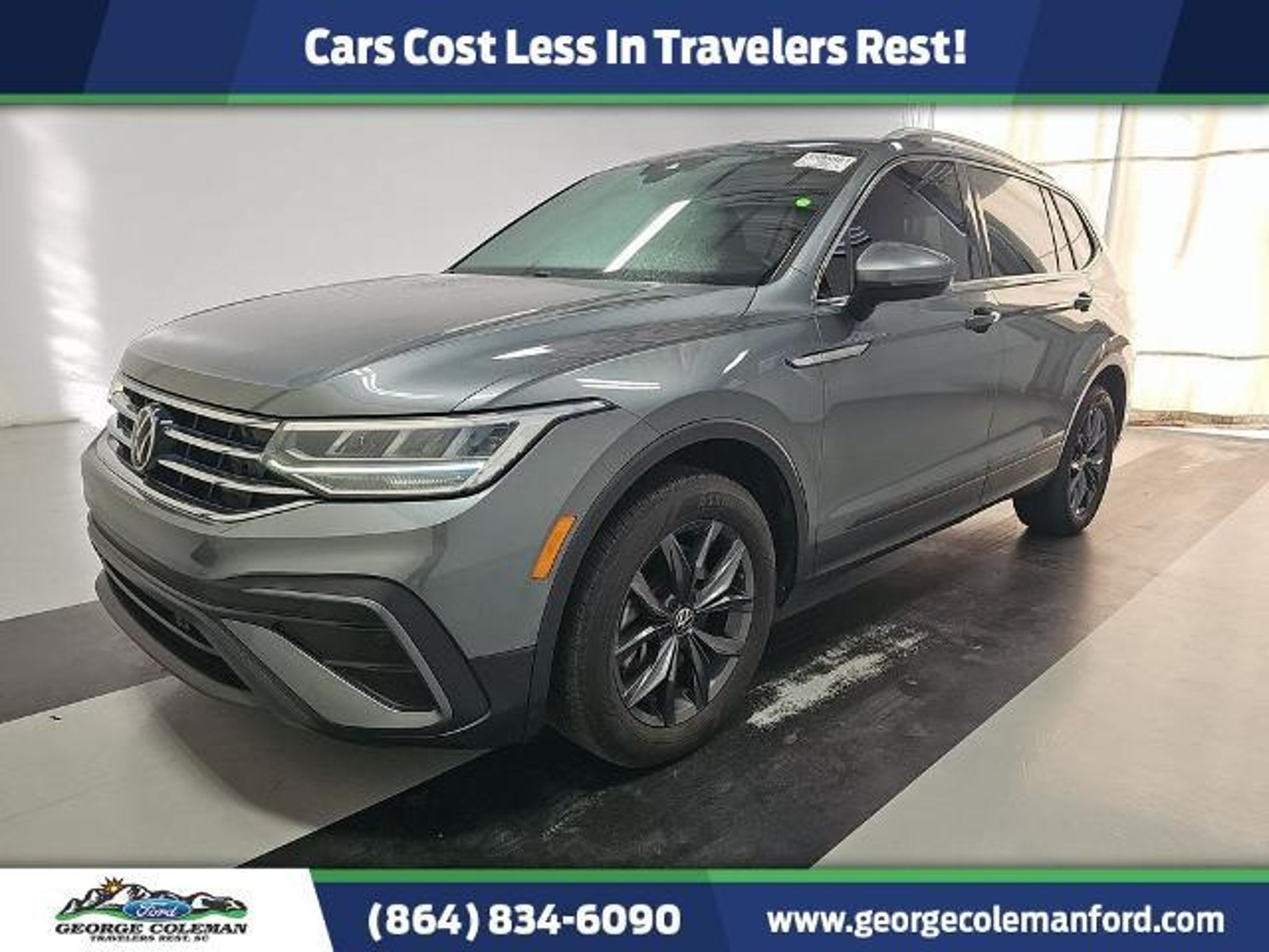 2023 Volkswagen Tiguan 2.0T SE Tiguan 2.0T SE, 4D Sport Utility, 2.0L TSI DOHC, 8-Speed Automatic with Tiptronic, FWD, Platinum Gray Metallic, Titan Black Premium Synthetic, 3rd row seats: bench, Alloy wheels, AM/FM radio: SiriusXM with 360L, Automatic temperature control, Backup Camera, Credit - Power Rear Liftgate Removed, Front Bucket Seats, Front dual zone A/C, Fully automatic headlights, Heated Front Comfort Seats, Panoramic Sunroof Package, Power driver seat, Power Liftgate, Power windows, Rear window defroster, Remote keyless entry, Steering wheel mounted audio controls. CARFAX One-Owner. 2.0T SE 23/30 City/Highway MPG Certification Program Details: Ford Blue Advantage: Blue Certified * 139 Point Inspection * Transferable Warranty * Vehicle History * Warranty Deductible: $100 * Roadside Assistance * Limited Warranty: 3 Month/4,000 Mile (whichever comes first) after new car warranty expires or from certified purchase date * and 11,000 FordPass Rewards Points to use toward first maintenance visit *Cars Cost Less In Travelers Rest!! **Have A FREE VEHICLE HISTORY REPORT sent directly to your email upon request or view IMMEDIATELY at our home website www.georgecolemanford.com ** Come by soon to drive this vehicle or EMAIL SMOSTELLER@COLEMANFORD.NET for more information!! George Coleman Ford has been operating continuously in our present location since 1930!