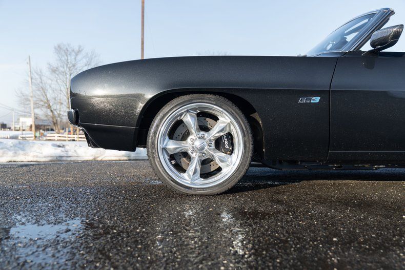 This RS/SS Convertible maintains its iconic 1969 presence while incorporating modern enhancements. The RS/SS front grille pairs with a custom Stingray hood to create an aggressive yet refined profile. LS3 badging subtly hints at the performance within. Carbon fiber mirrors and door handles add contemporary contrast, while LED billet taillights modernize the rear appearance. The electric-powered convertible top provides effortless open-air cruising. Riding on American Racing wheels and equipped with Wilwood 6-piston disc brakes, this Camaro balances classic muscle aesthetics with serious stopping power. A Ridetech fuel cap and convertible cover complete the detailed exterior package.