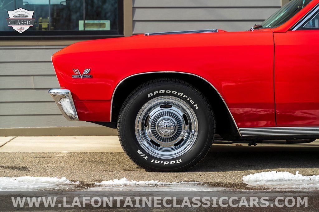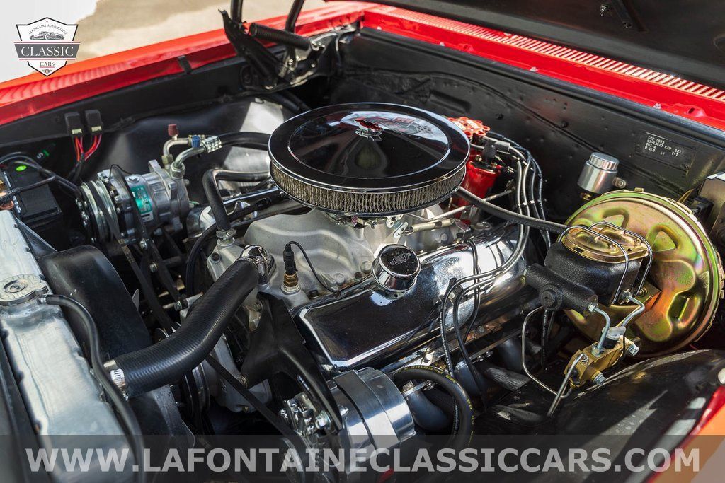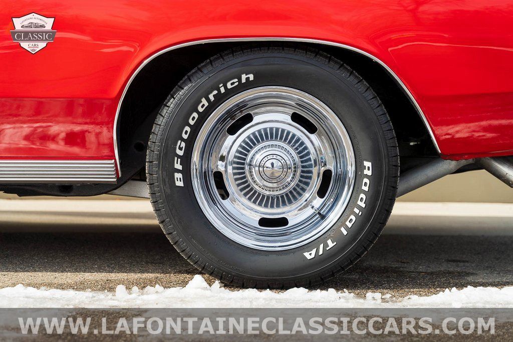 This Chevelle is refinished in a striking Red over black interior giving the car a bold and aggressive presence while retaining its authentic "138" SS identity. The body features an SS hood and badging faux hood vents quad headlights chrome bumpers dual side mirrors electric windshield wipers quarter vent windows and bright exterior trim. It rides on chrome-finished 15-inch Rally wheels wrapped in 225/60 BFGoodrich Radial T/A tires maintaining a classic muscle stance.