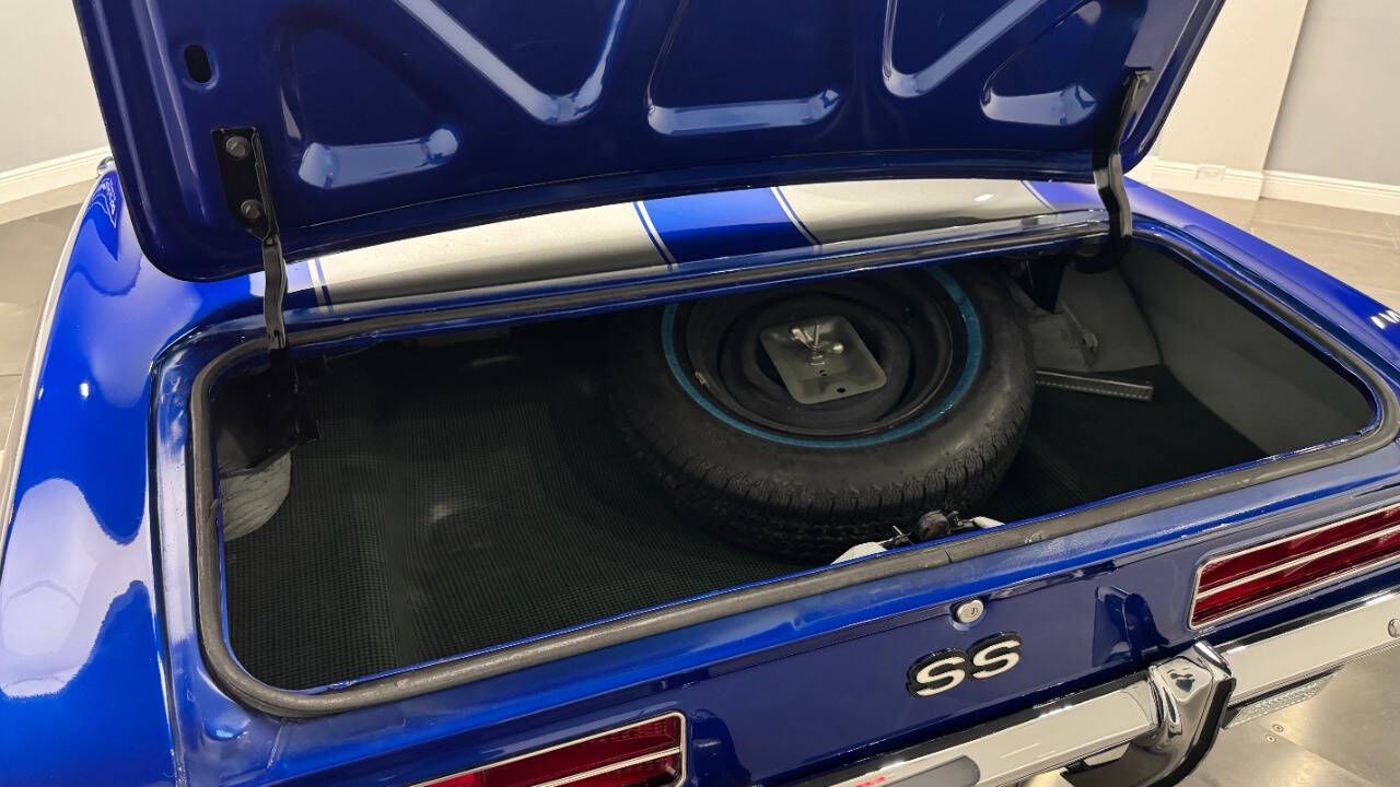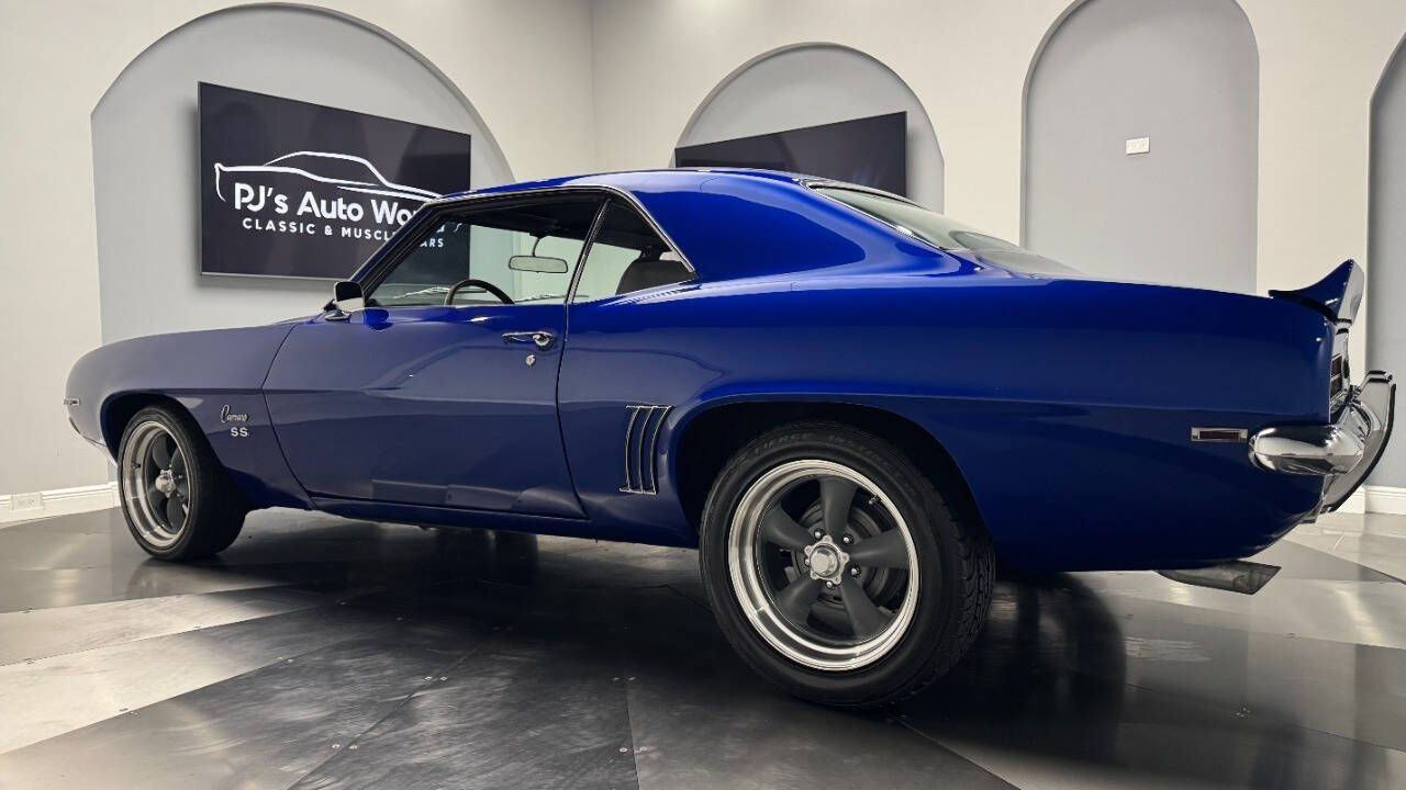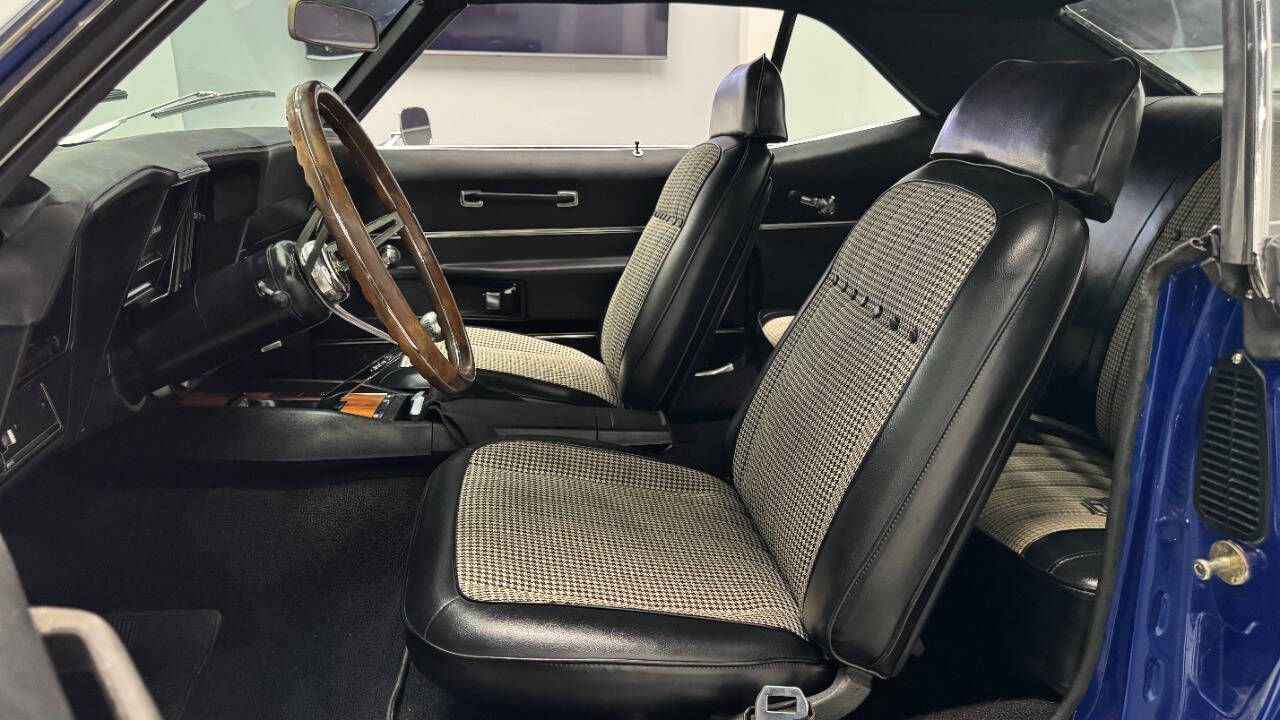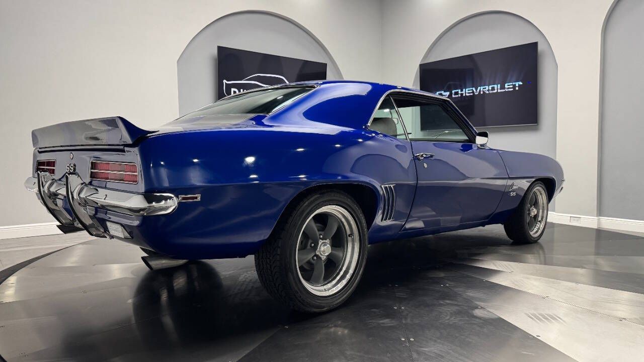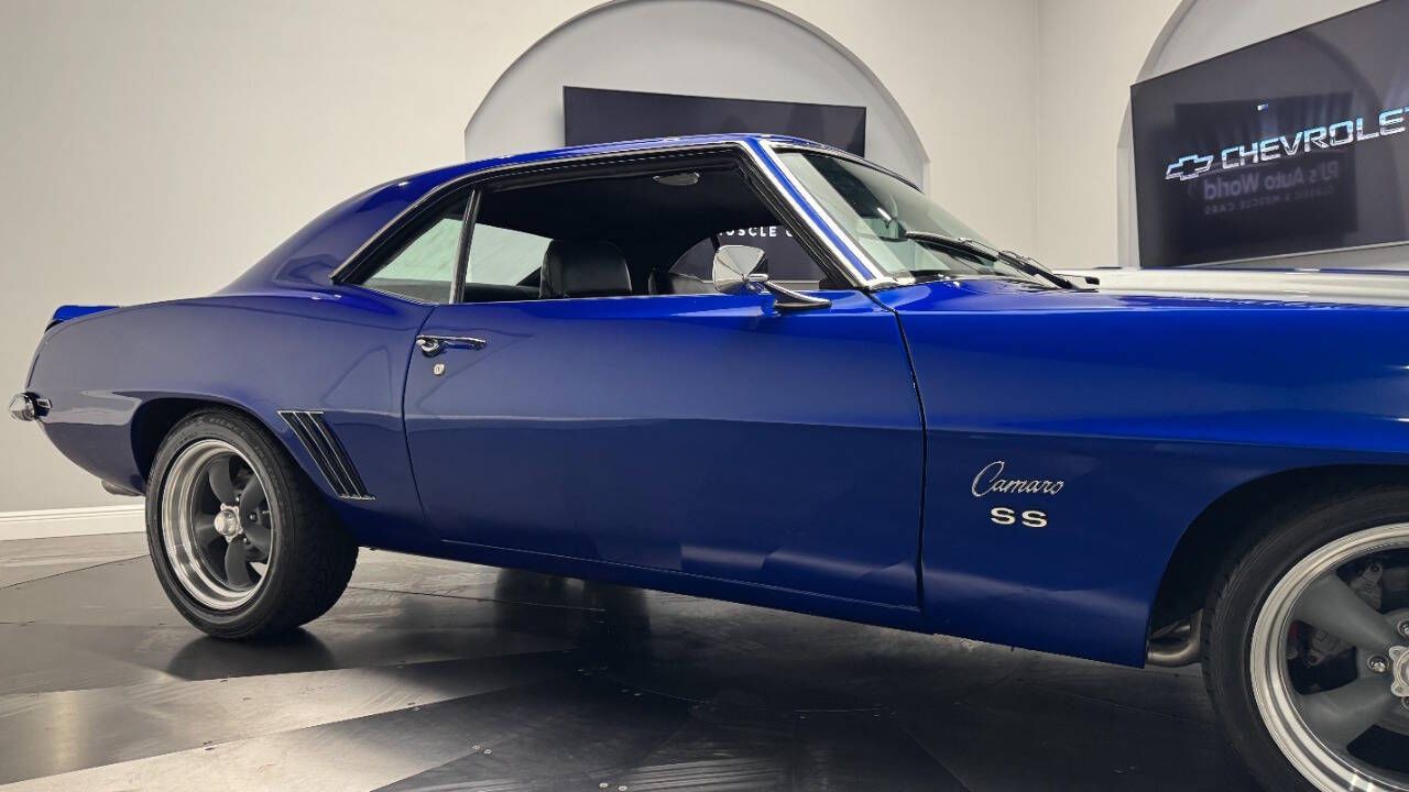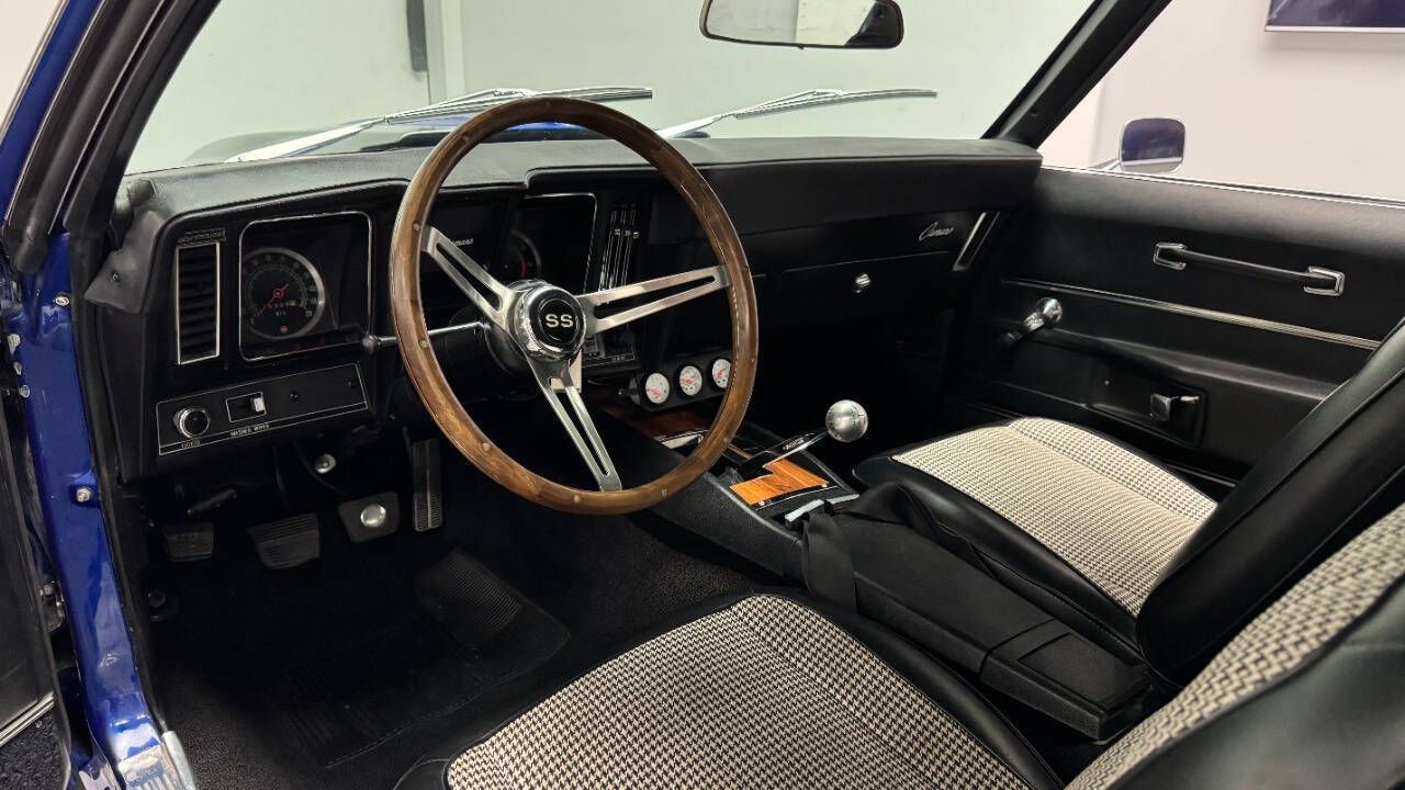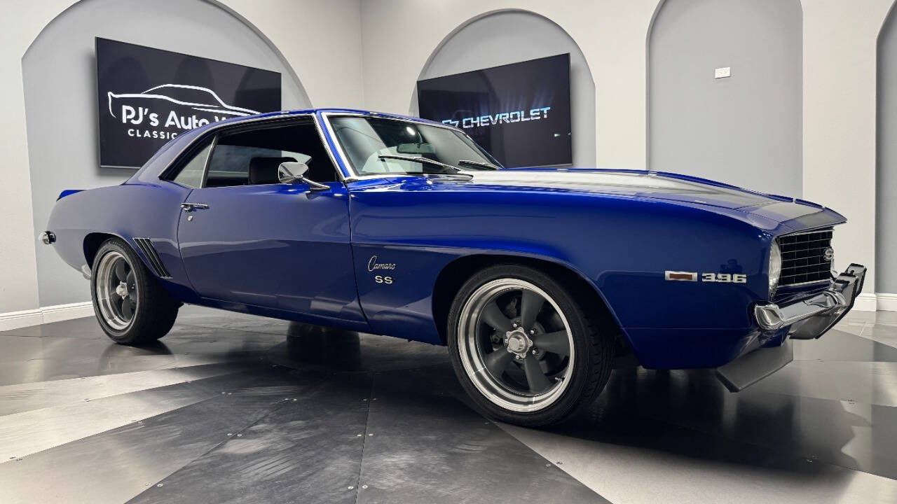 1969 Chevrolet Camaro For Sale. 454 stroked to 502 cubic inch V8 engine, Holley 750 cfm 4 barrel carburetor, aluminum intake, HEI electronic ignition, ceramic coated headers, dual exhaust, detailed engine bay, Tremec 5 speed manual transmission with overdrive, front power disc brakes, 17 American Racing Torque Thrust D wheels, refinished in Admiral Blue Metallic with Graphite Gray Metallic rally stripes, cowl hood, rear deck spoiler, RS tail lights, dual chrome mirrors, deluxe bucket seat interior with houndstooth inserts, 3 spoke wood steering wheel, in dash tachometer, auxiliary gauges, center console, AM/FM/Cassette radio. Storming the market almost 60 years ago, these early Camaros are still one of America's Favorite Cars! This AWESOME machine features a incredible color combination and powerful drivetrain. This well executed muscle car is ready to Show and Go! With over 45 years of dedicated service to the Collector Car Community, our team is eager to answer any questions you may have. Finance options available and worldwide shipping can easily be arranged. Interesting trade-ins will also be considered.
