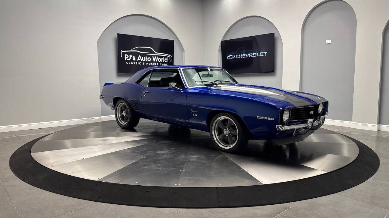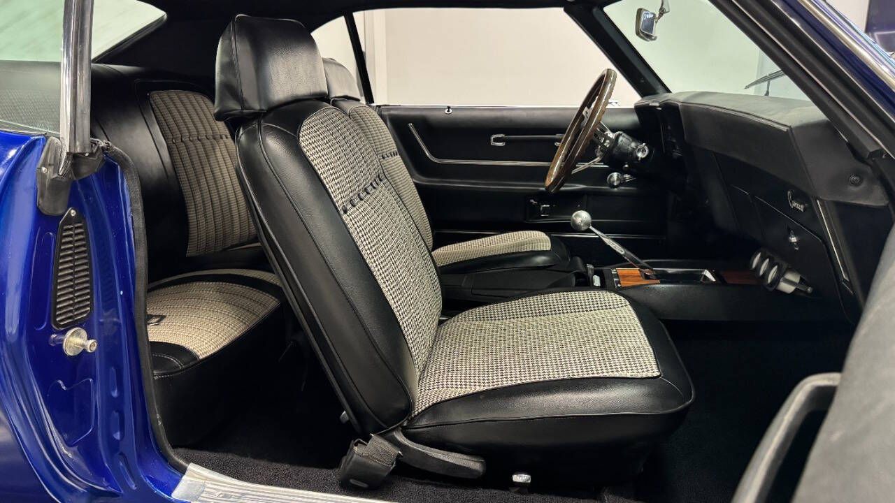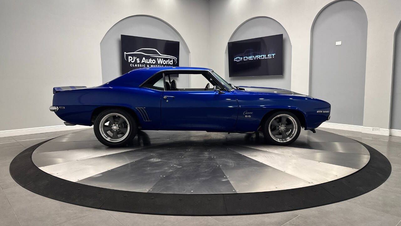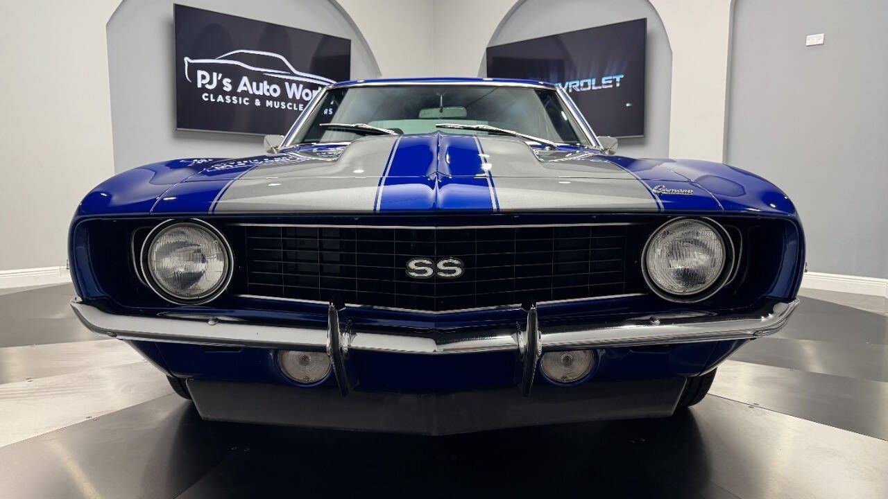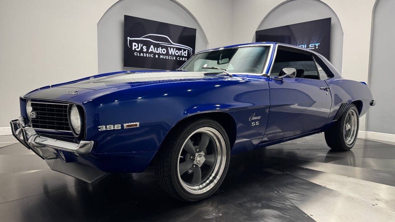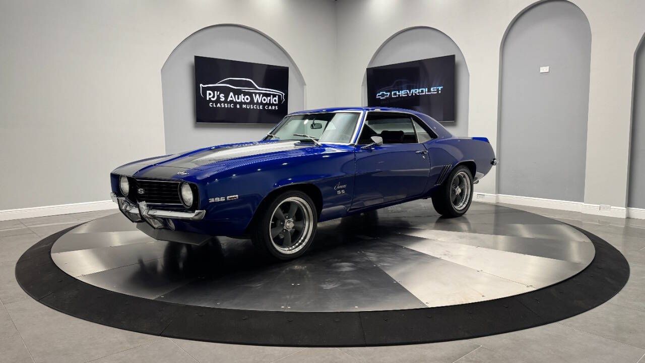 1969 Chevrolet Camaro For Sale. 454 stroked to 502 cubic inch V8 engine, Holley 750 cfm 4 barrel carburetor, aluminum intake, HEI electronic ignition, ceramic coated headers, dual exhaust, detailed engine bay, Tremec 5 speed manual transmission with overdrive, front power disc brakes, 17 American Racing Torque Thrust D wheels, refinished in Admiral Blue Metallic with Graphite Gray Metallic rally stripes, cowl hood, rear deck spoiler, RS tail lights, dual chrome mirrors, deluxe bucket seat interior with houndstooth inserts, 3 spoke wood steering wheel, in dash tachometer, auxiliary gauges, center console, AM/FM/Cassette radio. Storming the market almost 60 years ago, these early Camaros are still one of America's Favorite Cars! This AWESOME machine features a incredible color combination and powerful drivetrain. This well executed muscle car is ready to Show and Go! With over 45 years of dedicated service to the Collector Car Community, our team is eager to answer any questions you may have. Finance options available and worldwide shipping can easily be arranged. Interesting trade-ins will also be considered.