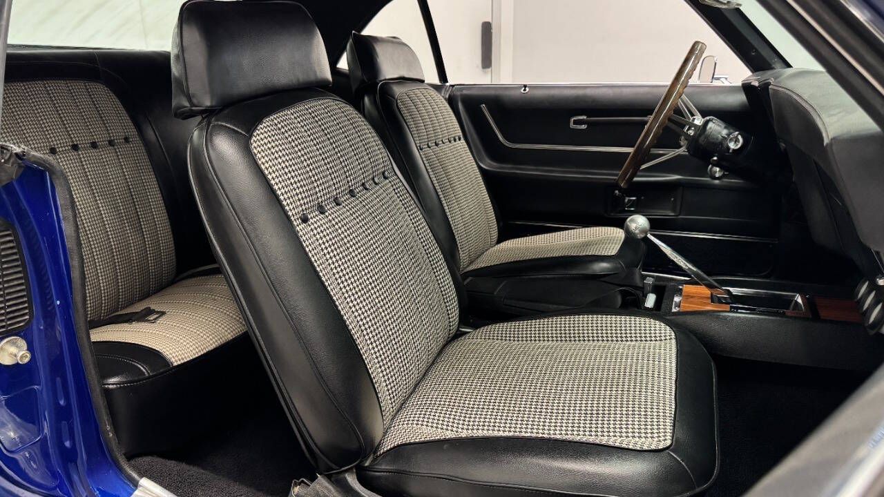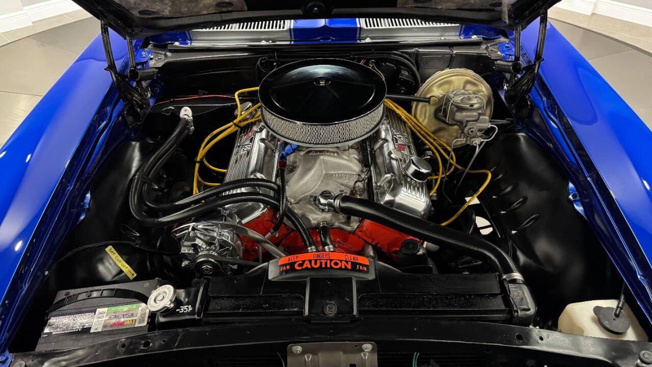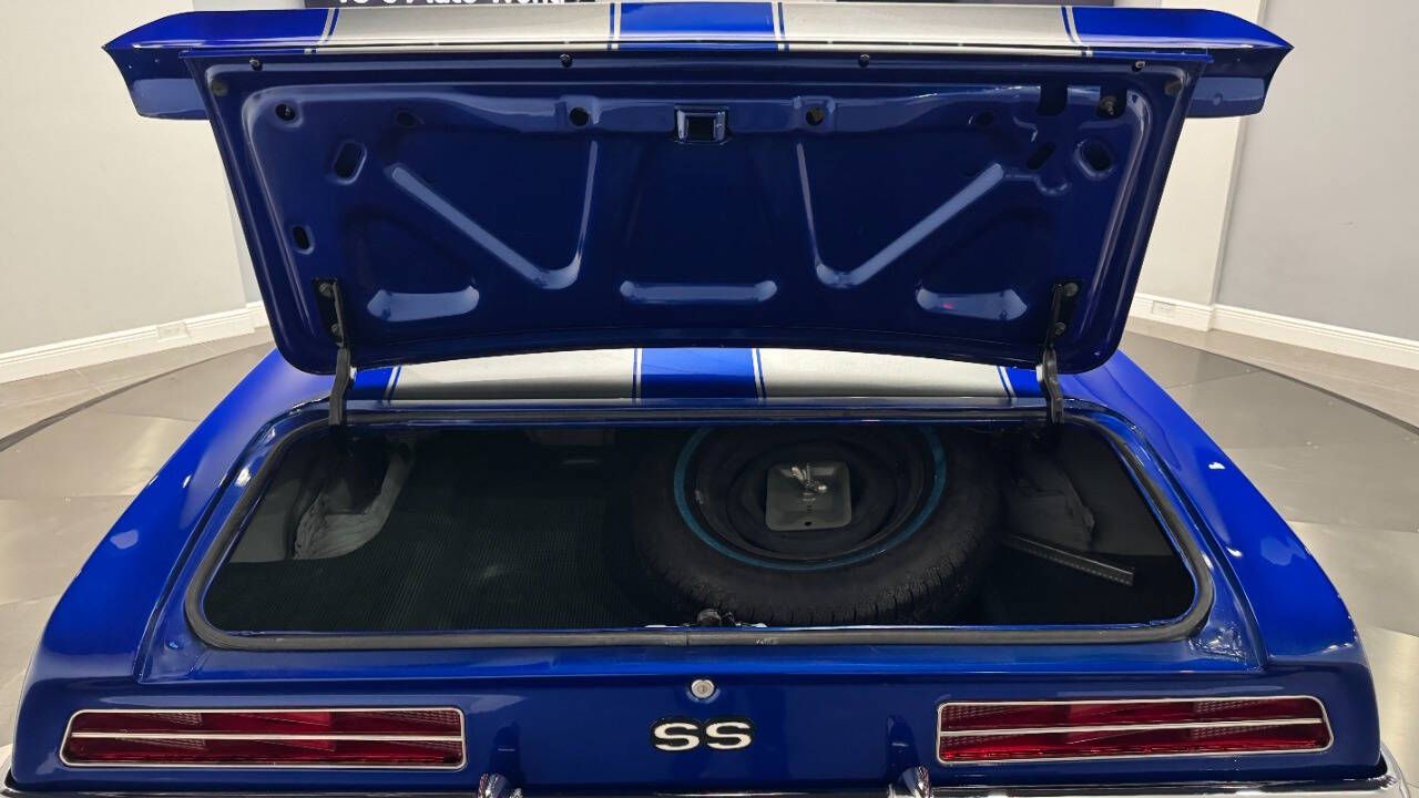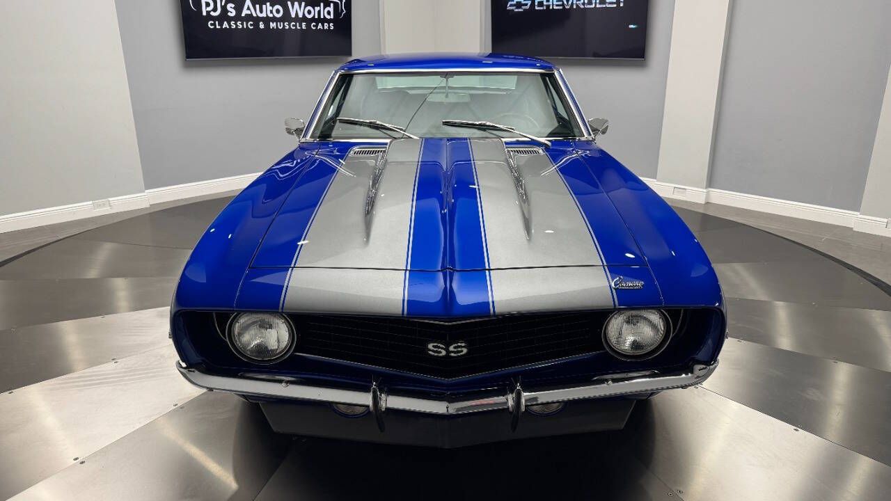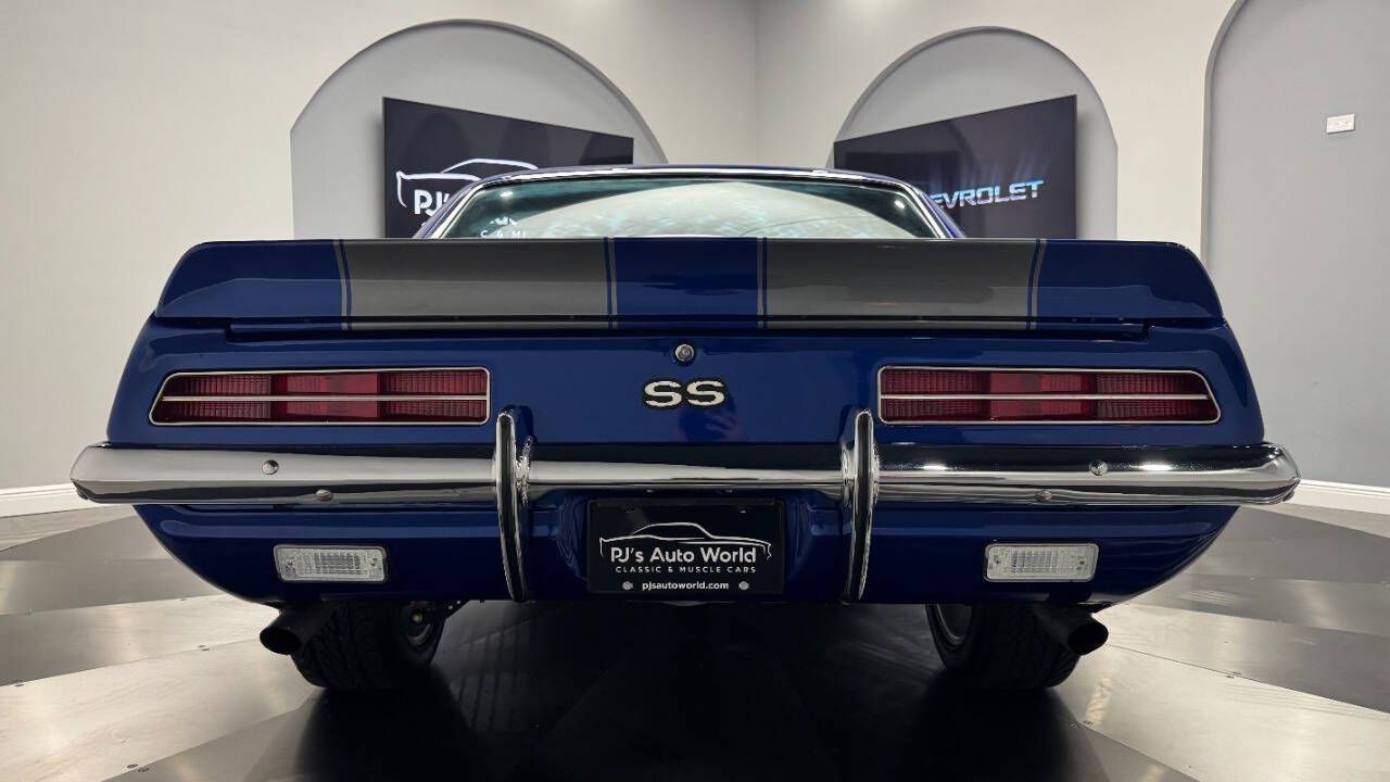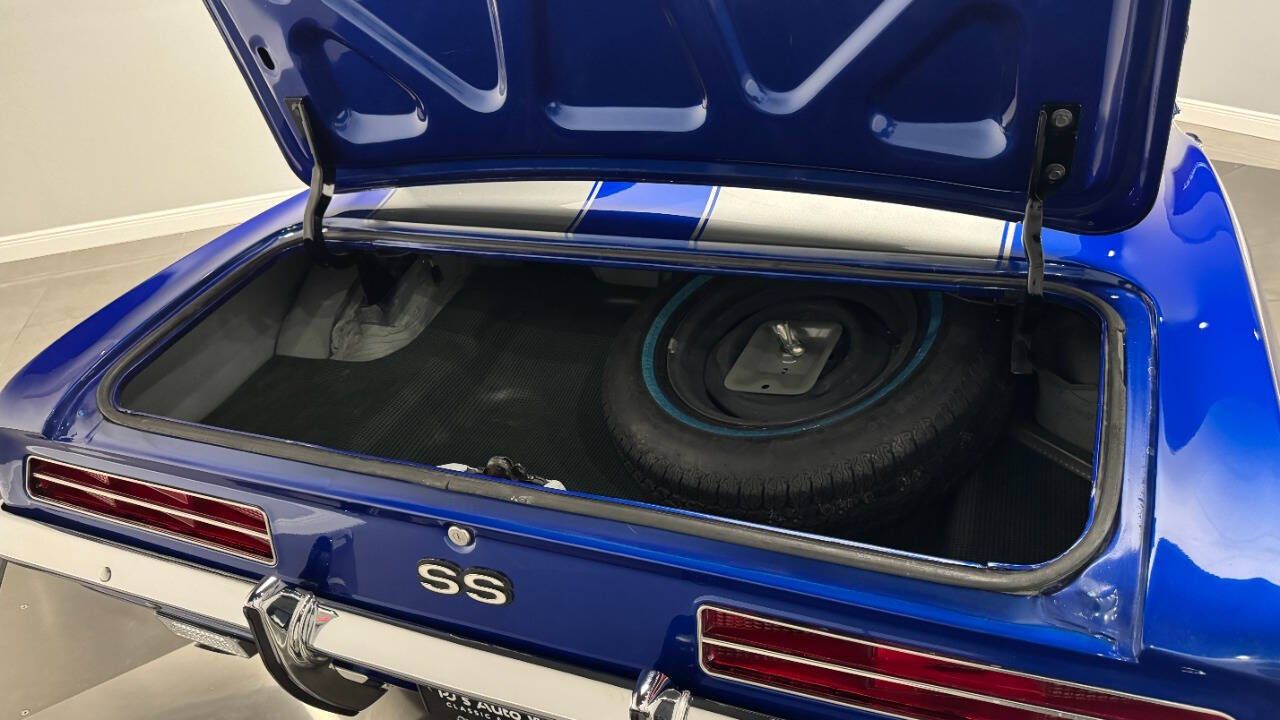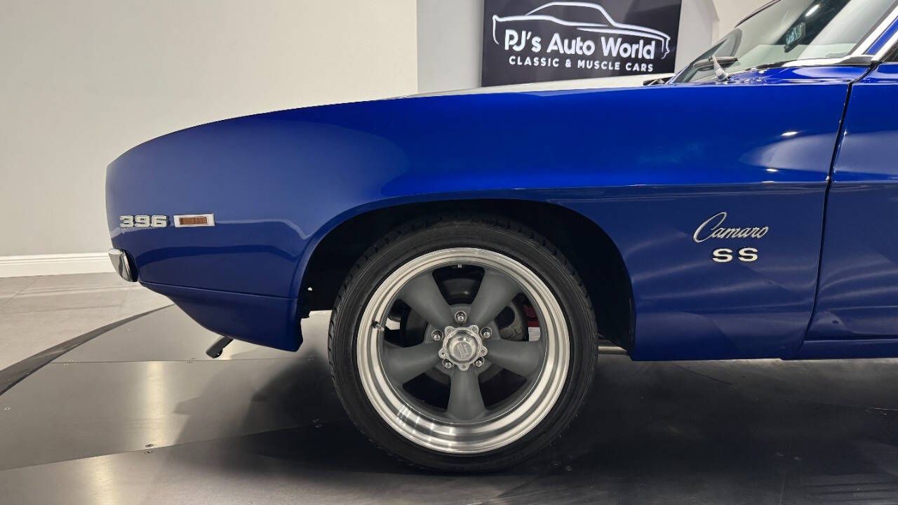 1969 Chevrolet Camaro For Sale. 454 stroked to 502 cubic inch V8 engine, Holley 750 cfm 4 barrel carburetor, aluminum intake, HEI electronic ignition, ceramic coated headers, dual exhaust, detailed engine bay, Tremec 5 speed manual transmission with overdrive, front power disc brakes, 17 American Racing Torque Thrust D wheels, refinished in Admiral Blue Metallic with Graphite Gray Metallic rally stripes, cowl hood, rear deck spoiler, RS tail lights, dual chrome mirrors, deluxe bucket seat interior with houndstooth inserts, 3 spoke wood steering wheel, in dash tachometer, auxiliary gauges, center console, AM/FM/Cassette radio. Storming the market almost 60 years ago, these early Camaros are still one of America's Favorite Cars! This AWESOME machine features a incredible color combination and powerful drivetrain. This well executed muscle car is ready to Show and Go! With over 45 years of dedicated service to the Collector Car Community, our team is eager to answer any questions you may have. Finance options available and worldwide shipping can easily be arranged. Interesting trade-ins will also be considered.