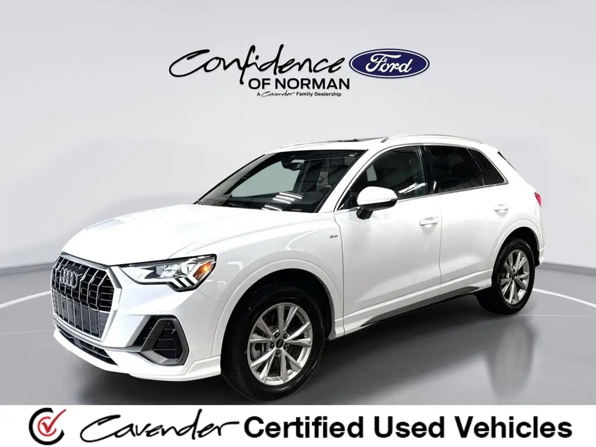 Welcome to Confidence Ford of Norman, a Cavender Auto Family dealership. This vehicle is located at 825 N Interstate Dr, Norman, OK 73069. Here at Cavender, we build relationships based on trust and integrity to exceed your expectations in your ownership experience. Quite simply, we strive to Make Confidence Happen! So stop by and allow us to serve your automotive needs we would love to meet you. Arkona White 2025 Audi Q3 Premium S Line quattro quattro 2.0L 4-Cylinder TFSI 8-Speed Automatic with Tiptronic Cavender Certified Pre-Owned Program Built-in Benefits: Limited Powertrain Warranty for your peace of mind. Coverage includes components for engine, transmission and axles (for specific component coverage, please speak with a dealer representative). 24/7 Roadside Assistance â?' No out-of-pocket costs for customers towed to our dealership (if located within 30 miles), lockout assistance, jump start, fuel and fluid delivery, flat tire changes, available 365 days/year, up to $100 maximum coverage per roadside incident. A Vehicle History Report is included with every Cavender Certified Pre-Owned vehicle to offer you Confidence knowing that the vehicle you are purchasing is right for you and the road ahead. (Limitation and exclusions apply. Please refer to your Limited Warranty Registration for full coverage information.) The Cavender Auto Family, proudly serving our communities since 1939, and we look forward to serving you! - Equipment: 10 Speakers, 4-Wheel Disc Brakes, ABS brakes, Air Conditioning, Alloy wheels, AM/FM radio, Audi smartphone interface (Apple CarPlay/Android Auto), Auto High-beam Headlights, Automatic temperature control, Brake assist, Bumpers: body-color, Delay-off headlights, Driver door bin, Driver vanity mirror, Dual front impact airbags, Dual front side impact airbags, Electronic Stability Control, Emergency communication system: Audi connect CARE, Exterior Parking Camera Rear, Four wheel independent suspension, Front anti-roll bar, Front Bucket Seats, Front Center Armrest, Front dual zone A/C, Front fog lights, Front reading lights, Fully automatic headlights, Heated door mirrors, Heated Front Bucket Seats, Heated front seats, Illuminated entry, Knee airbag, Leather Seating Surfaces, Leather Shift Knob, Leather steering wheel, Low tire pressure warning, Occupant sensing airbag, Outside temperature display, Overhead airbag, Overhead console, Panic alarm, Passenger door bin, Passenger vanity mirror, Power door mirrors, Power driver seat, Power Liftgate, Power moonroof: Panoramic, Power p
