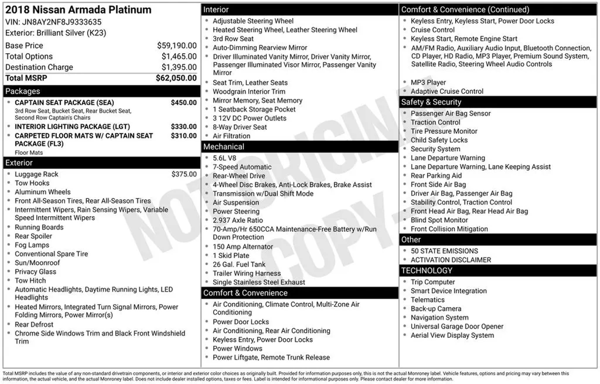 Elevate your driving experience with this stunning 2018 Nissan Armada Platinum. Boasting a powerful 5.6L V8 engine and rear-wheel drive, this full-size SUV is ready to conquer the road with confidence and style. - Bluetooth connectivity - Backup camera - Clean CARFAX history Indulge in the premium amenities that set this Armada apart, including: - Captain's chair seating package - Roof rail cross bars - Interior lighting package - Bose premium audio system Slip into the driver's seat and enjoy the unparalleled comfort of the heated and cooled front bucket seats, complete with driver's memory settings. The Platinum trim also features a panoramic moonroof, power liftgate, and Nissan's advanced safety technologies like Lane Departure Warning and Intelligent Cruise Control. With its spacious 8-passenger cabin and generous cargo capacity, this Armada is the perfect companion for your family adventures. The split-folding third-row seats and second-row captain's chairs offer versatile seating configurations to accommodate all your needs. Elevate your daily commute and weekend excursions with the refined driving dynamics and premium amenities of this 2018 Nissan Armada Platinum. Experience the difference that Nissan's legendary craftsmanship and attention to detail can make in your life. All of our vehicles come standard with a professional inspection by certified technicians and most vehicles qualify for our LIFETIME WARRANTY! We also price our vehicles very aggressive to make sure we have fresh inventory for you. Our vehicles typically sell within 20-30 days upon stocked in so if you see something you like give us a call ASAP. Always ask if you qualify for our $1,500 trade in voucher!