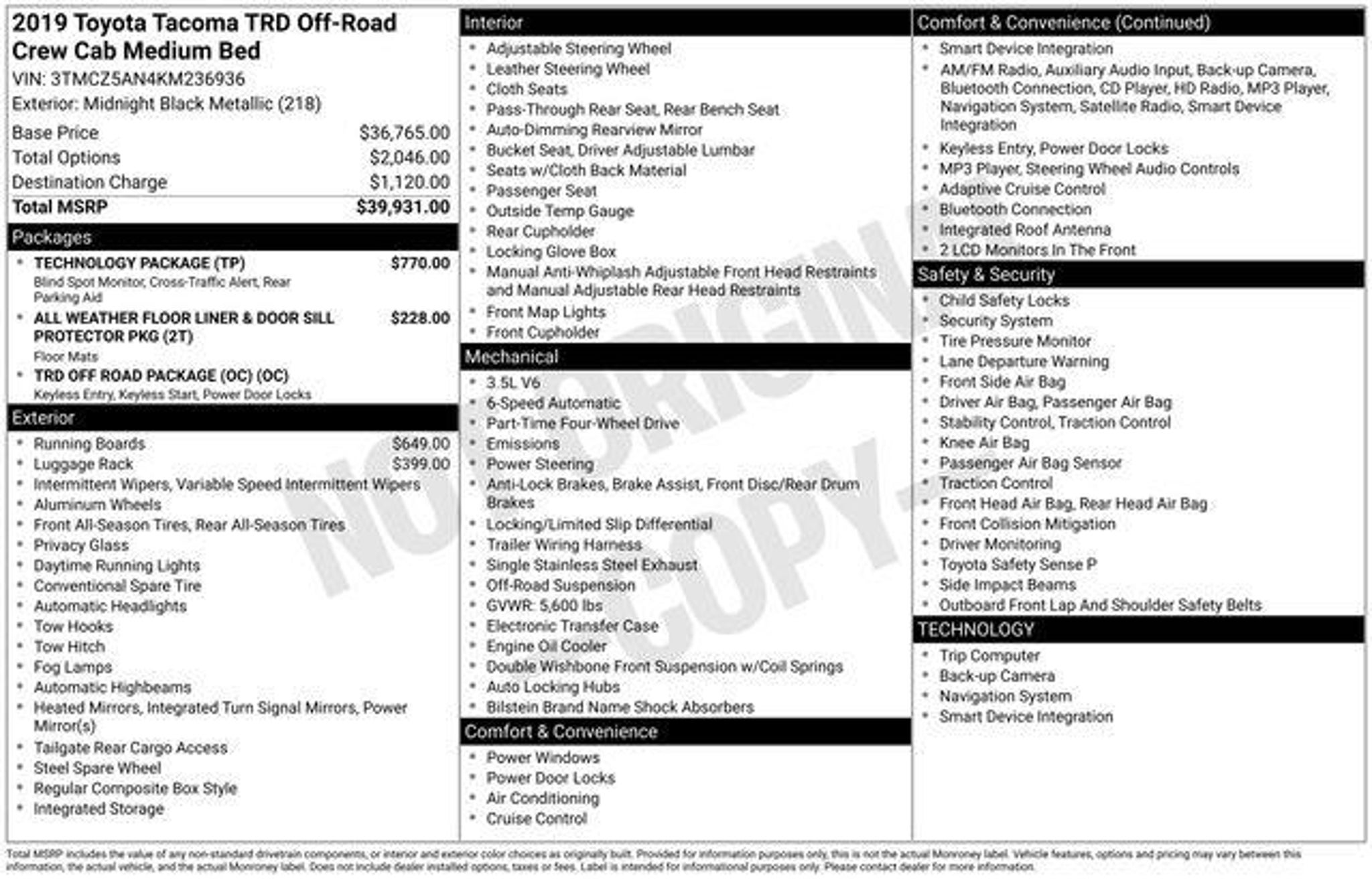 Discover the ultimate off-road companion in this 2019 Toyota Tacoma TRD Off-Road V6. Boasting a powerful 3.5L V6 engine, 4-wheel drive, and a host of advanced features, this Tacoma is ready to take on any adventure you can imagine. - TECHNOLOGY PACKAGE: Includes Color Keyed Rear Bumper, Rear Parking Assist Sonar, Blind Spot Monitor w/Rear Cross Traffic Alert - PREDATOR TUBE STEPS - ROOF RACK - ALL WEATHER FLOOR LINER & DOOR SILL PROTECTOR PKG: Includes Door Sill Protectors - Blackout Package (DISC) - Technology Package - Remote keyless entry - Traction control - ABS brakes - Low tire pressure warning - Color Keyed Rear Bumper - Brake assist - Electronic Stability Control - Exterior Parking Camera Rear - Auto High-beam Headlights - Front fog lights - LED Daytime Running Lamps This Tacoma is more than just a rugged workhorse â it's a versatile companion that can handle everything from your daily commute to your next off-road adventure. With its spacious interior, advanced technology features, and impressive capability, this Tacoma is the perfect blend of utility and comfort. Slip behind the wheel and experience the power of the 3.5L V6 engine, delivering an exhilarating 278 horsepower. The 6-speed transmission and 4-wheel drive system ensure you have the control and traction you need, whether you're navigating city streets or tackling challenging terrain. The Tacoma's impressive list of standard features includes a premium audio system, dual-zone climate control, and a rearview camera to make every drive more convenient and enjoyable. The available Technology Package adds even more advanced safety and convenience features, including a Blind Spot Monitor with Rear Cross-Traffic Alert and Rear Parking Assist Sonar. Designed to handle the demands of your active lifestyle, this 2019 Toyota Tacoma TRD Off-Road V6 is the perfect companion for your next adventure. With its rugged good looks, impressive capabilities, and wealth of premium features, this Tacoma is sure to impress. Visit our showroom today and experience the power and versatility of this exceptional off-road-ready truck.