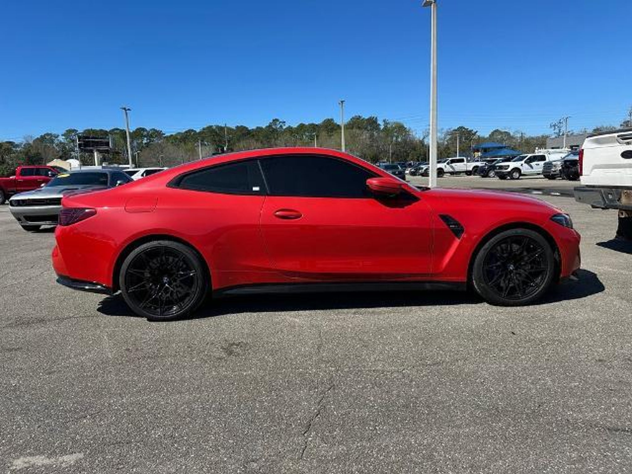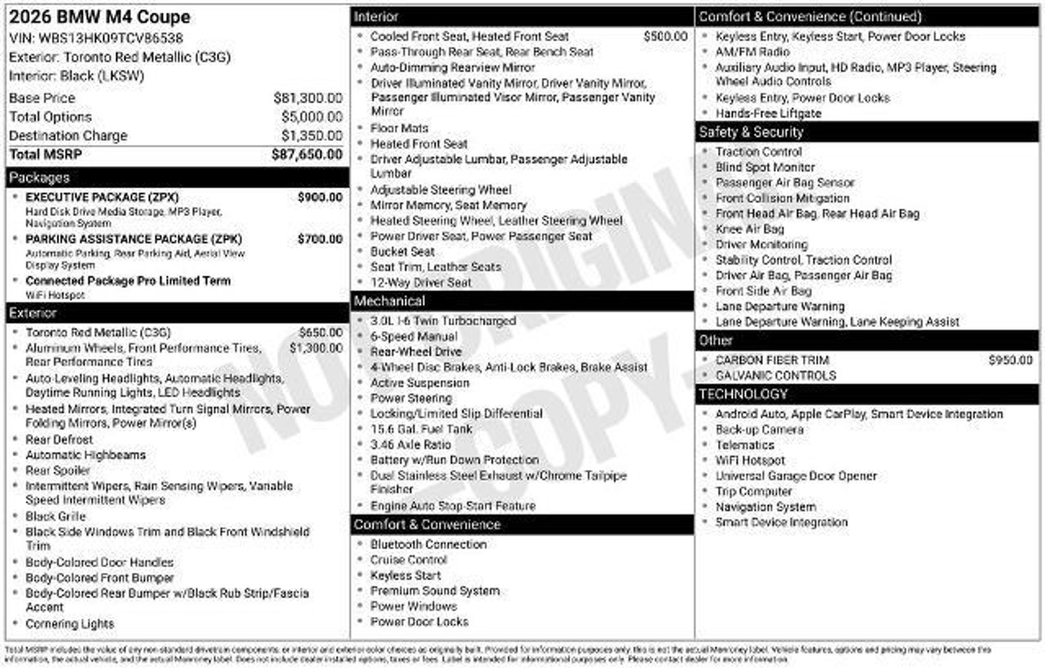 Experience the thrill of pure performance in the 2026 BMW M4 Base. This stunning sports coupe is a masterpiece of engineering, designed to deliver an exhilarating driving experience that will leave you craving more. - Carbon Fiber Trim - Executive Package - Parking Assistance Package - Navigation System, Galvanic Controls, Live Cockpit Pro with Navigation, Wheels: 19 x 9.5 Front/20 x 10.5 Rear Forged Black Powered by a potent 3.0L I6 Turbocharged DOHC 24V engine that produces an impressive 473 horsepower, the M4 Base delivers blistering acceleration and uncompromising handling. The 6-speed manual transmission and rear-wheel-drive configuration provide an unparalleled connection between driver and machine, allowing you to harness the full potential of this exceptional vehicle. Beyond its thrilling performance, the M4 Base is also a technological marvel, boasting a wealth of advanced features designed to enhance your driving experience. The Executive Package includes the cutting-edge Live Cockpit Pro with Navigation, providing you with seamless connectivity and intuitive controls. The Parking Assistance Package, with its Parking View and 3D View (Surround View) features, makes navigating even the tightest spaces a breeze. Complementing the M4 Base's dynamic capabilities is its striking exterior. The Toronto Red Metallic paint finish and bold, sculpted body lines create a captivating presence that commands attention wherever you go. The 19-inch front and 20-inch rear forged black wheels, wrapped in high-performance tires, further accentuate the vehicle's aggressive stance and performance-oriented design. Step inside the M4 Base, and you'll be greeted by a cabin that exudes premium quality and attention to detail. The front ventilated seats, coupled with the heated steering wheel, ensure your comfort, even during the most spirited drives. The Harman/Kardon Surround Sound System provides an immersive audio experience, while the intuitive controls and high-resolution displays keep you connected and in control. This 2026 BMW M4 Base is a true driver's machine, blending exhilarating performance, cutting-edge technology, and refined craftsmanship. Experience the thrill of ownership and visit our showroom today to take this exceptional sports coupe for a test drive. The listed online price reflects a $1,000 finance incentive and a $1,000 qualifying retail trade-in incentive; absence of either or both incentives will result in an increase of up to $2,000 to the final sale price.