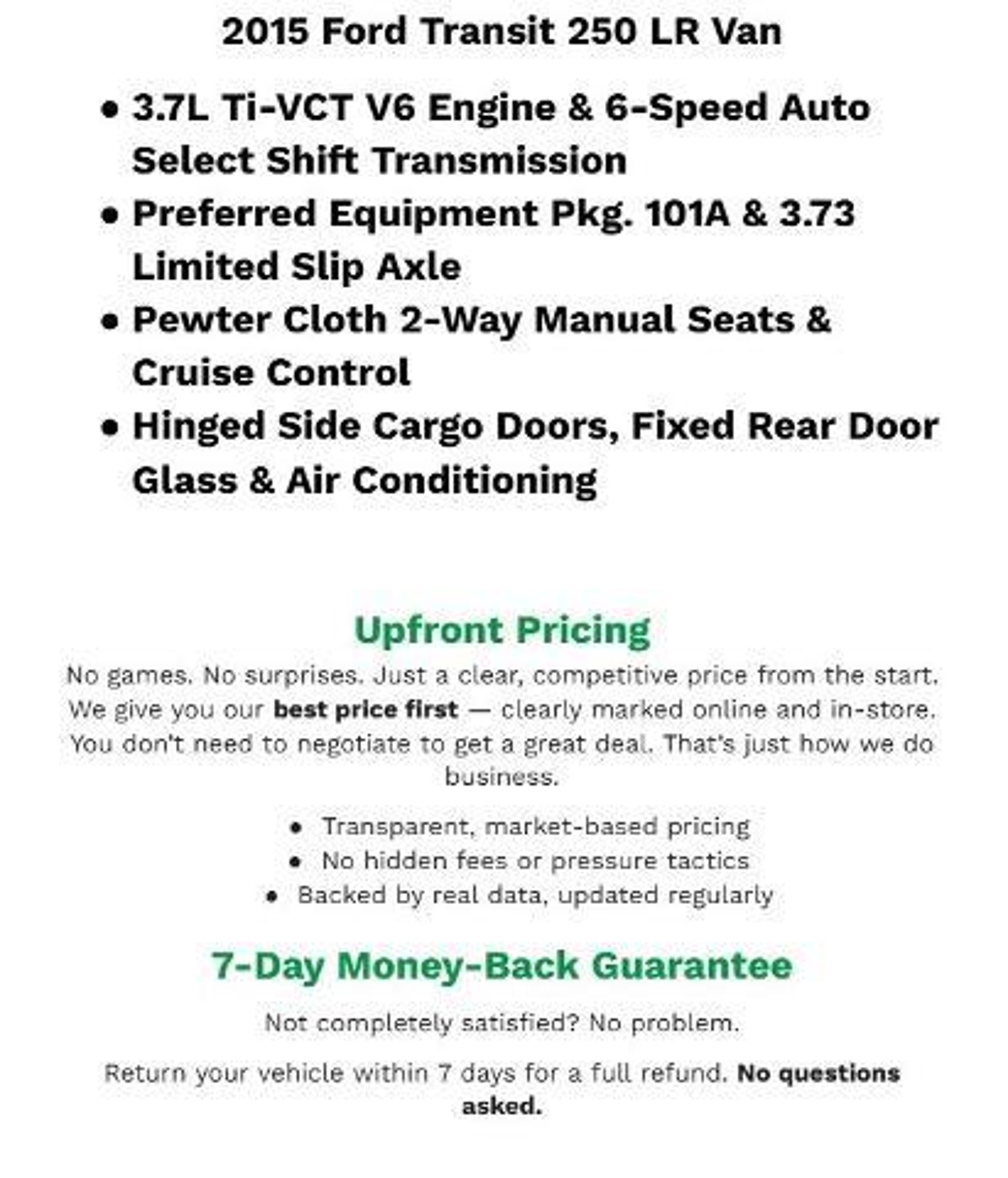 Recent Arrival! 2015 Ford Transit-250 Base Clean CARFAX. Oxford White RWD 3.7L V6 Ti-VCT 24VBergstrom Ford of Oshkosh wants to buy your vehicle - even if you don't buy ours. Get your free and quick offer to purchase. To get our top dollar offer, call our Bergstrom Buying Team Hotline at 920-429-6222 Order Code 101A, AutoLamp with Rain-Sensing Wipers (Rain-Sensing Wipers), Exterior Upgrade Package (Wheels: 16 Steel w/Full Silver Cover), Heavy-Duty Trailer Tow Package (Frame-Mounted Hitch Receiver), Radio Prep Package, Smoker's Package, LED Load Compartment Lighting Package, Interior Upgrade Package (Vinyl, Front and Rear, Vinyl Sun Visors, I/P Console Mats, Leather-Wrapped Steering Wheel, Radio: AM/FM Stereo w/6-Speakers, 6-Speakers, SYNC Communications & Entertainment System, Driver & Front Passenger Side Airbags, Curtain Airbag, Dual Bucket Seats w/Dr-Side Manual Lumbar (21L), and Cruise Control w/Message Center), Load Area Protection Package (Full Height), Premium Package (10-Way Power Dual Bucket Seats), CNG/Propane Gaseous Engine Prep Package, Fixed Rear Cargo Door Glass, Engine Block Heater, Heavy Duty Alternator w/Gas Engines, Heavy Duty Alternator w/Diesel Engines, Dual Heavy-Duty Batteries, Manual Regen Initiation, Manual Regen Initiation w/Active Regen Inhibitor, Front License Plate Bracket, Heated Power Mirrors w/Turn Signals & Short Arm, Power Mirrors w/Long-Arm, Heated Power Mirrors w/Turn Signals & Long Arm, Running Board, Power door mirrors, Fixed Passenger Side & Rear Cargo Door Glass, All-Around Fixed Window Glass, All-Around Windows/2nd Row Dr Side Flip-Open Glass, Privacy Glass, Complete Headliner (DISC), Rear Vinyl Floor Covering Delete, Front Carpet, Lane Keeping Alert w/Driver Alert, Reverse Sensing System, Modified Vehicle Wiring System, User Defined Upfitter Switches (4), Front Row All-Weather Floor Mats, Rear 12V Power Point, Ford Telematics Powered by Telogis, Polypropylene Panels, Illuminated entry, Telescoping steering wheel, Driver door bin, Tilt steering wheel, Tachometer, Front reading lights, Driver Controlled Front/Rear Aux A/C & Heater, Rear Window Defogger, Auxiliary Heater & A/C Prep Pkg w/o Rear Controls, Aux. Heater & A/C Prep Pkg w/Rear Ctrls (DISC), Air Conditioning, Remote Start, 12V to 110V Power Inverter, Power windows, Power steering, Remote keyless entry, Radio: AM/FM Stereo w/MyFord Touch/Navi, AM/FM Stereo, Radio: AM/FM Single-CD Stereo, Radio: AM/FM Single-CD Stereo w/HD & SiriusXM, Radio: AM/FM Single-CD Stereo w/6-Speakers, AM/FM radio, 2 Speake