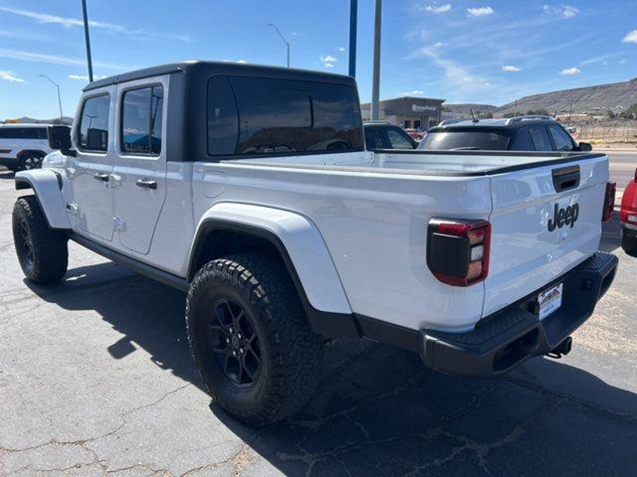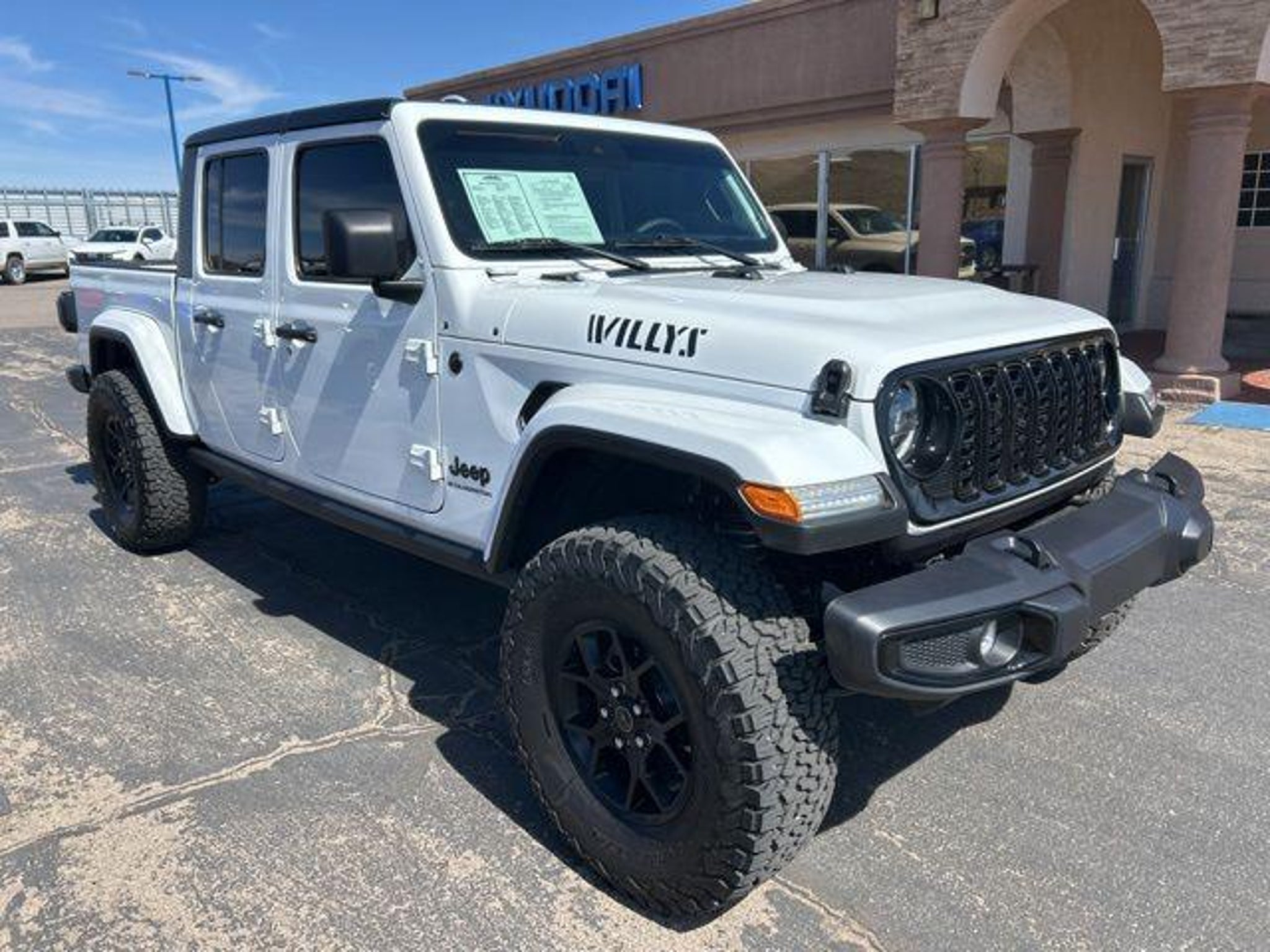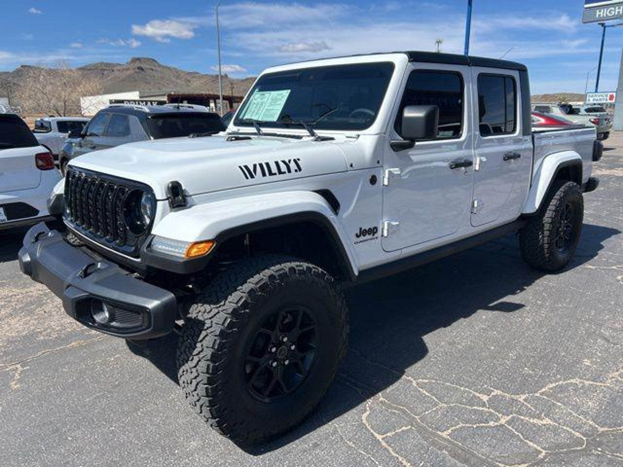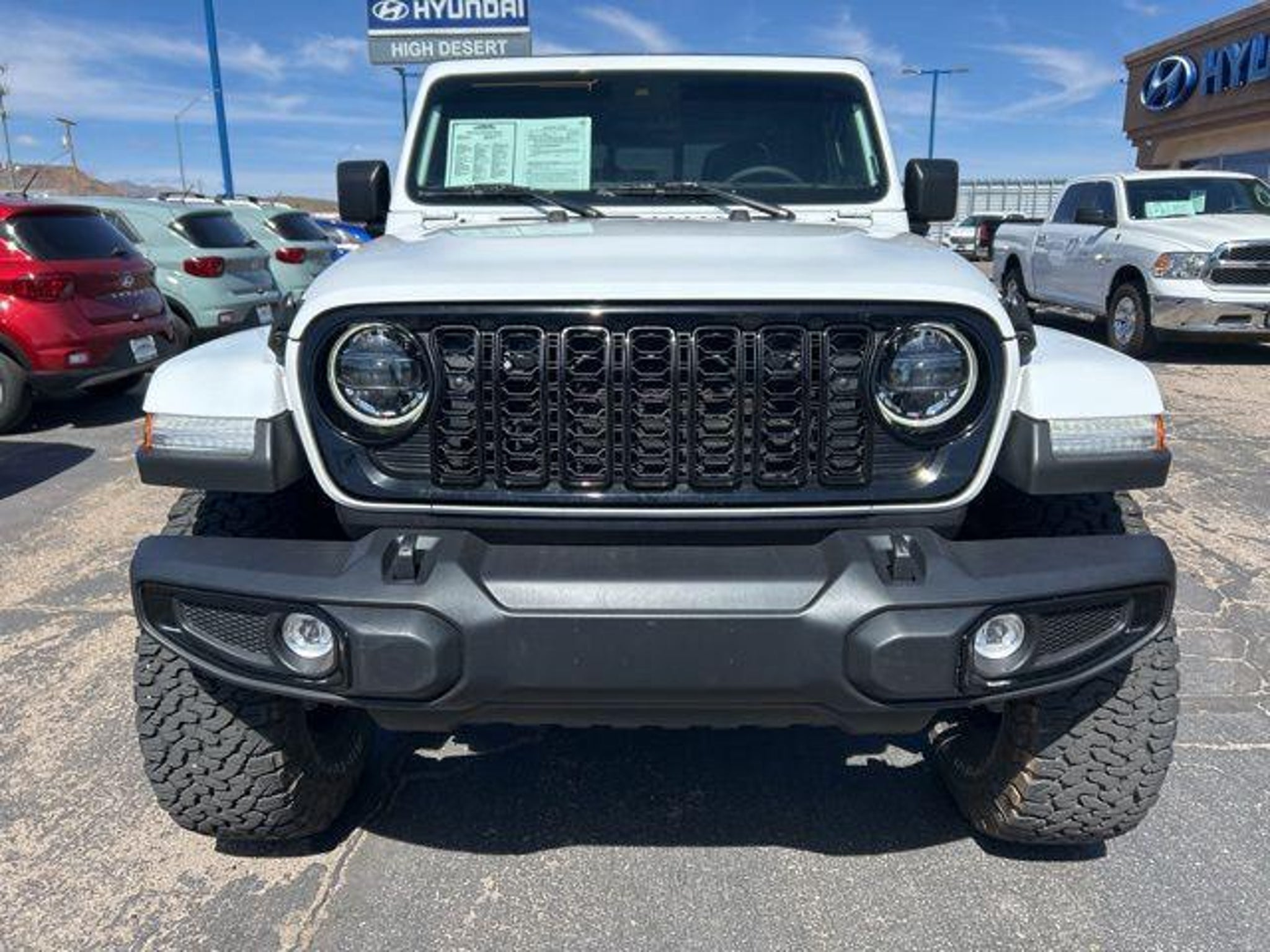 3.6L V6 24V VVT Bright White Clearcoat 2024 Jeep Gladiator Willys 4WD At High Desert Hyundai, we pride ourselves on offering a stellar automotive experience for drivers in Kingman, Henderson NV, and Prescott AZ. Our dedicated team of sales advisors, service technicians, and financing experts are here to address all your needs with the utmost respect, care, and attention to detail. Whether you're interested in the sleek Hyundai Santa Fe Sport, the stylish Sonata, the efficient Elantra, the versatile Tucson, or the compact Accent, our knowledgeable team will guide you through all the features and benefits of each model. If you're in the market for a reliable used car, our team is ready to help you explore our extensive inventory of pre-owned vehicles. Each car undergoes a thorough inspection to ensure it meets our high standards of quality and reliability. Our auto finance team is here to provide personalized solutions that fit your individual needs. Whether you're looking to lease a new Hyundai or finance a pre-owned vehicle, we offer a range of options to make the process stress-free. Start with our online appraisal form and credit application to get a head start. Our commitment to excellence doesn't end with the sale. Our onsite auto service and repair department is staffed with skilled technicians who use cutting-edge tools and technologies to keep your vehicle running smoothly. For those who prefer to perform their own maintenance, we offer a vast collection of authentic Hyundai parts and accessories. High Desert Hyundai has all your automotive needs covered. Whether you're stopping by for a test drive or need an oil change, our team is ready to assist you. Visit us at 4180 N Stockton Hill Rd, Kingman, Arizona, or contact us today to learn more about our services and inventory. This 2024 Jeep Gladiator is equipped with the following options: Quick Order Package 24W Willys (240 Amp Alternator, 4-Wheel Drive Decal, 97 MPH Vehicle Max Speed Calibration, Advanced Brake Assist, Air Conditioning w/Auto Temperature Control, Automatic Headlamps, Auxiliary Switches, Black Grille, Body Color Fender Flares (2-Piece), Class IV Receiver Hitch, Cluster 7.0 TFT Color Display, Daytime Running Lamps LED Accents, Deep Tint Sunscreen Windows, E-Locker Rear Axle, Enhanced Adaptive Cruise Control, Front 1-Touch Down Power Windows, Front Door Locks 2-Door Passive Entry, Front Heavy Duty Red Accent Shock Absorbers, Front LED Fog Lamps, Full Speed Forward Collision Warning Plus, Heavy-Duty Engine Cooling, LED Premium Reflector Headlamps, LED Taillamps, Mold In Color Bumper w/Gloss Black, MOPAR All-Weather Slush Mats, Off-Road Plus Mode, Power Heated Mirrors, Power Tailgate Lock, Premium Wrapped Steering Wheel, Protection Sill Rails, Rear Heavy Duty Red Accent Shock Absorbers, Remote Keyless Entry, Security Alarm, Speed Sensitive Power Locks, Sun Visors w/Illuminated Vanity Mirrors, Trailer Hitch Zoom, Wheels: 17 x 7.5 Painted Black, Willy's Suspension, and Willys Hood Decal), 110 MPH Vehicle Max Speed Calibration, 12.3 Touchscreen Display, 3.73 Rear Axle Ratio, 4-Wheel Disc Brakes, 4G LTE Wi-Fi Hot Spot, 8 Speakers, ABS brakes, Air Conditioning, Alexa Built-In, AM/FM radio: SiriusXM with 360L, Apple CarPlay, Apple CarPlay/Android Auto, Black 3-Piece Hard Top, Brake assist, Cloth Low-Back Bucket Seats, Compass, Connectivity - US/Canada, Delay-off headlights, Disassociated Touchscreen Display, Driver door bin, Driver vanity mirror, Dual front impact airbags, Dual front side impact airbags, Electronic Stability Control, Emergency communication system: Jeep Connect, Freedom Panel Storage Bag, Front anti-roll bar, Front Bucket Seats, Front Center Armrest w/Storage, Front fog lights, Front reading lights, Google Android Auto, Integrated Center Stack Radio, Integrated roll-over protection, Low tire pressure warning, Normal Duty Suspension, Occupant sensing airbag, Outside temperature display, Overhead airbag, ParkView Rear Back-Up Camera, Passenge