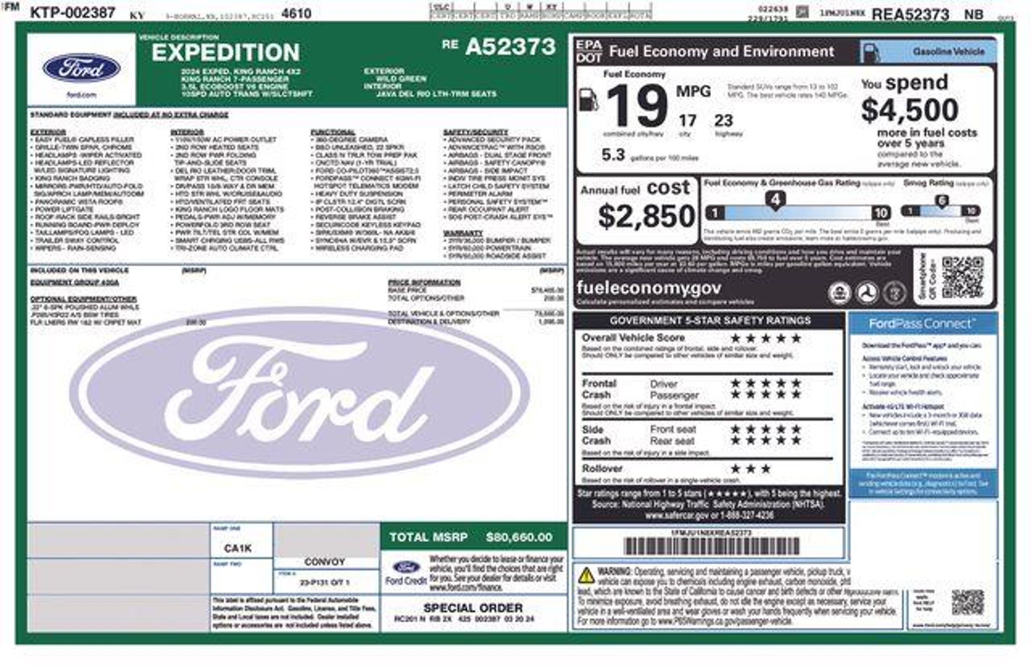At Jenkins and Wynne each vehicle has a Safety Inspection and an Oil and Filter Change. In addition, any vehicle over 50k miles completes a Compression Check- checking the engine and transmission components. This 2024 Ford Expedition King Ranch is a true standout in the SUV market. With its impressive EcoBoost V6 engine, sleek green exterior, and a wealth of premium features, this Expedition is ready to elevate your driving experience. ? **ONE OWNER** ? **SERVICE RECORDS AVAILABLE** ? **REMAINDER OF FACTORY WARRANTY** ? **CLEAN AUTOCHECK / NO ACCIDENTS** ? **LEATHER SEATS** ? **REAR BACKUP CAMERA** ? **BLUETOOTH** ? **MOONROOF/SUNROOF** ? **NAVIGATION GPS** ? **2 SETS OF KEYS** ? **7 PASSENGER** ? **USB CONNECTION** ? **HEATED SEATS** ? Ventilated Front Seats ? 1ST & 2ND ROW FLOOR LINERS W/CARPET MATS This Expedition King Ranch is more than just a capable SUV - it's a luxurious and well-equipped family hauler. The powerful EcoBoost engine delivers an exceptional blend of power and efficiency, while the 10-speed automatic transmission ensures smooth and responsive acceleration. With 17 city/23 highway MPG, you'll enjoy impressive fuel economy for a vehicle of this size and capability. Inside, the Expedition King Ranch pampers you with premium leather-trimmed seats, a state-of-the-art B&O sound system, and a host of advanced technology features. The SYNC 4 infotainment system with enhanced voice recognition keeps you connected and in control, while the large panoramic moonroof floods the cabin with natural light. The available heated and ventilated front seats, along with the heated rear seats, ensure year-round comfort for all your passengers. This Expedition also boasts an impressive array of safety and driver-assist technologies, including a rear backup camera, automatic high-beam headlights, and a suite of airbags to help protect you and your loved ones. With its powerful performance, luxurious amenities, and comprehensive safety features, this 2024 Ford Expedition King Ranch is the ultimate family SUV. Ford Gold Certified: ? 172 Point Inspection ? Roadside Assistance ? Warranty Deductible: $100 ? Transferable Warranty ? Vehicle History ? Limited Warranty: 12 Month/12,000 Mile (whichever comes first) after new car warranty expires or from certified purchase date ? Powertrain Limited Warranty: 84 Month/100,000 Mile (whichever comes first) from original in-service date ? and 22,000 FordPass Rewards Points to use toward first two maintenance visits Fami