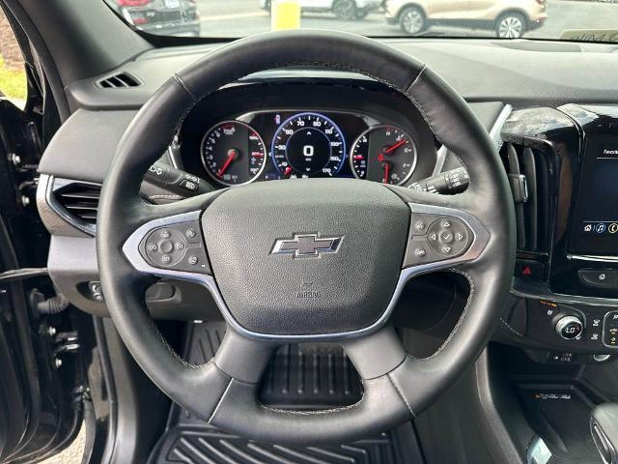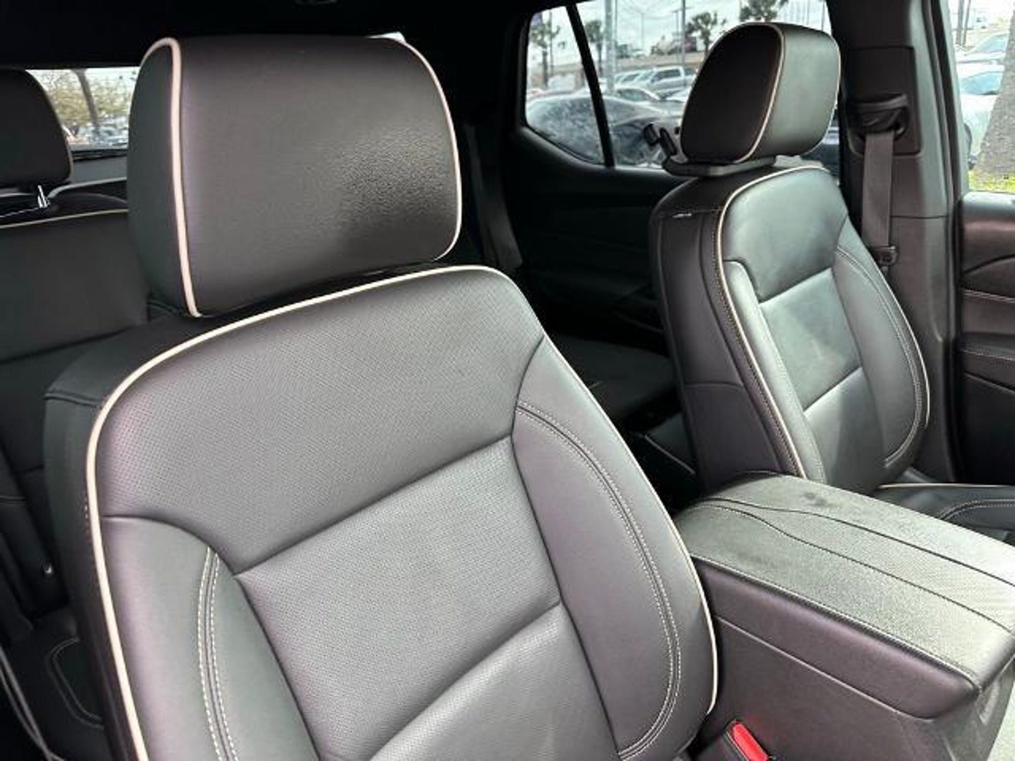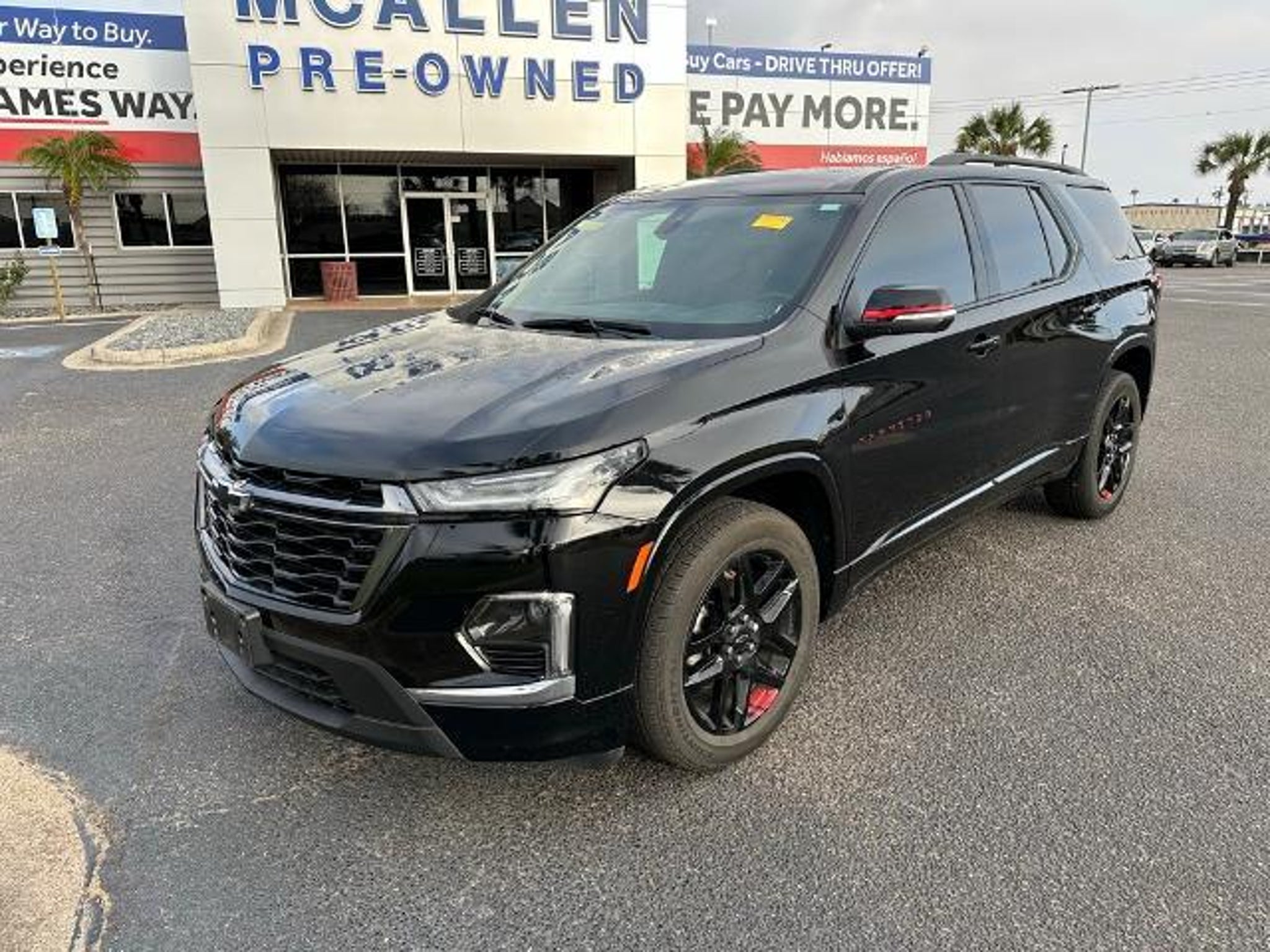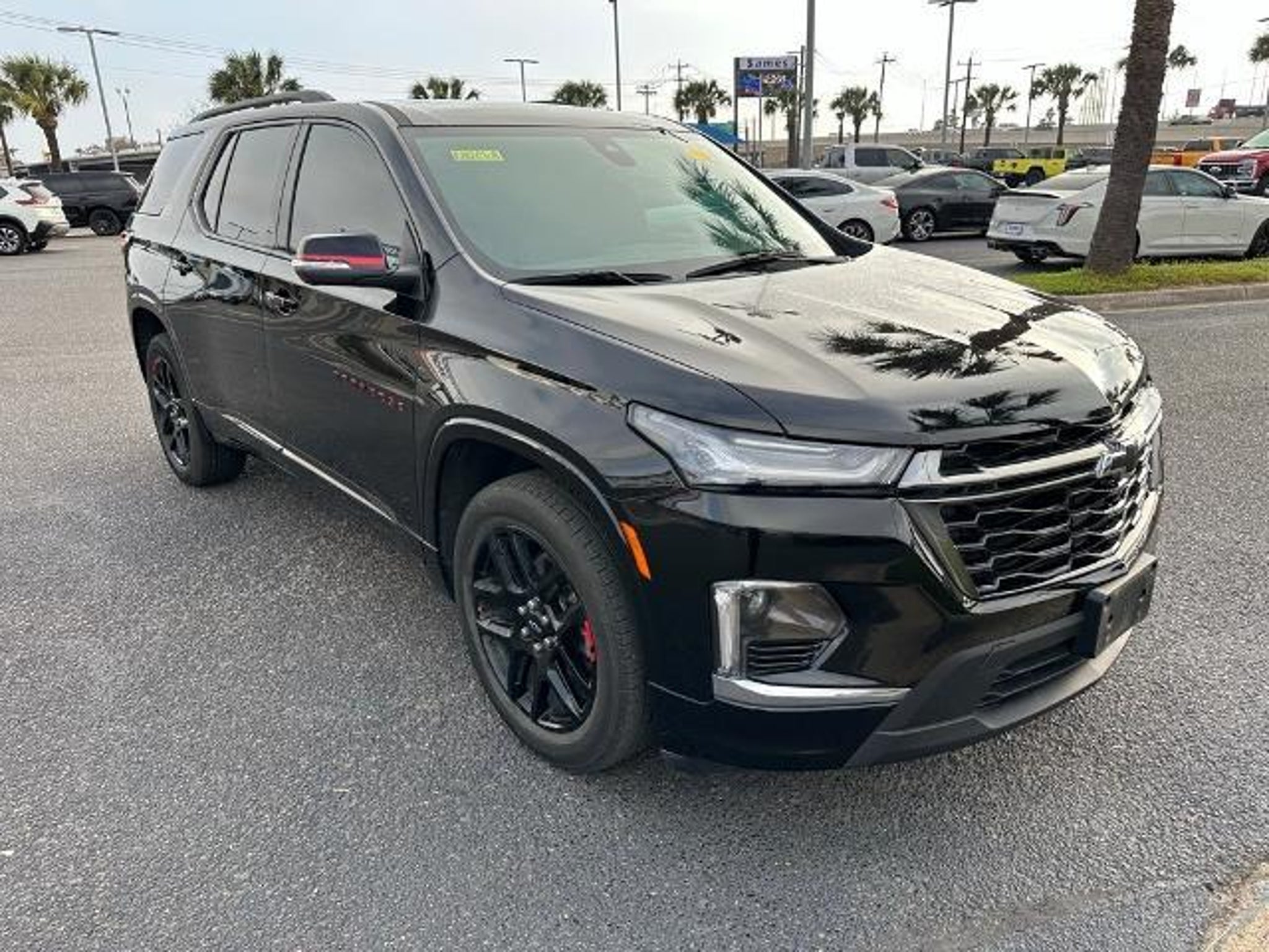 This 2023 Chevrolet Traverse Premier in Mosaic Black Metallic comes with the following features: 3.6L V6 SIDI VVT 9-Speed Automatic FWD Front License Plate Bracket Mounting Package, Preferred Equipment Group 1LZ (Heated 2nd Row Outboard Position Seats, Heated Driver & Front Passenger Seats, and Ventilated Driver & Front Passenger Seats), Redline Edition (Black Bowtie, Black Door Handles, Black Roof Rails, Dual SkyScape 2-Panel Power Sunroof, Ornamentation, Redline Accent Decals (LPO), and Wheels: 20 Gloss Black Painted Alum w/Red Stripes), Trailering Equipment (Heavy-Duty Cooling System, Hitch Guidance w/Hitch View, and Trailering Assist Guidelines), Sames Certified Certified, 10 Speakers, 3.49 Axle Ratio, 3rd row seats: split-bench, 4-Wheel Disc Brakes, 6-Way Power Front Passenger Seat, 8-Way Power Driver Seat Adjuster, ABS brakes, Air Conditioning, Alloy wheels, AM/FM radio: SiriusXM with 360L, Apple CarPlay/Android Auto, Auto High-beam Headlights, Auto-dimming door mirrors, Auto-dimming Rear-View mirror, Automatic temperature control, Bose Premium 10-Speaker Audio System Feature, Brake assist, Bumpers: body-color, Compass, Delay-off headlights, Driver door bin, Driver vanity mirror, Dual front impact airbags, Dual front side impact airbags, Electronic Stability Control, Emergency communication system, Exterior Parking Camera Rear, Four wheel independent suspension, Front anti-roll bar, Front Bucket Seats, Front Center Armrest, Front dual zone A/C, Front Passenger 2-Way Power Lumbar, Front reading lights, Fully automatic headlights, Garage door transmitter, Heated door mirrors, Heated front seats, Heated rear seats, Heated steering wheel, Illuminated entry, Leather steering wheel, Low tire pressure warning, Memory seat, Navigation System, Occupant sensing airbag, Outside temperature display, Overhead airbag, Overhead console, Panic alarm, Passenger door bin, Passenger vanity mirror, Perforated Leather-Appointed Seat Trim, Power door mirrors, Power Driver Lumbar Control, Power driver seat, Power Liftgate, Power passenger seat, Power steering, Power windows, Premium audio system: Chevrolet Infotainment 3 Plus, Radio data system, Radio: Chevrolet Infotainment 3 Plus System w/Navi, Rear air conditioning, Rear anti-roll bar, Rear reading lights, Rear window defroster, Rear window wiper, Remote keyless entry, Security system, SiriusXM w/360L, Speed control, Speed-sensing steering, Spoiler, Steering wheel memory, Steering wheel mounted audio controls, Tachometer, Telescoping steering wheel, Tilt steering wheel