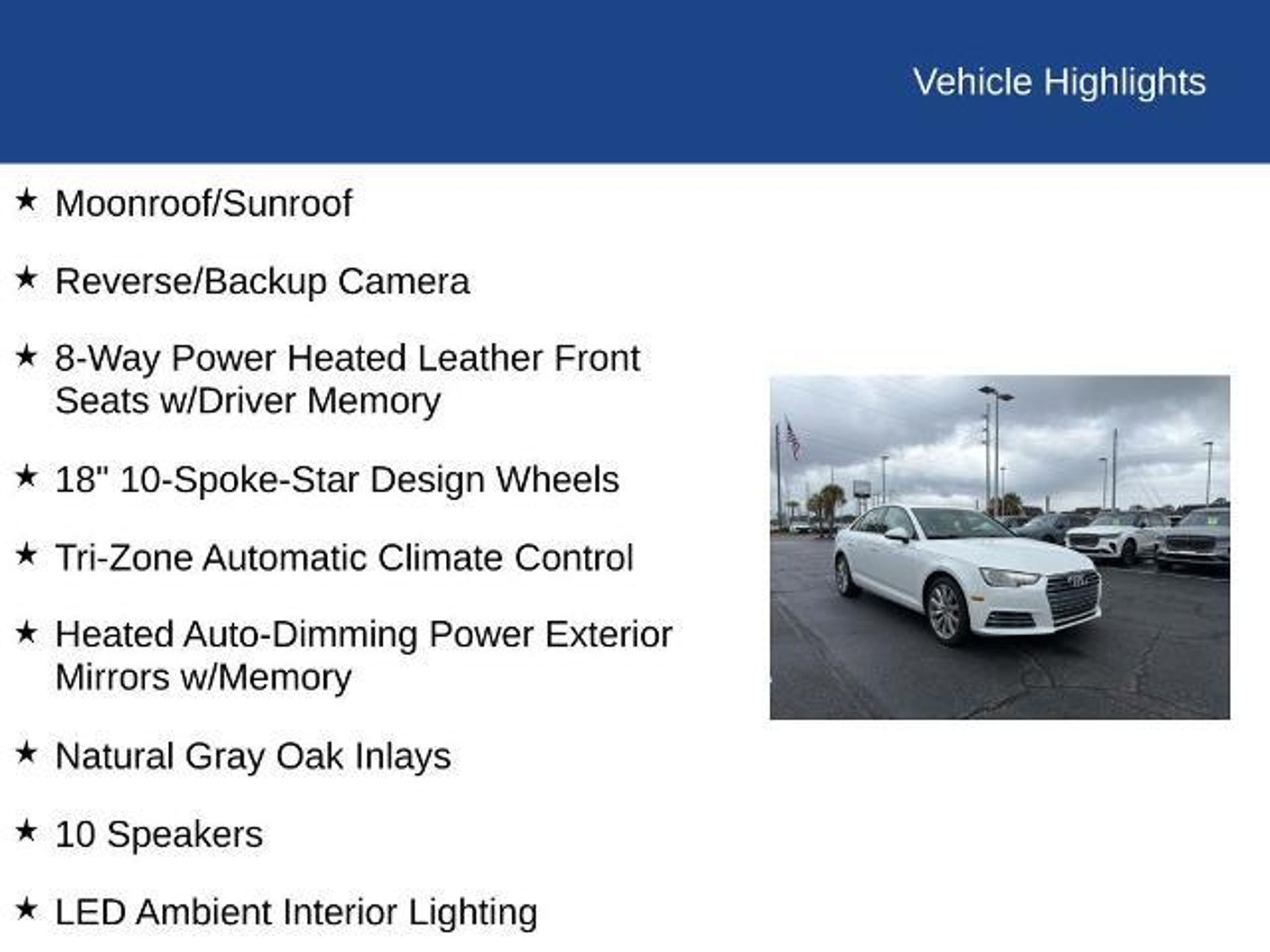 **FACTORY CERTIFIED** * Ford Blue Advantage: Blue Certified * 139 Point Inspection by Factory Certified Technicians * Roadside Assistance * Comprehensive Limited Warranty: 3 Month/4,000 Mile with Roadside Assistance ***SERVICED WITH NEW SET OF BRAKES & NEW SET OF TIRES!!*** Refined styling and engaging performance come together in this 2017 Audi A4 2.0T Premium, VIN WAUANAF42HN056457, with 108,448 miles. Designed to balance luxury and driving dynamics, this sedan delivers a smooth yet responsive experience behind the wheel. Equipped with the Convenience Package, it features 8-way power heated leather front seats with driver memory for personalized comfort, along with heated power mirrors with memory and Audi Advanced Key for added everyday ease. Natural Gray Oak wood inlays enhance the cabin with a sophisticated touch, while the power sunroof brings in natural light. Paddle shifters add a sport-inspired feel, and 18-inch wheels give the A4 a confident stance. A backup camera and integrated garage door opener add practical convenience. Blending upscale interior details with athletic performance, this A4 2.0T Premium offers a well-rounded luxury driving experience at an attractive value. 8-Way Power Heated Leather Front Seats w/Driver Memory, Moonroof/Sunroof, Reverse/Backup Camera, Push Button Start, 172 Point Inspection completed by our Factory Certified & ASC Trained Technicians, Recent Oil Change, Vehicle Detailed, 18 10-Spoke-Star Design Wheels, Tri-Zone Automatic Climate Control, Heated Auto-Dimming Power Exterior Mirrors w/Memory, Natural Gray Oak Inlays, 10 Speakers, LED Ambient Interior Lighting, Leather Steering Wheel w/Paddle Shifters, 7-Speed Automatic S tronic, quattro, 18 Wheel Package, Anti-Theft Alarm System w/Immobilizer, Audi Advanced Key, Auto-Dimming Rear-View Mirror, Convenience Package, Garage Door Transmitter, High Intensity Discharge Headlights: Xenon plus, Leather Shift Knob, Rain Sensing Wipers, Speed Control. Savannah, GA â J.C. Lewis Ford Built Ford Tough. In Savannah and throughout the Lowcountry, we believe in doing things right â with integrity, value, and a handshake that means something. Thatâs why we include over 20 photos and a full walkaround video, so you can take a close look before ever stepping on the lot. At J.C. Lewis Ford in Savannah, we offer transparent deals and dependable vehicles, whether you're headed downtown or back to the farm. Weâre happy to provide an AutoCheck or CARFAX report at no charge. Come see us at 9505 Abercorn Street, Sa