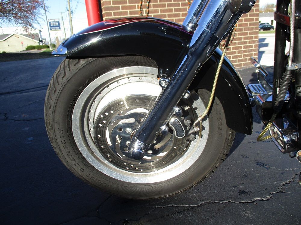 With its fat FL forks, wide 16 tires, broad handlebars and chrome 7 headlight nacelle this softail is anything but skinny. Its distinctive look will get you noticed in a crowd. The 2002 Fat Boy has a 1450cc Twin Cam V-Twin mated to a 5 speed manual transmission. You will also appreciate the driver floor boards, solid disc wheels, FL rear fender and the optional fuel injection which this bike is equipped with. This particular example has also been nicely upgraded with a long list of chrome which includes the rear swing arm, front forks, axle covers, frame inserts, swingarm bolt covers, upper and lower belt guards, shift levers, hand levers, horn cover, switch housing covers and chrome fender tips with gold H-D Eagles. It has a full custom paint job with custom tribal graphics, Daymaker LED headlight and passing lamps, smoked turn signals, a sweet low profile H-D seat with custom stitching, a matching QR passenger backrest, a QR windshield, Carlini beach bars, upgraded floor boards with a matching brake pedal, matching grips and pegs, flamed mirrors as well as flamed covers for the master cylinder, inspection cover and primary cover. To top it off it has a Stage I Hyper Charger and it sounds just plain nasty ripping through its Vance & Hines Short Shot performance exhaust system. Less than 1,000 miles ago it received new tires, brakes and a battery. Within the last 5 miles it was fully serviced and inspected and everything is in perfect working order. We have priced it fairly