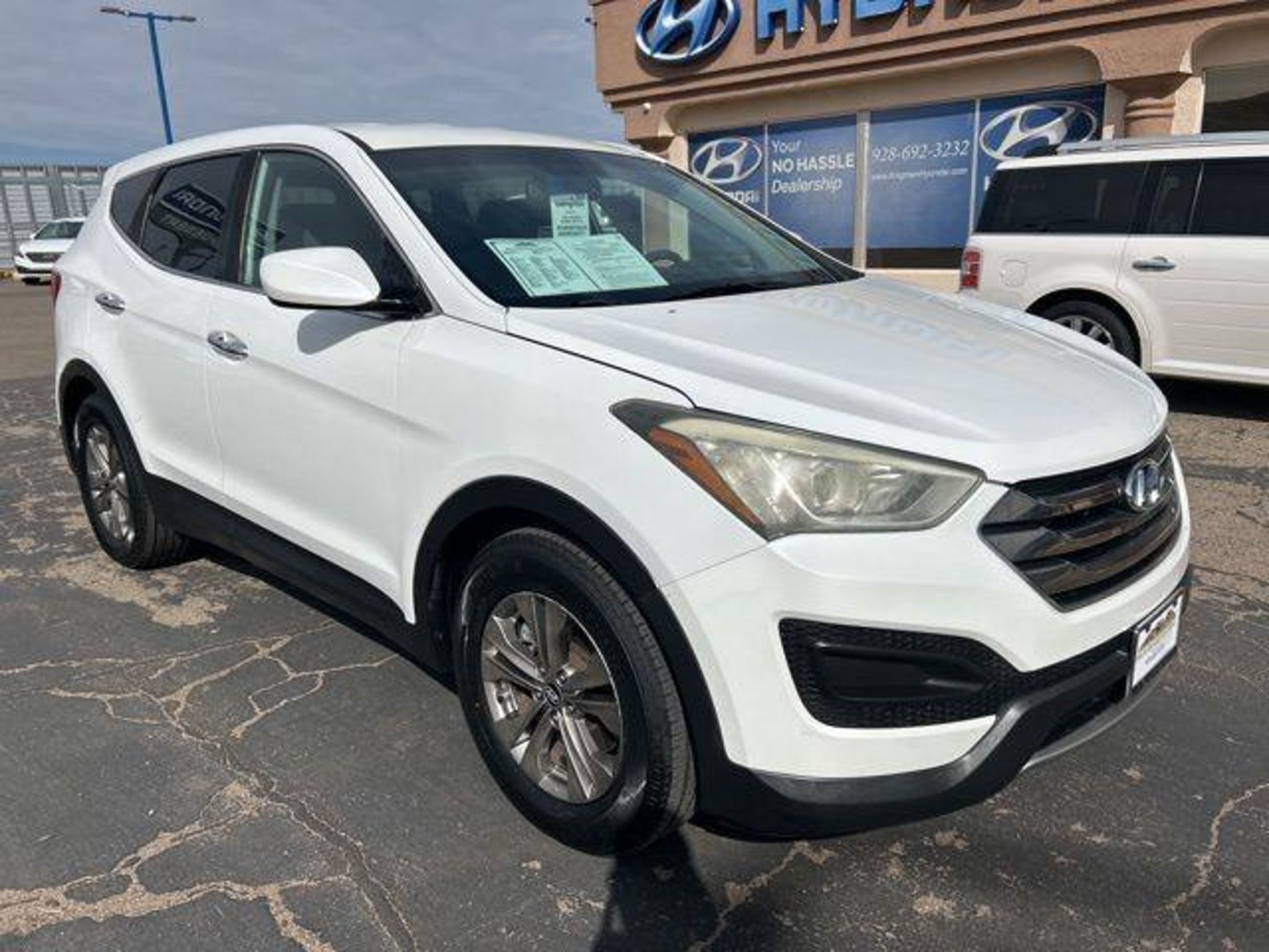 2.4L I4 DGI DOHC 16V Frost White Pearl 2013 Hyundai Santa Fe Sport FWD Awards: * 2013 IIHS Top Safety Pick At High Desert Hyundai, we pride ourselves on offering a stellar automotive experience for drivers in Kingman, Henderson NV, and Prescott AZ. Our dedicated team of sales advisors, service technicians, and financing experts are here to address all your needs with the utmost respect, care, and attention to detail. Whether you're interested in the sleek Hyundai Santa Fe Sport, the stylish Sonata, the efficient Elantra, the versatile Tucson, or the compact Accent, our knowledgeable team will guide you through all the features and benefits of each model. If you're in the market for a reliable used car, our team is ready to help you explore our extensive inventory of pre-owned vehicles. Each car undergoes a thorough inspection to ensure it meets our high standards of quality and reliability. Our auto finance team is here to provide personalized solutions that fit your individual needs. Whether you're looking to lease a new Hyundai or finance a pre-owned vehicle, we offer a range of options to make the process stress-free. Start with our online appraisal form and credit application to get a head start. Our commitment to excellence doesn't end with the sale. Our onsite auto service and repair department is staffed with skilled technicians who use cutting-edge tools and technologies to keep your vehicle running smoothly. For those who prefer to perform their own maintenance, we offer a vast collection of authentic Hyundai parts and accessories. High Desert Hyundai has all your automotive needs covered. Whether you're stopping by for a test drive or need an oil change, our team is ready to assist you. Visit us at 4180 N Stockton Hill Rd, Kingman, Arizona, or contact us today to learn more about our services and inventory. This 2013 Hyundai Santa Fe Sport is equipped with the following options: Active ECO System, Option Group 1 (4-Wheel Disc Brakes w/ABS, Advanced Front Airbags, Bodycolor Exterior Power Mirrors, Bodycolor Rear Spoiler w/LED Brake Lights, Chrome Accent Front Grille & Door Handles, Driver Selectable Steering Mode, Electronic Brake-Force Distribution (EBD), Hill-Start Assist Control (HAC), Illuminated Ignition, LED Headlight Accents, Monochromatic Multifunction Trip Computer, Power Door/Tailgate Locks, Power Windows w/Driver Auto Down/Up, Remote Keyless Entry System w/Alarm, Solar Front Glass, Steering Wheel Mounted Audio & Cruise Control, Sun Visors w/Illuminated Vanity Mirrors, Tilt & Telescopic Steering Wheel, Tire Pressure Monitoring System, and Vehicle Stability Management w/ESC), 17 x 7 Aluminum Alloy Wheels, 4-Wheel Disc Brakes, 6 Speakers, ABS brakes, Air Conditioning, Alloy wheels, AM/FM radio: XM, Auto-Dimming Mirror w/HomeLink & Compass, Axle Ratio 3.648, Brake assist, Bumper Applique, Bumpers: body-color, Cargo Cover/Screen, Cargo Net, Carpeted Cargo Mat, Carpeted Floor Mats, CD player, Driver door bin, Driver vanity mirror, Dual front impact airbags, Dual front side impact airbags, Electronic Stability Control, Emergency communication system: Blue Link, Four wheel independent suspension, Front anti-roll bar, Front Bucket Seats, Front Center Armrest, Front reading lights, Illuminated entry, Knee airbag, Low tire pressure warning, Multi-Adjustable Bucket Seats, Occupant sensing airbag, Outside temperature display, Overhead airbag, Overhead console, Panic alarm, Passenger door bin, Passenger vanity mirror, Power door mirrors, Power steering, Power windows, Radio: AM/FM/CD/XM/MP3 Audio System, Rear anti-roll bar, Rear seat center armrest, Rear window defroster, Rear window wiper, Remote keyless entry, Security system, Speed control, Speed-sensing steering, Split folding rear seat, Spoiler, Stain-Resistant Cloth Seating Surfaces, Steering wheel mounted audio controls, Tachometer, Telescoping steering wheel, Tilt steering wheel, Traction control, Trip computer, Variably intermittent wipers, and Wheel Lock