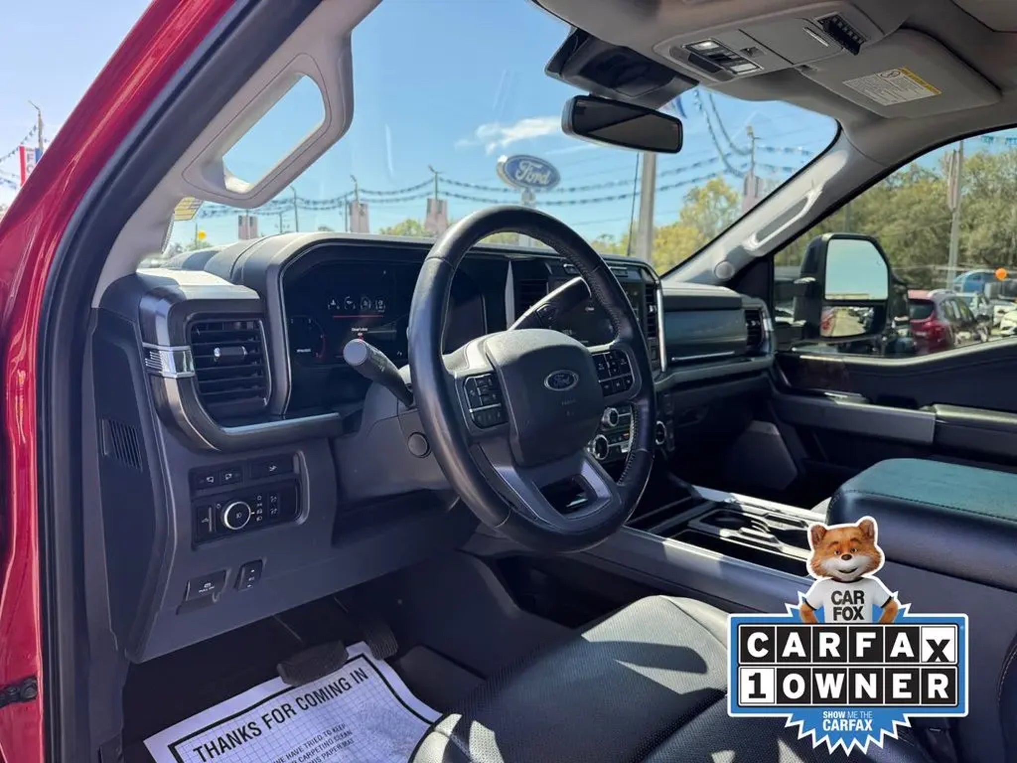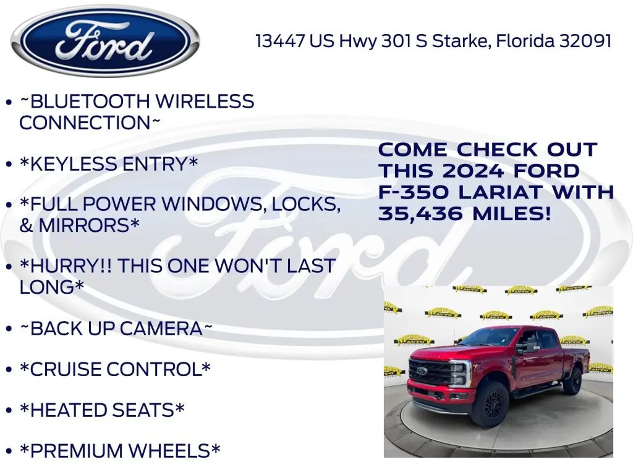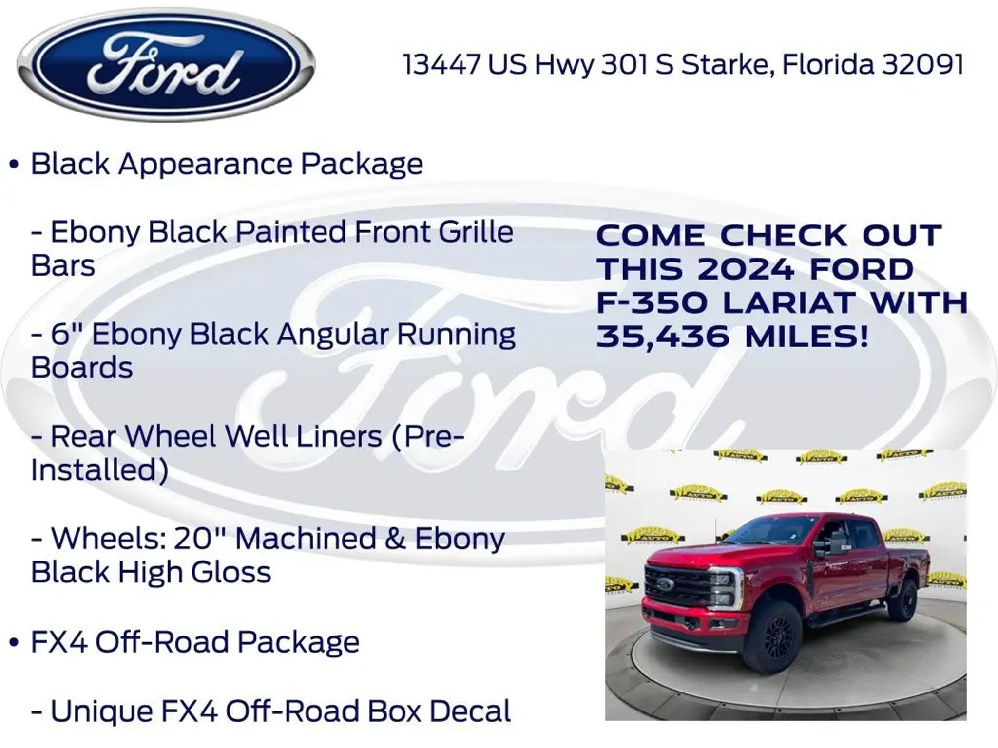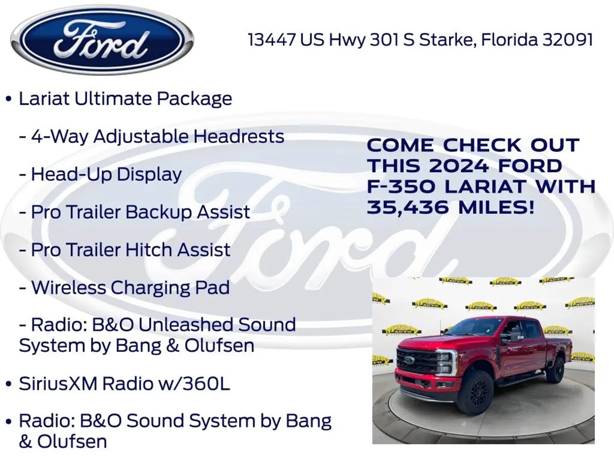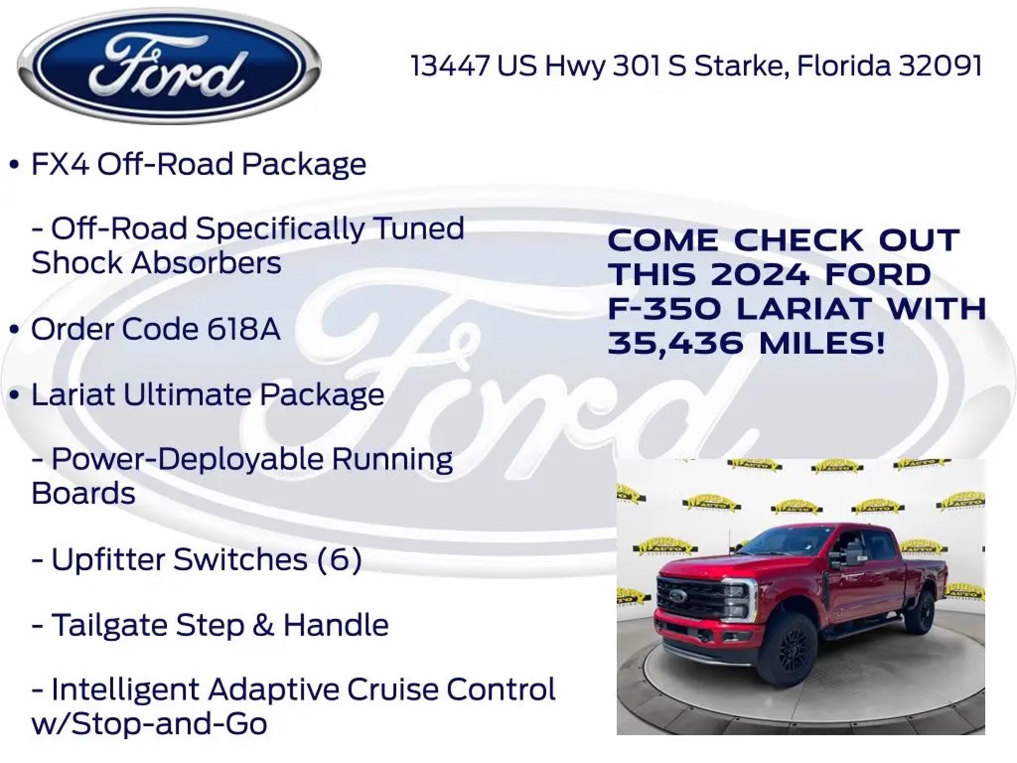 CARFAX One-Owner. Murray Ford Superstore of Starke is pumped up to offer this hard-working 2024 Ford F-350SD in Red Metallic This vehicle is readily available and comes with the following Black Appearance Package (6 Ebony Black Angular Running Boards, Body Color Front & Rear Bumpers, Ebony Black Painted Front Grille Bars, Ebony Black Painted Mirror Caps, Rear Wheel Well Liners (Pre-Installed), Tough Bed Spray-In Bedliner, and Wheels: 20 Machined & Ebony Black High Gloss), FX4 Off-Road Package (Hill Descent Control, Off-Road Specifically Tuned Shock Absorbers, and Unique FX4 Off-Road Box Decal), Lariat Ultimate Package (4-Way Adjustable Headrests, Front Sensing System, Head-Up Display, Intelligent Adaptive Cruise Control w/Stop-and-Go, Power-Deployable Running Boards, Pro Trailer Backup Assist, Pro Trailer Hitch Assist, Radio: B&O Unleashed Sound System by Bang & Olufsen, SiriusXM Radio w/360L, SYNC 4 w/Enhanced Voice Recognition, Tailgate Step & Handle, Upfitter Switches (6), and Wireless Charging Pad), Order Code 618A, 4WD, 190 Amp Alternator, 4-Wheel Disc Brakes, 8 Speakers, ABS brakes, Adjustable pedals, Air Conditioning, All-Weather Floor Mats, Alloy wheels, AM/FM radio: SiriusXM with 360L, Auto High-beam Headlights, Auto tilt-away steering wheel, Auto-dimming Rear-View mirror, Automatic High Beam, Automatic temperature control, BLIS w/Cross-Traffic Alert, Brake assist, Bumpers: chrome, Compass, Delay-off headlights, Driver door bin, Driver vanity mirror, Dual 68 AH/65 AGM Batteries, Dual front impact airbags, Dual front side impact airbags, Electronic Stability Control, Electronic-Locking w/3.73 Axle Ratio, Emergency communication system: SYNC 4 911 Assist, Exterior Parking Camera Rear, Flow-Through Console, Front anti-roll bar, Front Bucket Seats, Front Center Armrest, Front dual zone A/C, Front fog lights, Front Leather-Trimmed 40/Console/40 Seats, Front License Plate Bracket, Front reading lights, Fully automatic headlights, Garage door transmitter, Heated door mirrors, Heated front seats, Heated rear seats, Heated steering wheel, Illuminated entry, Lane-Keeping System, Leather steering wheel, Low tire pressure warning, Memory seat, Navigation system: Connected Navigation (includes complimentary 1-year trial), Outside temperature display, Overhead airbag, Overhead console, Panic alarm, Passenger door bin, Passenger vanity mirror, Pedal memory, Post-Collision Braking, Power door mirrors, Power driver seat, Power passenger seat, Power steering, Power windows, Pre-Collision Assist, Radio: B&O Sound System by Bang & Olufsen, Rain sensing wipers, Rear reading lights, Rear seat center armrest, Rear step bumper, Rear window defroster, Remote keyless entry, Security system, Speed control, Split folding rear seat, Steering wheel memory, Steering wheel mounted audio controls, Tachometer, Telescoping steering wheel, Tilt steering wheel, Traction control, Trip computer, Turn signal indicator mirrors, Twin Panel Power Moonroof, Variably intermittent wipers, Vehicle Safe by Console Vault (Pre-Installed), Ventilated front seats, and Wheels: 18 Bright Machined & Carbonized Gray Alum; 15 Year 150,000 mile warranty at no cost applies to all vehicles excluding Transit Vans, DRW Trucks, any SVT Models, or similar vehicles. See sales for details! All vehicles will have a $999.00 dealer fee added to the total sale price (excludes A,Z,D, and X plan customers). Taxes, tag, title fees and a $125 Electronic filling fee will be added to all vehicles in accordance with state laws of customers registering address. *** We make every effort to provide you with the most accurate, up-to-the-minute information, however it is your responsibility to verify with the Dealer that all details listed and installed options are accurate for this specific vehicle. To ensure accuracy, please contact the dealership to verify the exact options, features and programs that are included and are available for this specific vehicle prior to purchase. Price Does not