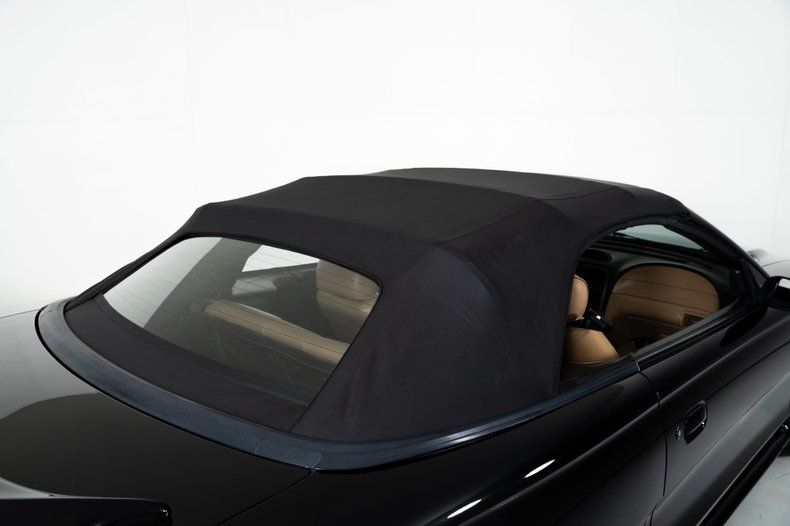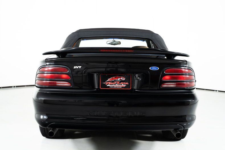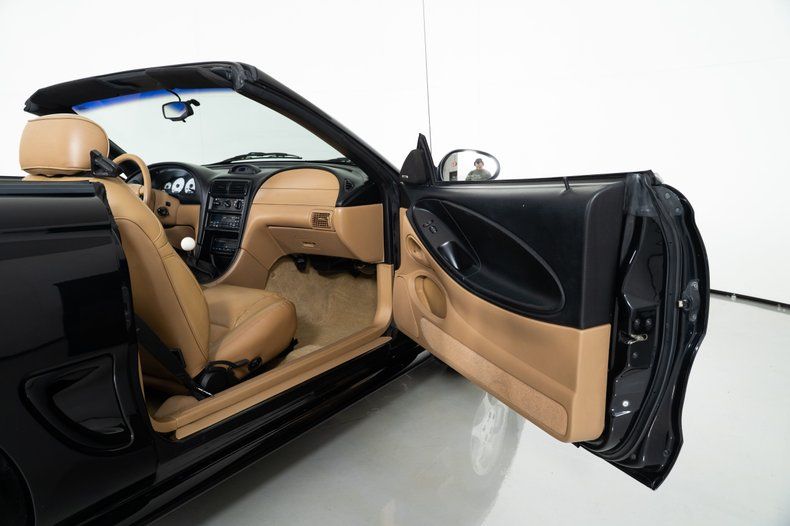 Finished in black with a black cloth convertible top, this black Mustang convertible has the aggressive look that Mustang fans appreciate. The stance is complemented by 17-inch Mustang Cobra wheels wrapped in Michelin 255/45R17 tires, and BBK ceramic headers and dual exhaust with Flowmaster mufflers give this Mustang Cobra the unmistakable V8 sound enthusiasts expect.