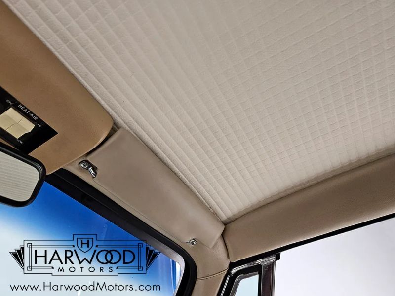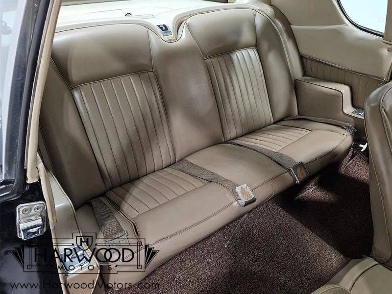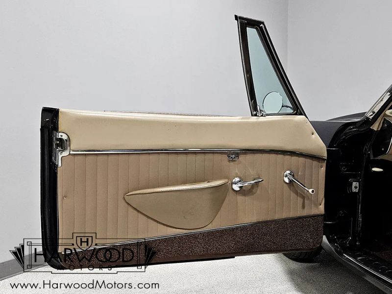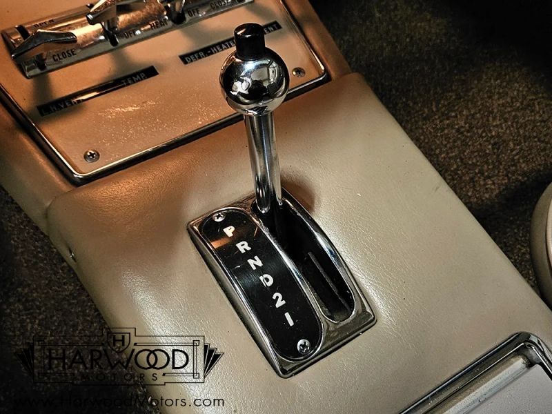 We believe the tan bucket seat interior is mostly original save for the carpets, which are just too nice to be 63 years old. You can see the aircraft influence throughout the drivers compartment, from the wrap-around instrument panel to the lever-style climate controls to the overhead headlight switches. The tan vinyl on the seats remains in excellent condition with no splits or tears, and the foam underneath still feels supportive and comfortable. The stylish two-spoke steering wheel isnt cracked or separated, and it frames a full array of fully operational gauges, including a vacuum gauge (only the clock is inop). The center stack houses the original AM radio, the A/C controls, the heater levers, and theres a cool pop-up vanity inside the glove box. Theres decent space in the back seat, and youll note this car is equipped with rather rare seat belts, an oddity in 1963. The funky ribbed headliner is in excellent condition, and theres a surprisingly spacious trunk in back which includes a full-sized spare tire underneath.