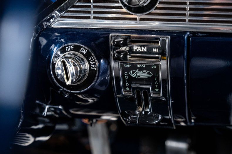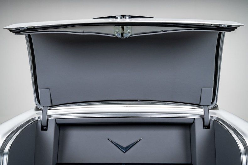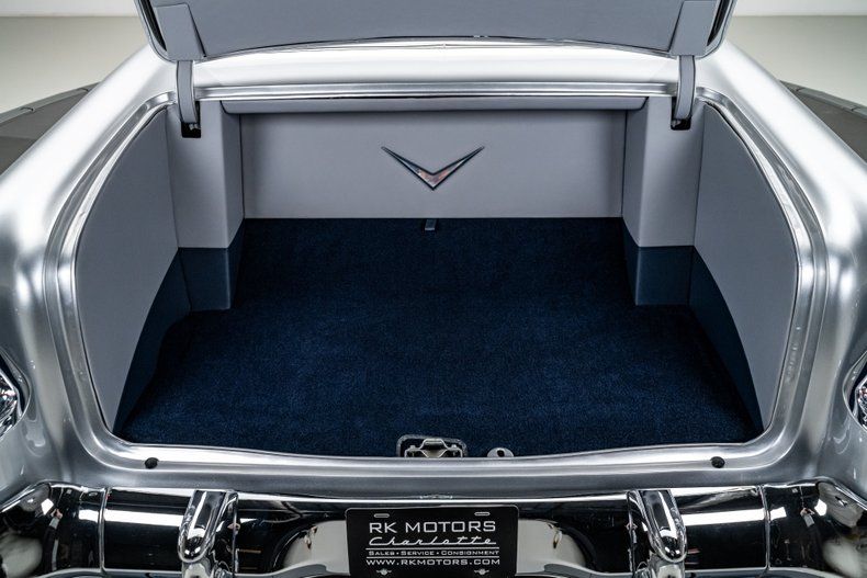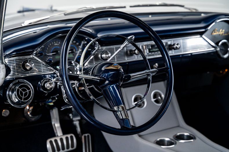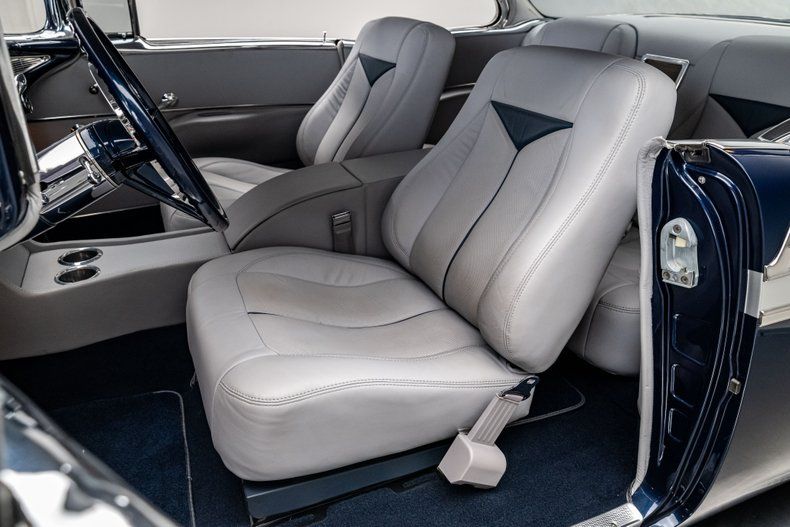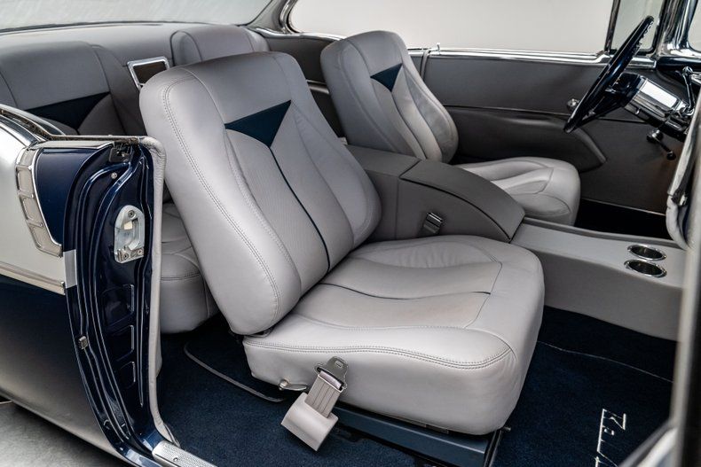 Inside, the Bel Air retains its classic dashboard design while incorporating modern comfort and functionality. Custom leather bucket seats trimmed in light grey provide a comfortable and supportive driving environment, contrasted by dark blue carpet and a body-matched dash that continues the elegant two-tone theme. The classic Bel Air dash presentation remains intact but now houses Dakota Digital gauges and a Custom Autosound AM/FM/Aux head unit, along with controls for modern air conditioning. A custom full-length center console adds convenient storage and integrated cupholders, while a classic Bel Air steering wheel mounted to a tilting column completes the blend of vintage style and modern usability. The attention to detail continues in the trunk, which is fully upholstered to match the interior for a clean, finished presentation.