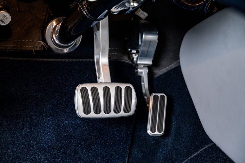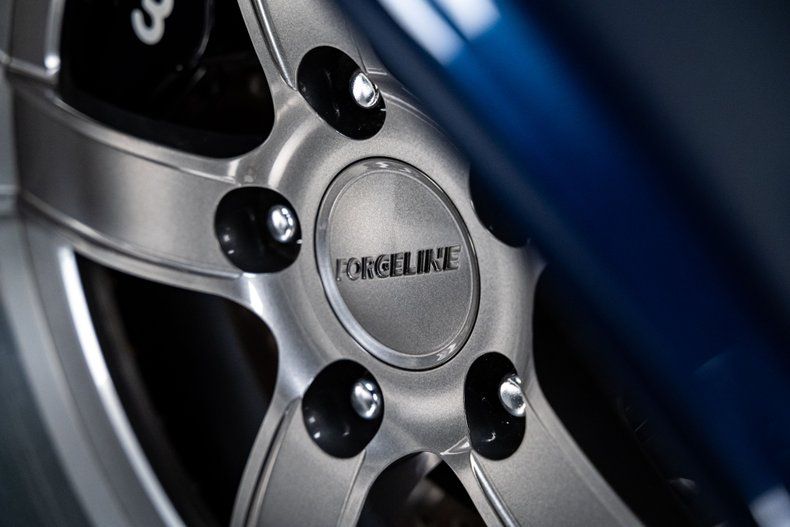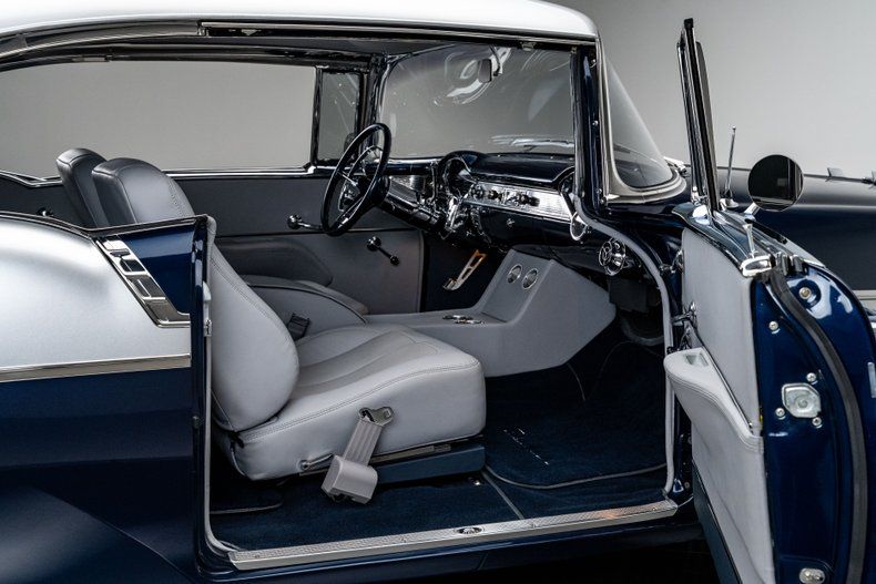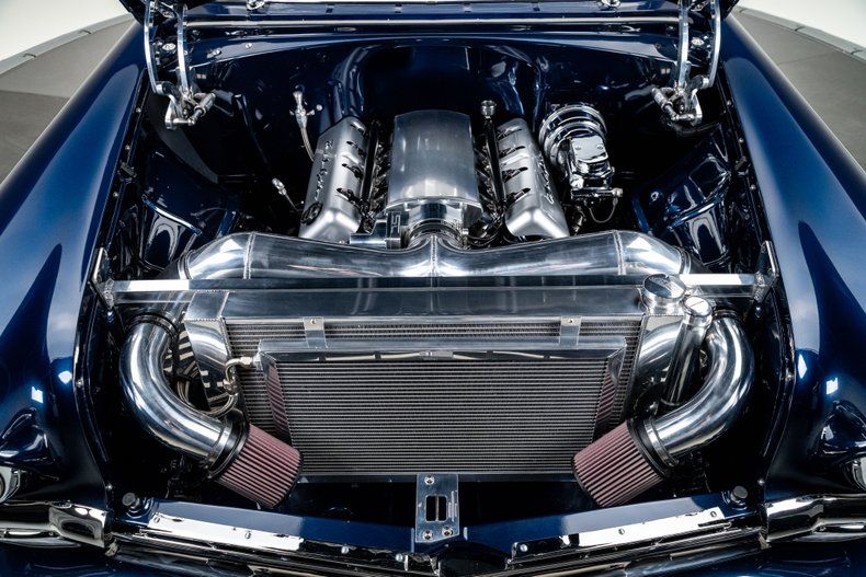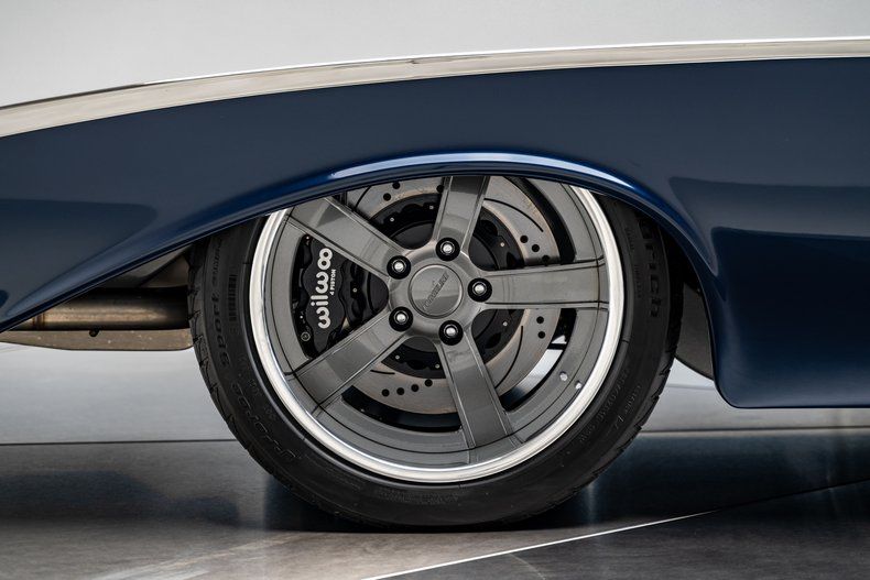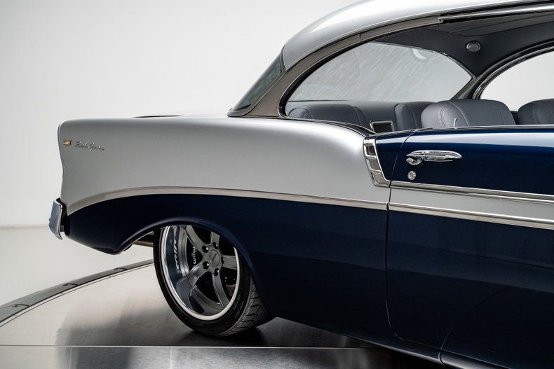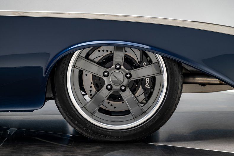 Finished in an attractive metallic blue over metallic silver two-tone, the body presents a tasteful interpretation of Chevrolet's iconic Bel Air styling. Traditional trim, chrome and badging remain intact, preserving the unmistakable character that defines the model, while subtle modern touches enhance the presentation. LED '56-style tail lamps provide improved visibility without altering the factory look, and the car's athletic stance immediately signals its modern underpinnings. Completing the exterior are 18" Forgeline CH3P wheels finished in gunmetal with polished lips, wrapped in BFGoodrich G-Force tires that fill the arches perfectly and complement the car's lowered posture.