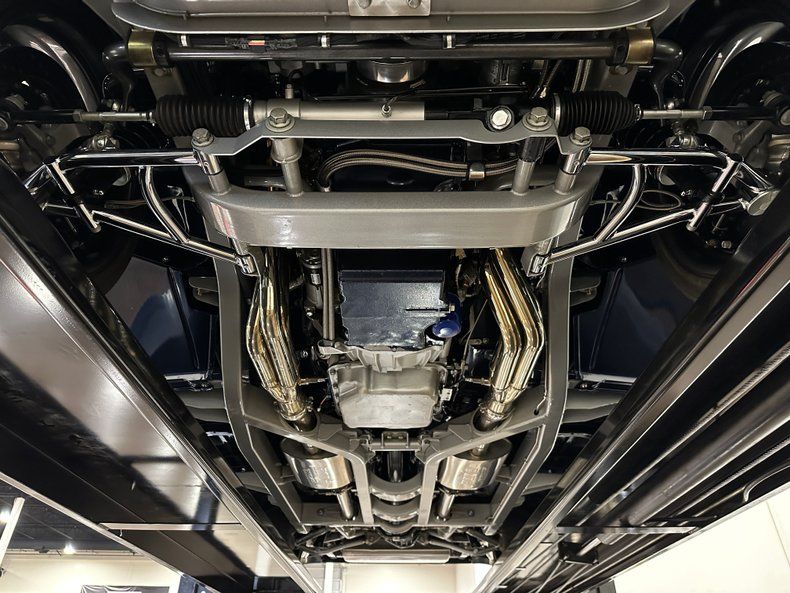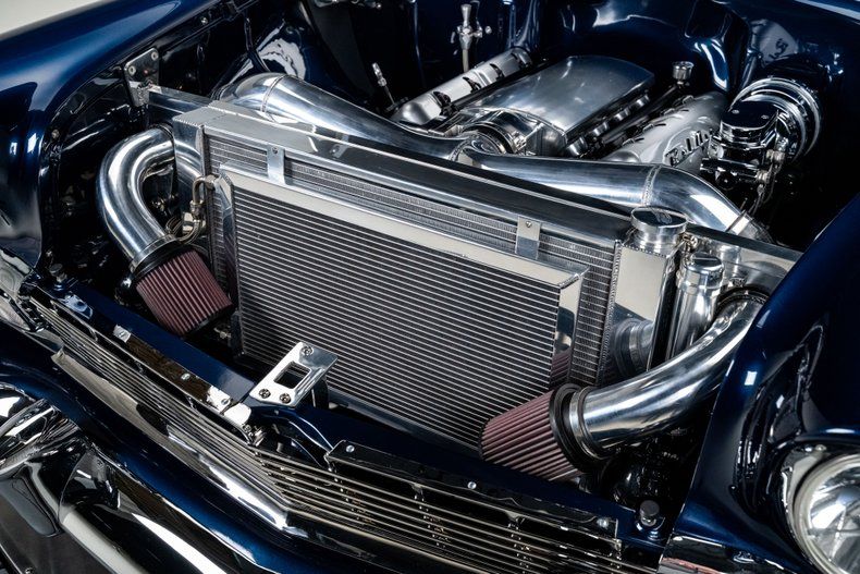 Power comes from a 6.2L LS3 V8 that has been carefully detailed to match the car's refined presentation. A fabricated intake manifold feeds twin intakes through custom polished tubing, while custom 'Bel Air' script coil covers provide a subtle nod to the car's heritage. Polished stainless long tube headers feed a polished stainless dual exhaust system, and the entire engine bay is exceptionally clean thanks to a smoothed firewall and thoughtful detailing. Backing the engine is a 4L60E 4-speed automatic transmission, sending power through an Art Morrison chassis that dramatically elevates the car's road manners. A Strange rear end with 3.50 gearing and a limited-slip differential help get power to the ground. Polished, tubular control arms up front, JRi coilovers at all four corners and a independent rear suspension provide modern handling, while Wilwood four wheel power disc brakes and power rack-and-pinion steering deliver confident stopping and precise control.