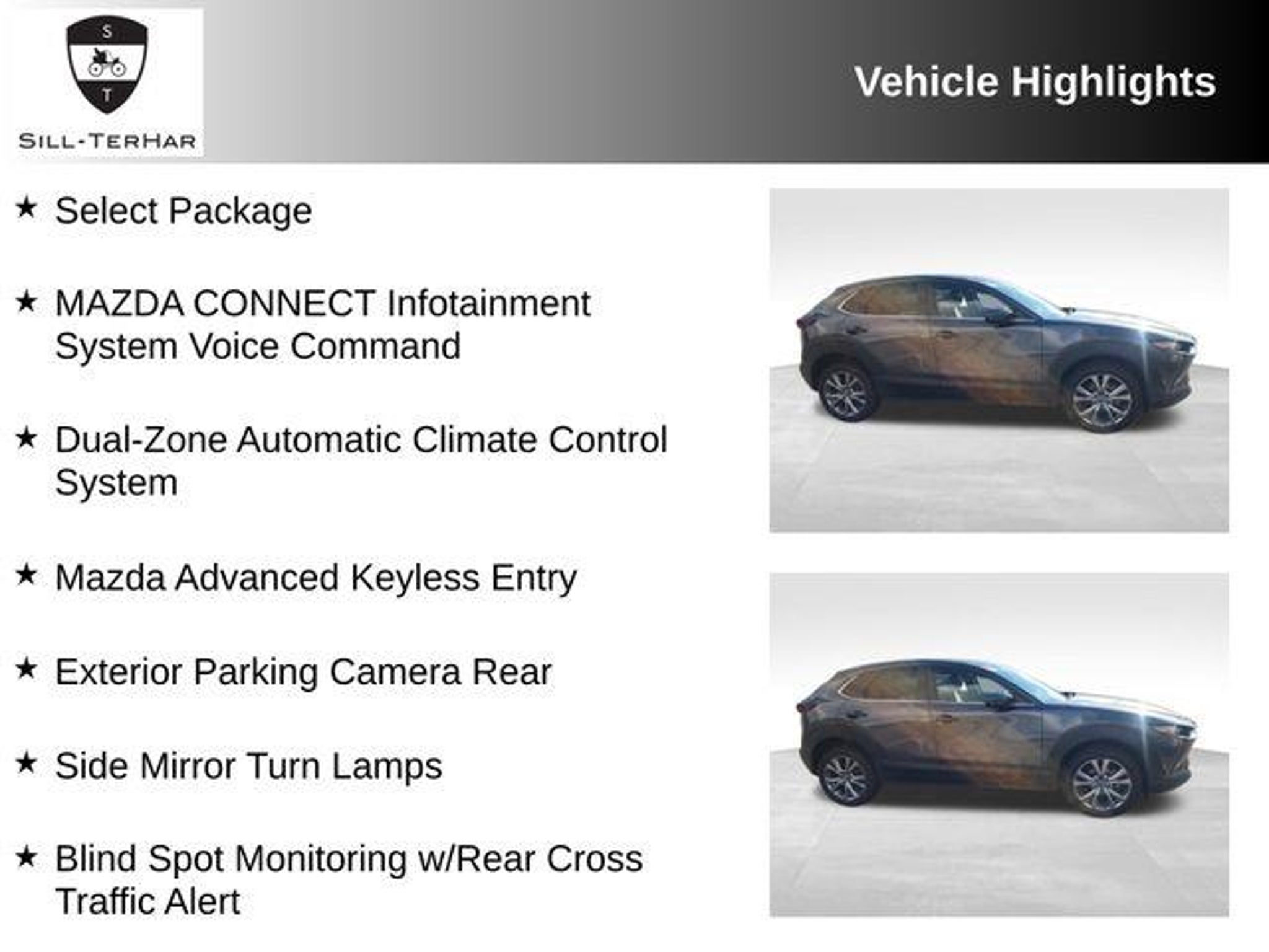 Discover the exceptional 2020 Mazda CX-30 Select, a rare gem that combines style, performance, and advanced technology. This captivating crossover SUV is ready to elevate your driving experience and turn heads wherever you go. - This CX-30 is a rare find, featuring the sought-after MACHINE GRAY METALLIC PAINT and the premium Select Package. - Enjoy the seamless integration of the MAZDA CONNECT Infotainment System, complete with Voice Command, Apple CarPlay, and Android Auto compatibility. - Stay comfortable and in control with the Dual-Zone Automatic Climate Control System, Leather-Wrapped Steering Wheel, and Gear Shift Knob. - Enhance your driving confidence with Blind Spot Monitoring, Rear Cross Traffic Alert, and the Exterior Parking Camera Rear. - Indulge in the convenience of the Mazda Advanced Keyless Entry system and the Rear Seat Armrest with Cupholders. This CX-30 Select is powered by a responsive I4 engine and features an efficient 6-Speed Automatic transmission with All-Wheel Drive. With an impressive EPA-estimated 24 MPG in the city and 31 MPG on the highway, you'll enjoy exceptional fuel efficiency without sacrificing performance. Elevate your driving experience with the thoughtfully designed and well-equipped 2020 Mazda CX-30 Select. This crossover SUV offers a winning combination of style, comfort, and advanced technology that will truly impress. Contact us today to schedule a test drive and discover why the CX-30 Select is the perfect choice for your next vehicle.
