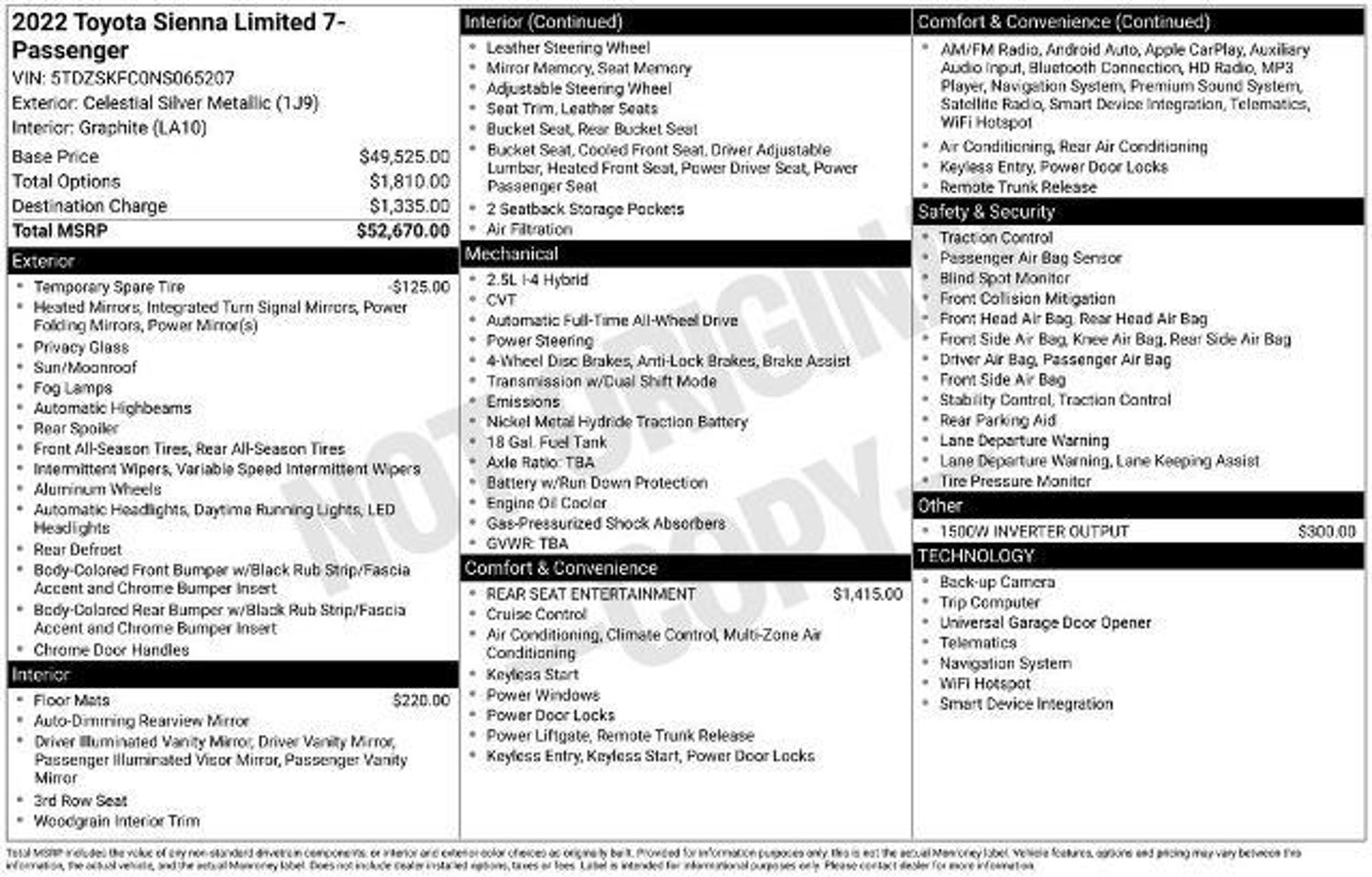 2022 Toyota Sienna Limited 7 Passenger Celestial Silver Metallic Sienna Limited 7 Passenger, 4D Passenger Van, 2.5L I4, CVT, AWD, Celestial Silver Metallic, Graphite Leather. *GRAPPONE PEACE OF MIND* 3 day money back guarantee and 30 day/1,000 mile exchange**Upfront pricing, all the time on every vehicle. 3 month/3000 mile warranty. Free Carfax and 129 point inspection.
