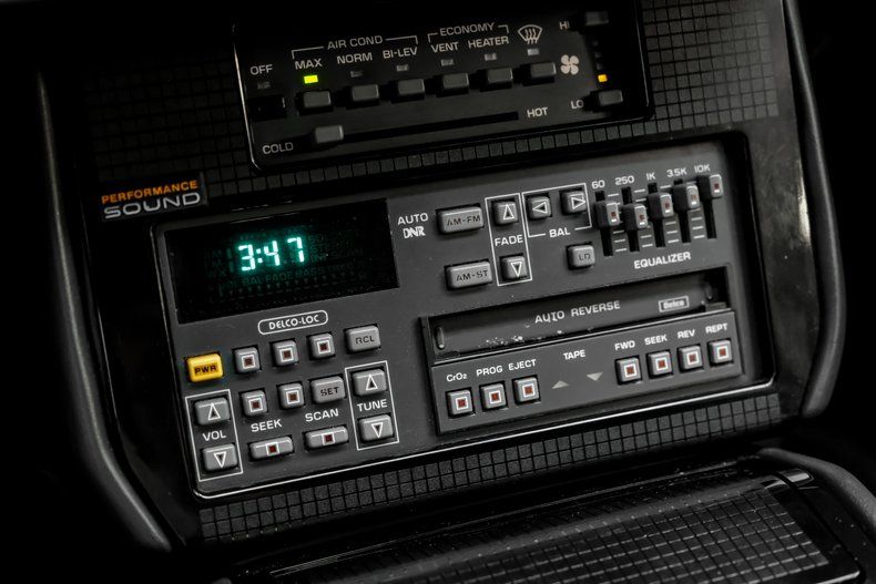All the outward signs show that this Pontiac has seen consistent sheltering over its lifetime. The interior is in clean shape, with the surfaces of its black vinyl upholstery showing no tearing or noticeable stains and the carpeting still looks fresh and well-fitted. Pontiac got adventurous with its dash configurations when the Trans Am's third generation arrived, and this specimen ably demonstrates that trend. Check out the AM/FM/Cassette stereo at the center of the dash, with its integrated equalizer offering a multitude of knobs to get the interior sound to your liking. Or the assembly of factory gauges in their digital configuration that marked a big change from previous aesthetic norms. The functionality inside these doors has held up well over the years, so the factory air conditioning is blowing strong and cold, and the sound system is still in fine form.