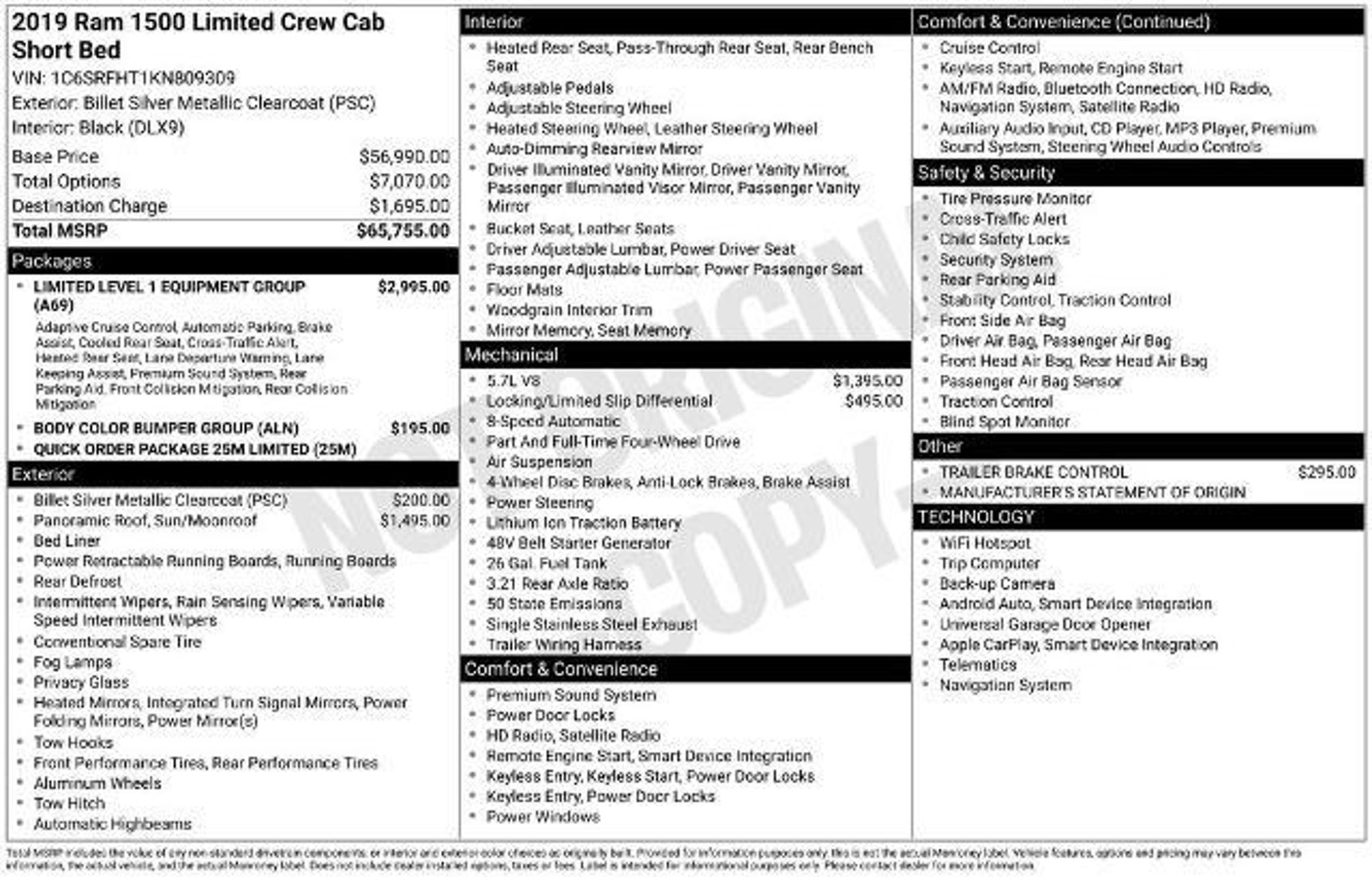 **Accident Free**2019**Ram**1500**Limited**4WD**Panoramic Sunroof**Heated & Ventilated Seats**Heated Steering Wheel**Navigation** Enjoy hardcore capability in our Accident Free 2019 RAM 1500 Limited Crew Cab 4X4 with the Level 1 Equipment Package that's ready to make a strong impression in Billet Silver Metallic! Motivated by a 5.7 Liter HEMI V8 that offers 395hp matched to a responsive 8 Speed Automatic transmission for amazing towing capability. This Four Wheel Drive truck also delivers steady handling on the road or the trail thanks to an active air suspension, and it achieves nearly 21mpg on the highway while showing off a design that evokes power and prestige with LED lighting, fog lamps, panoramic sunroof, power running boards, and bold 20-inch wheels. Even when it's hard at work, our Limited lets you relax with our Level 1 Equipment Pack's leather heated/ventilated front and rear seats, a leather heated steering wheel, power-adjustable pedals, dual-zone automatic climate control, adaptive cruise control, and advanced technology anchored by an 8.4-inch touchscreen. Use that or voice control to manage full-color navigation, Android Auto, Apple CarPlay, Bluetooth, WiFi compatibility, and a 19-speaker Harman Kardon audio system. And you and your whole crew will love the cab's roomy interior dimensions! Further confidence comes from RAM safety features such as a backup camera, blind-spot monitor, parking sensors, tire-pressure monitoring, hill-start assist, trailer-sway control, and advanced multistage front airbags. With all that and more, getting carried away with our impressive 1500 Limited is easy. Save this Page and Call for Availability. We Know You Will Enjoy Your Test Drive Towards Ownership!