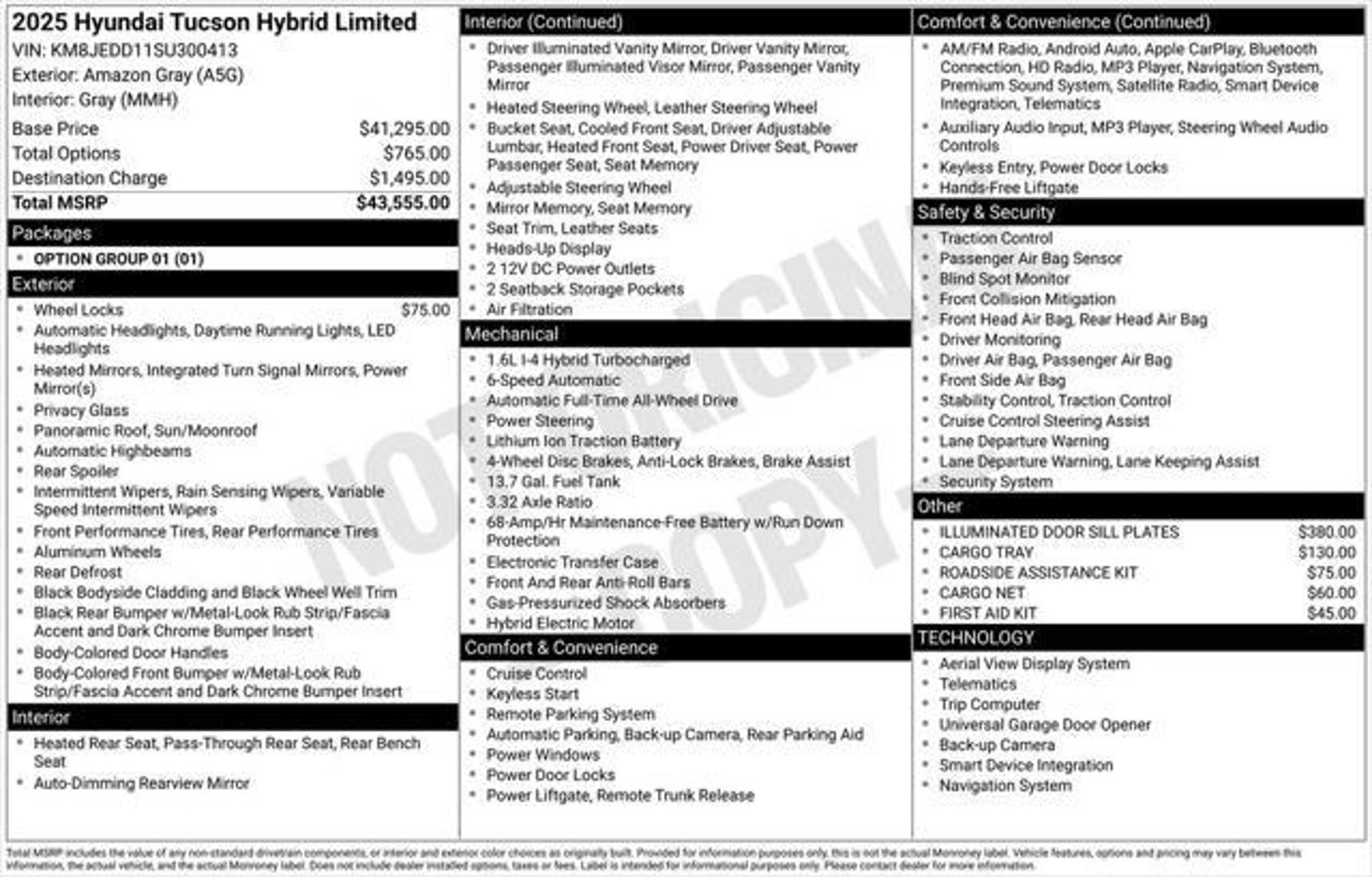 Please Call For More Details And Availability. This stunning 2025 Hyundai Tucson Hybrid Limited is a true standout in its class. Boasting a sleek and modern design, advanced hybrid powertrain, and an impressive array of premium features, this vehicle is the perfect blend of efficiency, performance, and luxury. - Illuminated Door Sill Plates - Cargo Tray - Roadside Assistance Kit - Wheel Locks - Cargo Net - First Aid Kit Under the hood, you'll find a powerful 1.6L I4 DGI Hybrid Turbocharged DOHC 16V LEV3-SULEV30 engine, paired with a 6-Speed Automatic transmission and AWD. This combination delivers an exceptional driving experience, with an EPA-estimated 37 MPG in the city and 36 MPG on the highway. The Tucson Hybrid Limited is packed with cutting-edge technology and premium amenities, including a Bose Premium audio system, Navigation, Heads-Up Display, and a panoramic power moonroof. The leather-trimmed interior, heated and ventilated front seats, and heated rear seats provide unparalleled comfort and luxury. Safety is also a top priority, with features like Blind Spot Monitoring, Rear Cross-Traffic Alert, and a comprehensive suite of airbags and advanced driver assistance systems. The Tucson Hybrid Limited is designed to keep you and your loved ones secure on the road. Imagine the joy of owning a vehicle that seamlessly blends efficiency, performance, and style. This 2025 Hyundai Tucson Hybrid Limited is a true gem, and we would be honored to have you experience it firsthand. Please call to schedule a test drive and discover the exceptional value this vehicle has to offer.