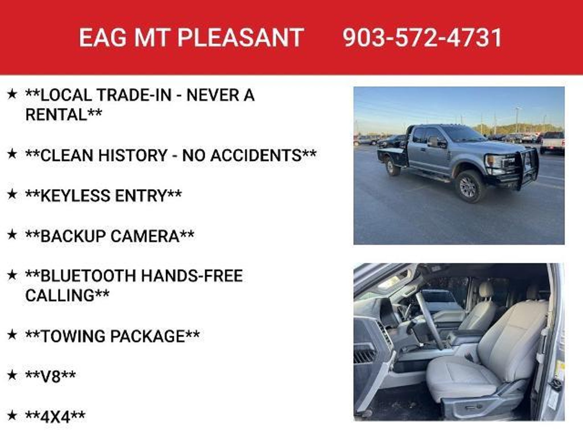 Elevate your driving experience with this exceptional 2022 Ford F-350SD XLT. This powerful and versatile truck is ready to tackle any task, whether it's hauling heavy loads or conquering off-road adventures. - Keyless Entry - Backup Camera - Bluetooth Hands-Free Calling - Towing Package - V8 Engine - 4x4 Capability - Blind Spot Sensors Equipped with a robust 7.3L V8 engine and a smooth-shifting 10-speed automatic transmission, this F-350SD delivers impressive performance and capability. The FX4 Off-Road Package enhances its off-road prowess, with features like hill descent control, off-road-tuned shock absorbers, and skid plates. The XLT Value Package adds even more convenience and comfort, including an 8-way power driver's seat, a reverse sensing system, and a SecuriCode keyless entry keypad. The Camper Package ensures this truck is ready to tow your favorite recreational vehicle, while the Upfitter Switches provide the flexibility to customize your setup. Step inside and you'll be greeted by a well-appointed interior, featuring a SYNC 3 infotainment system, dual-zone climate control, and a premium audio system. The platform running boards and PowerScope trailer tow mirrors add both functionality and style. This F-350SD is a true workhorse, built to handle the toughest jobs with ease. With its impressive capabilities, versatile features, and rugged good looks, it's the perfect companion for your next adventure. This vehicle is located at EAG Mt. Pleasant, but can be made available upon request. The price listed does not include tax, title, license, or documentation fees ($225). We are located just west of Titus Regional Medical Center on the I-30 frontage road.
