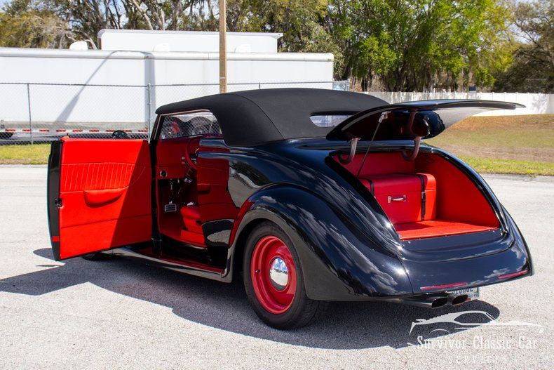 The Mirror Black PPG Paint has been polished to a Mirror Finish and features a Chrome '37 Ford Grille, Glass Headlamps and shaved doors (remote door poppers for easy access). The Top is a custom designed Removable Canvas Carson Top & the 17in Steel wheels has been painted to match the interior. This Interior was designed by the owner. He wanted a "Clean & Simple" Styling & everything is wrapped in Ultrafrabric's Red, a Vinyl fabric that looks & fells similar to real Leather. The Billet 1/2 Wrapped Steering Wheel is attached to a full polished Chrome Tilt Steering Column & the gauges are located in the lower Dash panel. The Interior is air conditioning cooled by Vintage Air A/C & comfortable bucket seating.