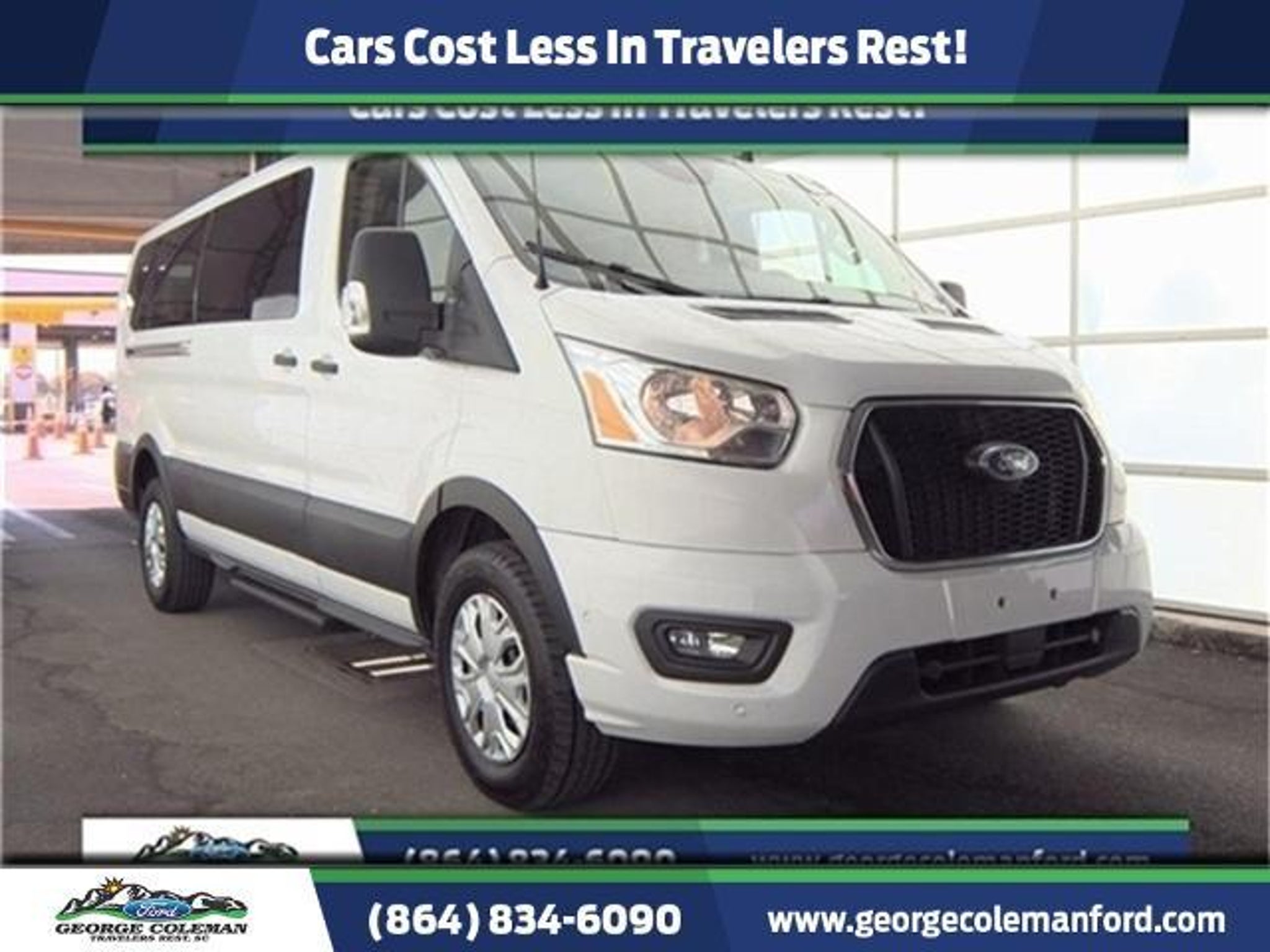 2022 Ford Transit-350 XLT ** NAVIGATION (NAVI/GPS) **, Keyless Entry, ** Apple CarPlay **, *ONE OWNER*, Cruise Control, Reverse Back Up Sensors, Rear A/C and Heat, Power Equipment Group, Running Boards, Transit-350 XLT, Passenger Van, V6, 10-Speed Automatic with Overdrive, RWD, Oxford White, Gray Cloth, 4-Wheel Disc Brakes, ABS brakes, Air Conditioning, Automatic temperature control, Brake assist, Driver's Seat Mounted Armrest, Dual front impact airbags, Dual front side impact airbags, Ebony Cloth Bucket Seats, Electronic Air Temperature Control, Electronic Stability Control, Front Bucket Seats, Fully automatic headlights, Navigation system: Connected Navigation, Occupant sensing airbag, Order Code 302A, Panic alarm, Power door mirrors, Power Running Boards, Power steering, Power windows, Privacy Glass, Radio: AM/FM Stereo w/SYNC 4/SiriusXM w/360L/Nav, Rear air conditioning, Rear window defroster, Remote keyless entry, Speed control, Steering wheel mounted audio controls, Tilt steering wheel, Traction control, Variably intermittent wipers. CARFAX One-Owner. Odometer is 32433 miles below market average! XLT Certification Program Details: Ford Blue Advantage: Blue Certified * 139 Point Inspection * Transferable Warranty * Vehicle History * Warranty Deductible: $100 * Roadside Assistance * Limited Warranty: 3 Month/4,000 Mile (whichever comes first) after new car warranty expires or from certified purchase date * and 11,000 FordPass Rewards Points to use toward first maintenance visit *Cars Cost Less In Travelers Rest!! **Have A FREE VEHICLE HISTORY REPORT sent directly to your email upon request or view IMMEDIATELY at our home website www.georgecolemanford.com ** Come by soon to drive this vehicle or EMAIL SMOSTELLER@COLEMANFORD.NET for more information!! George Coleman Ford has been operating continuously in our present location since 1930!
