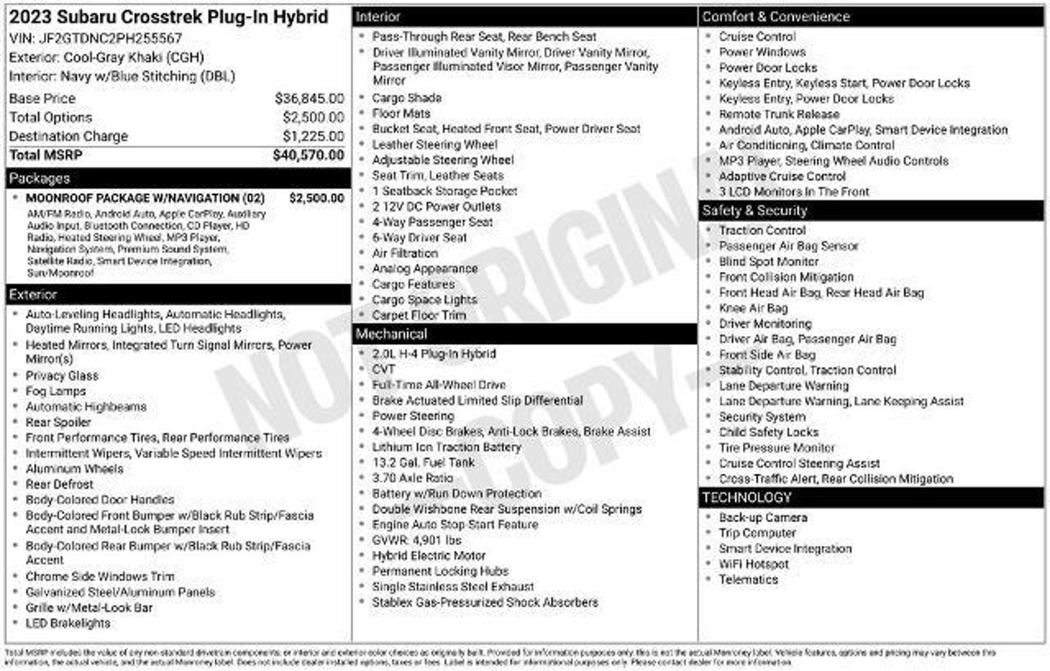 **2023**Subaru**Crosstrek**Hybrid**AWD**Sunroof**Navigation**Heated Seats** Our 2023 Subaru Crosstrek Hybrid AWD in Cool-Gray Khaki is here to help you save gas as you enjoy the great outdoors! Powered by a 2.0 Liter BOXER 4 Cylinder and an Electric Motor offering a combined 148hp to a Lineartronic CVT brisk acceleration. This All Wheel Drive SUV also achieves nearly 35mpg combined in hybrid mode with an extra EV driving range of nearly 17 miles. You can get a charge out of our Crosstrek's design, too, with its lightweight 18-inch alloy wheels, adaptive LED headlights/fog lamps, bold fender cladding, low-profile roof rails, a sunroof, and heated power mirrors with built-in turn signals. Blending luxury and versatility, our Hybrid cabin has heated leather front seats with blue stitching, six-way power for the driver, a leather-wrapped steering wheel, automatic climate control, keyless entry/ignition, and ample cargo space. Staying connected is a breeze with Starlink infotainment technology, an 8-inch touchscreen, navigation, WiFi compatibility, Android Auto, Apple CarPlay, Bluetooth, voice recognition, and six-speaker sound system. Subaru meets your demand for modern safety with a rearview camera, blind-spot monitoring, and intelligent EyeSight features like automatic emergency braking, lane-departure alert, lane-centering assistance, adaptive cruise control, and more. Easy to love, our Crosstrek Limited is here to explore! Save this Page and Call for Availability. We Know You Will Enjoy Your Test Drive Towards Ownership!