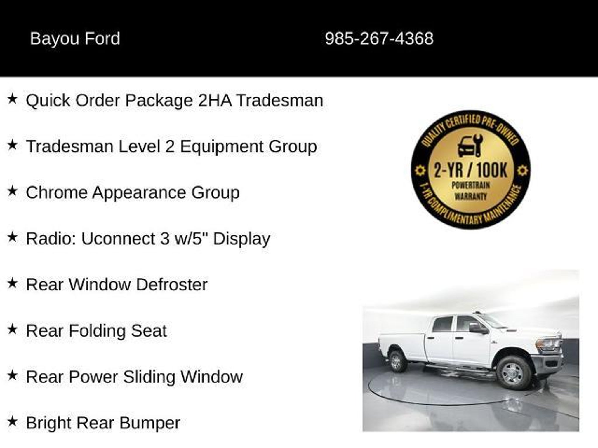 Our Service Department has successfully completed the comprehensive Bayou Automotive Vehicle Inspection Process. The following maintenance services have been performed: 100-point vehicle inspection Replacement of oil filter and engine oil Installation of a new engine air filter and cabin air filter New wiper blades fitted VIN etching applied for enhanced anti-theft protection Full vehicle detailing We are pleased to offer a complimentary a 2 year or 100,000-mile Powertrain Warranty on all used vehicles purchased. This warranty provides coverage for all major engine and transmission components, ensuring added confidence and peace of mind for our customers. Warranty coverage is valid for 2 years from the vehicles purchase date or until the odometer reaches 100,000 miles, whichever occurs first. - 6.7L I-6 Diesel Turbocharged (Cummins) - Chrome Appearance Group - 5th Wheel/Gooseneck Towing Prep Group - Black, Cloth 40/20/40 Bench Seat - Trailer Brake Control - Power Heated Fold Telescopic Mirrors This 2024 Ram 3500 Tradesman is powered by the renowned Cummins 6.7L I6 Turbodiesel engine, delivering exceptional performance and uncompromising capability. Paired with a smooth-shifting 6-speed automatic transmission and robust 4-wheel drive system, this truck is engineered to handle the toughest jobs with ease. The Chrome Appearance Group adds a touch of refined style, with bright chrome accents on the grille, bumpers, and wheel skins. For those with demanding towing needs, the 5th Wheel/Gooseneck Towing Prep Group ensures seamless integration with your preferred trailer setup. Inside, the Black cloth 40/20/40 split bench seat provides comfortable seating for up to six passengers, while the Trailer Brake Control and Power Heated Fold Telescopic Mirrors enhance towing and visibility. This well-equipped Tradesman model is a versatile workhorse, ready to tackle any challenge you throw its way. This 2024 Ram 3500 Tradesman has been meticulously inspected and certified by our expert technicians. You can drive with confidence, knowing this vehicle has undergone a rigorous 100-point inspection and received all necessary maintenance and reconditioning services. From the fresh oil change to the new cabin air filter, we've ensured this truck is in top condition and ready to serve you for years to come. Bayou Automotive is a locally owned and operated dealership committed to providing a no-hassle, transparent car buying experience. Our primary goal is to deliver outstanding service and ensure every customer enjoys a p