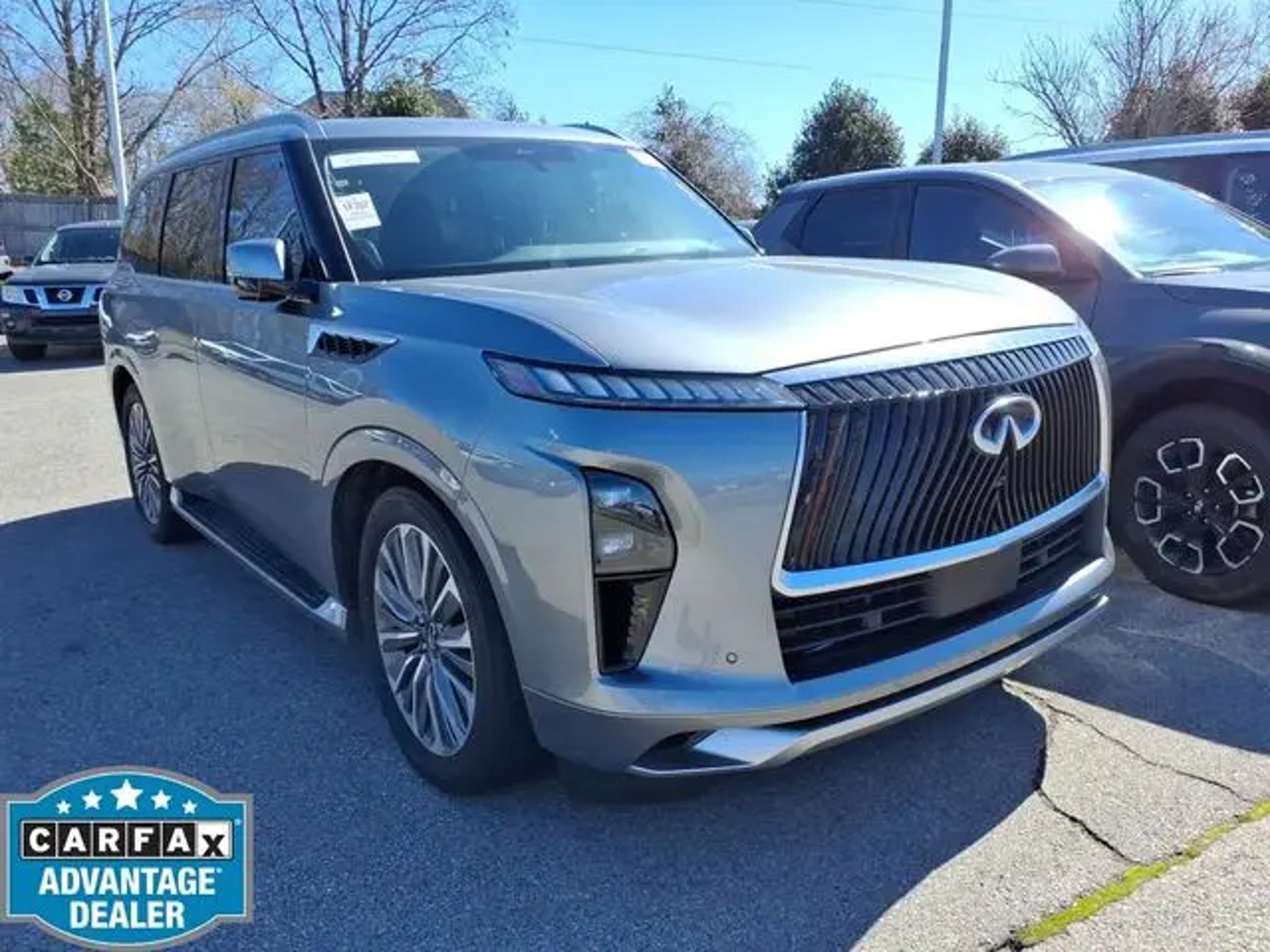 The 2025 INFINITI QX80 comes equipped with the following 3rd row seats: bench, 4-Wheel Disc Brakes, ABS brakes, Adaptive suspension, Air Conditioning, Alloy wheels, AM/FM radio: SiriusXM with 360L, Anti-whiplash front head restraints, Apple CarPlay/Android Auto, Audio memory, Auto High-beam Headlights, Auto tilt-away steering wheel, Auto-dimming door mirrors, Auto-dimming Rear-View mirror, Auto-leveling suspension, Automatic temperature control, Brake assist, Bumpers: body-color, Center Front Spoiler, Climate Controlled Front Bucket Seats w/Massage, Compass, Delay-off headlights, Driver door bin, Driver vanity mirror, Dual front impact airbags, Dual front side impact airbags, Electronic Stability Control, Emergency communication system: INFINITI InTouch, Four wheel independent suspension, Front anti-roll bar, Front Bucket Seats, Front Center Armrest, Front dual zone A/C, Front reading lights, Fully automatic headlights, Garage door transmitter: myQ Connected Garage, Genuine wood dashboard insert, Genuine wood door panel insert, Heads-Up Display, Heated door mirrors, Heated front seats, Heated rear seats, Heated steering wheel, HVAC memory, Illuminated entry, Knee airbag, Leather steering wheel, Literature Kit, Low tire pressure warning, Memory seat, Navigation system: Google Built-in, Occupant sensing airbag, Outside temperature display, Overhead airbag, Overhead console, Panic alarm, Passenger door bin, Passenger vanity mirror, Power door mirrors, Power driver seat, Power Liftgate, Power moonroof, Power passenger seat, Power steering, Power windows, Premium Paint, Radio data system, Radio: Klipsch Reference Premiere Audio System, Rain sensing wipers, Rear air conditioning, Rear anti-roll bar, Rear reading lights, Rear seat center armrest, Rear window defroster, Rear window wiper, Reclining 3rd row seat, Remote keyless entry, Security system, Semi-Aniline Premium Leather Seating Surfaces, Speed control, Speed-sensing steering, Split folding rear seat, Spoiler, Steering wheel memory, Steering wheel mounted audio controls, Tachometer, Telescoping steering wheel, Tilt steering wheel, Traction control, Trip computer, Turn signal indicator mirrors, Variably intermittent wipers, Ventilated front seats, Ventilated rear seats, and Wheels: 22 x 8 Cast Aluminum Alloy. 2025 INFINITI QX80 CARFAX One-Owner. Gray 2025 INFINITI QX80 SENSORY 4WD 9-Speed Automatic 3.5L V6 DOHC 24V Call us today to schedule your VIP test drive!