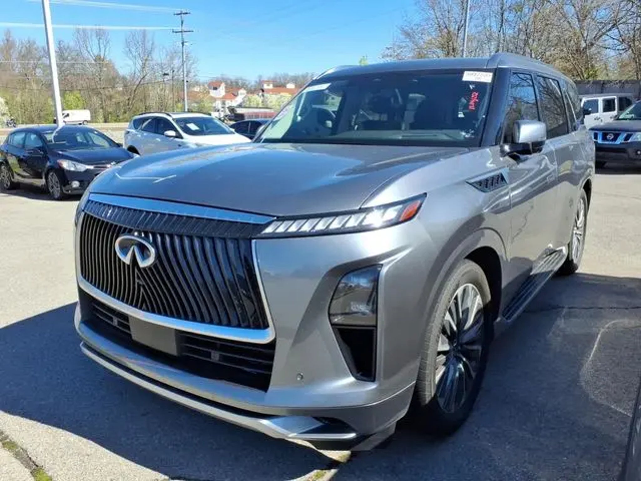 The 2025 INFINITI QX80 comes equipped with the following 3rd row seats: bench, 4-Wheel Disc Brakes, ABS brakes, Adaptive suspension, Air Conditioning, Alloy wheels, AM/FM radio: SiriusXM with 360L, Anti-whiplash front head restraints, Apple CarPlay/Android Auto, Audio memory, Auto High-beam Headlights, Auto tilt-away steering wheel, Auto-dimming door mirrors, Auto-dimming Rear-View mirror, Auto-leveling suspension, Automatic temperature control, Brake assist, Bumpers: body-color, Center Front Spoiler, Climate Controlled Front Bucket Seats w/Massage, Compass, Delay-off headlights, Driver door bin, Driver vanity mirror, Dual front impact airbags, Dual front side impact airbags, Electronic Stability Control, Emergency communication system: INFINITI InTouch, Four wheel independent suspension, Front anti-roll bar, Front Bucket Seats, Front Center Armrest, Front dual zone A/C, Front reading lights, Fully automatic headlights, Garage door transmitter: myQ Connected Garage, Genuine wood dashboard insert, Genuine wood door panel insert, Heads-Up Display, Heated door mirrors, Heated front seats, Heated rear seats, Heated steering wheel, HVAC memory, Illuminated entry, Knee airbag, Leather steering wheel, Literature Kit, Low tire pressure warning, Memory seat, Navigation system: Google Built-in, Occupant sensing airbag, Outside temperature display, Overhead airbag, Overhead console, Panic alarm, Passenger door bin, Passenger vanity mirror, Power door mirrors, Power driver seat, Power Liftgate, Power moonroof, Power passenger seat, Power steering, Power windows, Premium Paint, Radio data system, Radio: Klipsch Reference Premiere Audio System, Rain sensing wipers, Rear air conditioning, Rear anti-roll bar, Rear reading lights, Rear seat center armrest, Rear window defroster, Rear window wiper, Reclining 3rd row seat, Remote keyless entry, Security system, Semi-Aniline Premium Leather Seating Surfaces, Speed control, Speed-sensing steering, Split folding rear seat, Spoiler, Steering wheel memory, Steering wheel mounted audio controls, Tachometer, Telescoping steering wheel, Tilt steering wheel, Traction control, Trip computer, Turn signal indicator mirrors, Variably intermittent wipers, Ventilated front seats, Ventilated rear seats, and Wheels: 22 x 8 Cast Aluminum Alloy. 2025 INFINITI QX80 CARFAX One-Owner. Gray 2025 INFINITI QX80 SENSORY 4WD 9-Speed Automatic 3.5L V6 DOHC 24V Call us today to schedule your VIP test drive!