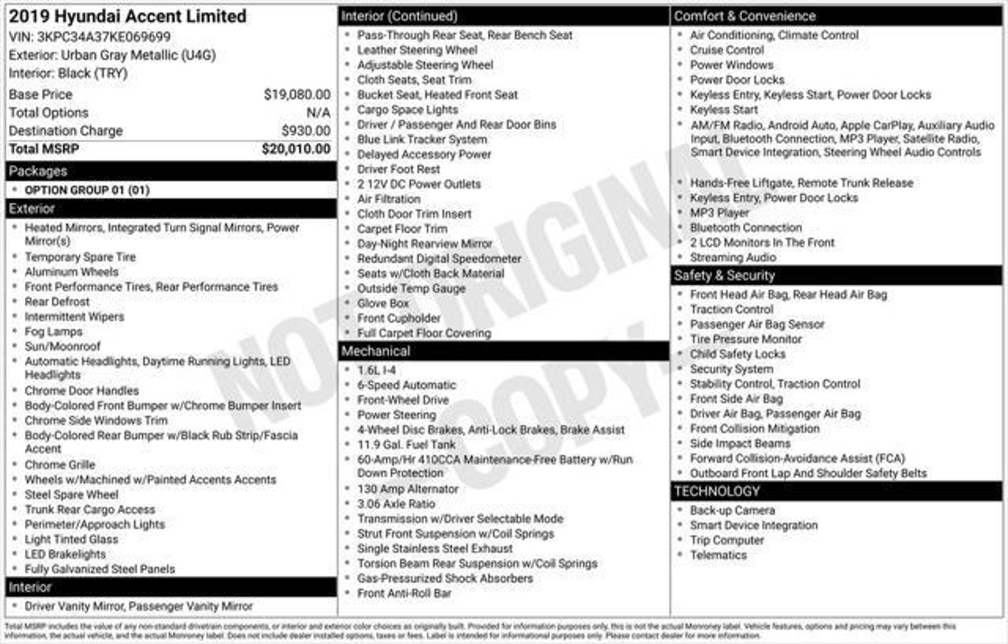 Details > 2019 Hyundai Accent Limited 4DR Sedan For Sale in Columbus, OH Private Party Sellers Click here to place your ad now! You auta tell them you saw the ad in AutaBuy when you call or email. 1/35 2/35 3/35 4/35 5/35 6/35 7/35 8/35 9/35 10/35 11/35 12/35 13/35 14/35 15/35 16/35 17/35 18/35 19/35 20/35 21/35 22/35 23/35 24/35 25/35 26/35 27/35 28/35 29/35 30/35 31/35 32/35 33/35 34/35 35/35 View 35 Photos View All Add to My Garage Parked in Your Garage! Germain Hyundai Contact Seller: I would like to: Make Offer Check Availability Ask A Question Request More Photos Check Financing Options Send a copy of this message to me Add this listing to my garage Send to Mobile Mileage 80,666 Exterior Color Urban Gray Metallic Interior Color Black Doors 4 Engine 1.6L I4 Transmission 6 Speed Auto Stock # HTKE069699 VIN 3KPC34A37KE069699 Estimated Monthly Payment $226 mo Apply Now J.J. Best Banc & Co. 2019 Hyundai Accent Limited 4DR Sedan Description: Germain Hyundai · Mileage: 80,666 · Color: Urban Gray Metallic Price: $13,000. Mileage 80,666 Exterior Color Urban Gray Metallic Interior Color Black Doors 4 Engine 1.6L I4 Transmission 6 Speed Auto Stock # HTKE069699 VIN 3KPC34A37KE069699 Estimated Monthly Payment $226 mo Apply Now J.J. Best Banc & Co. Add to My Garage Parked in Your Garage! Message Seller Germain Hyundai Contact Seller: I would like to: Make Offer Check Availability Ask A Question Request More Photos Check Financing Options Send a copy of this message to me Add this listing to my garage Offered for sale by Germain Hyundai COLUMBUS, OH Price: $13,000. Offered for sale by Germain Hyundai COLUMBUS, OH [entire inventory] Ask Auta Intelligence The first collector-car AI built directly into a classic car marketplace What factory options were available on this model? How many Accents were produced in Gray? What does this VIN number tell me? When was this model first introduced? Can you show me more cars for a similar price? How easy are parts to find for this model? What engine options did these come with? What trim levels were available for this model? What kind of mileage do these get? How far is this from me? What colors did these come in? How many of these were produced? Where is this located? What transmission options did these offer? Tell me the history on this model Do you have a similar car to sell? List It Now! Questions about this car? Ask Auta Intelligence for production numbers, available options, etc. · Subscribe to AutaBuy! · Send a Gift Subscription Notice to a Friend