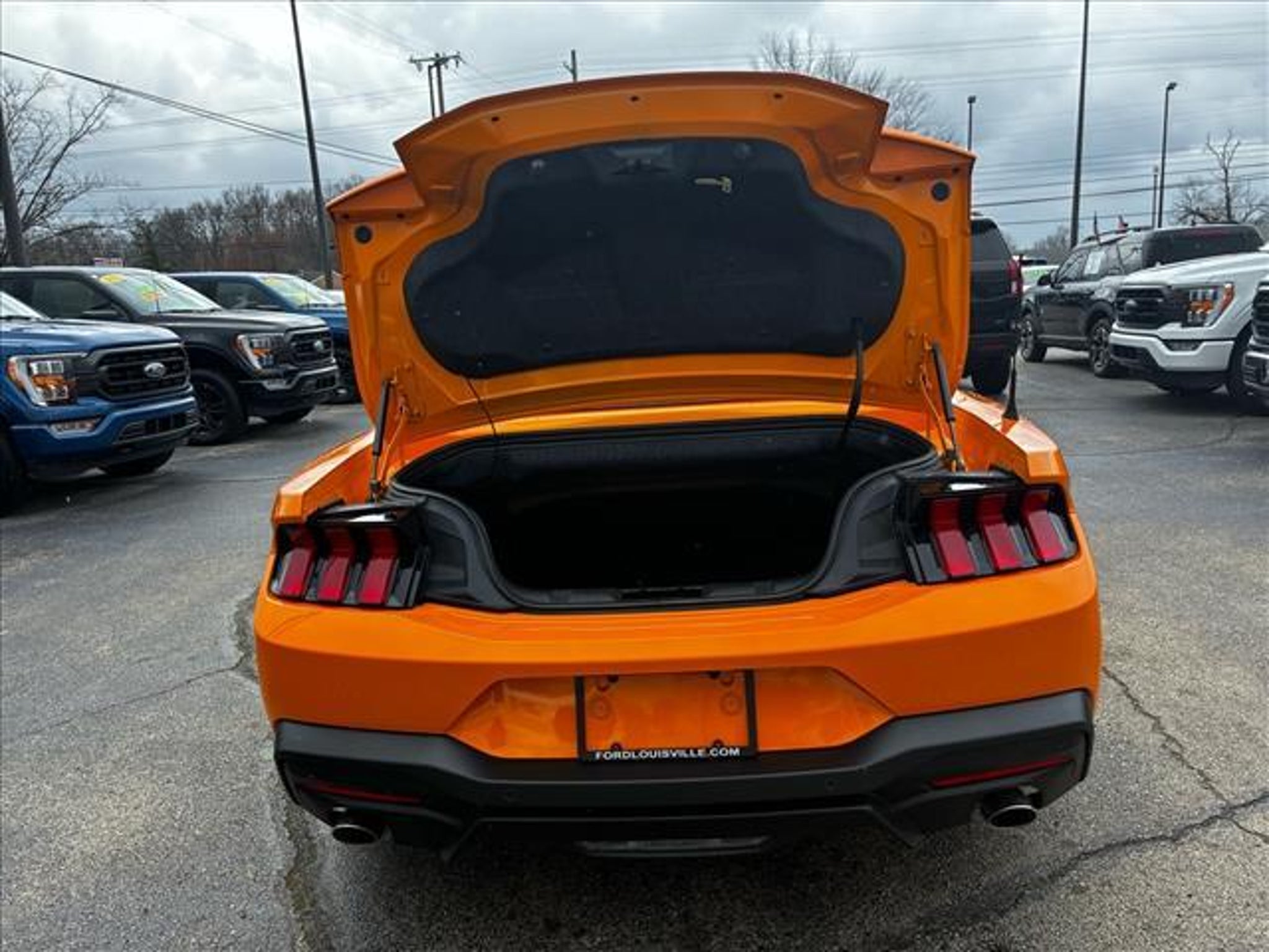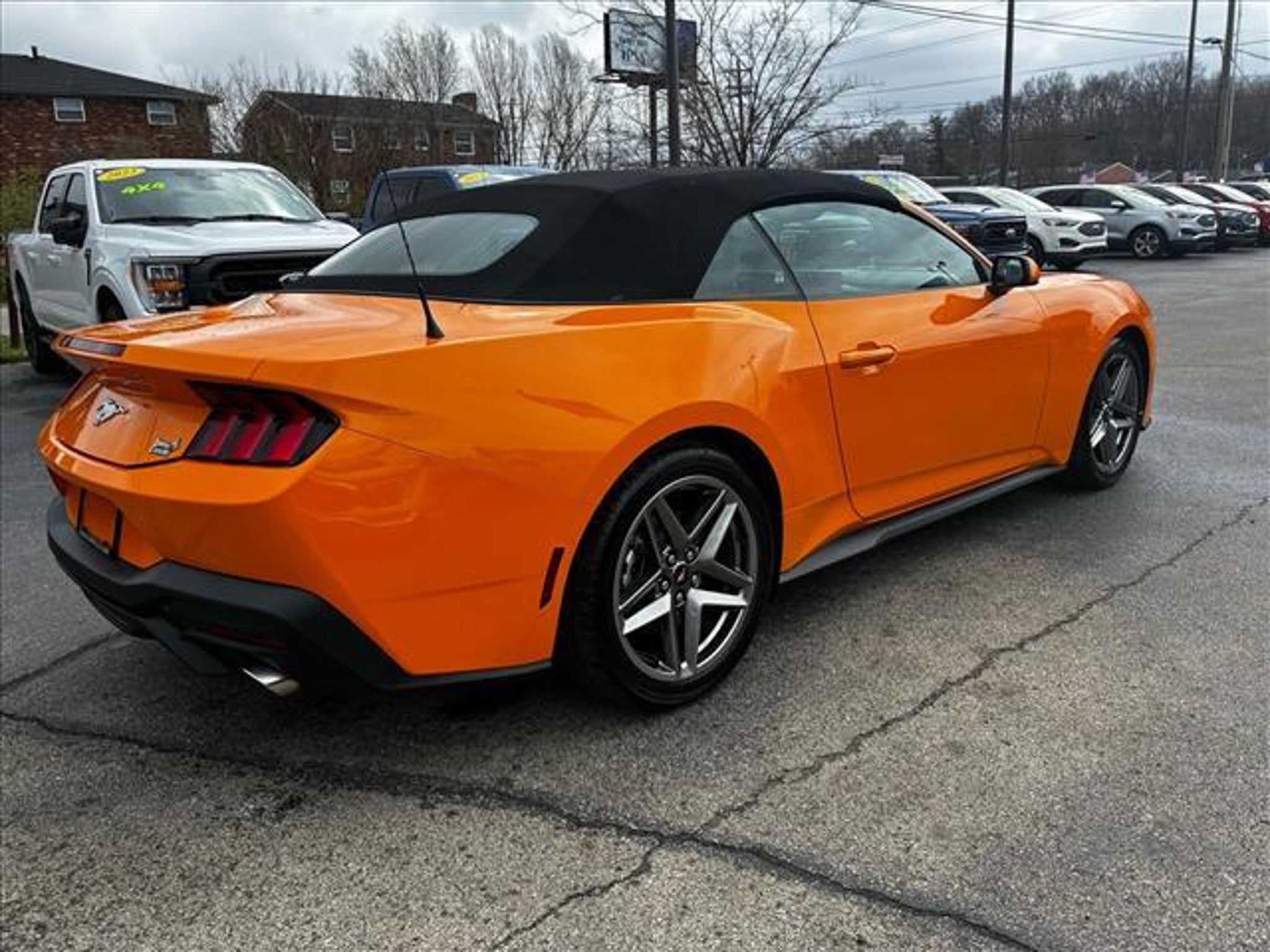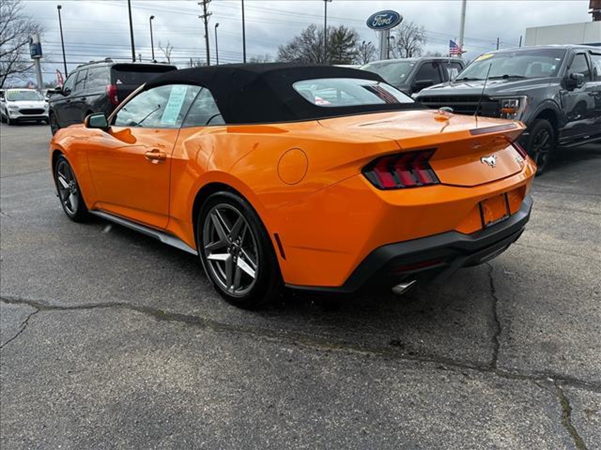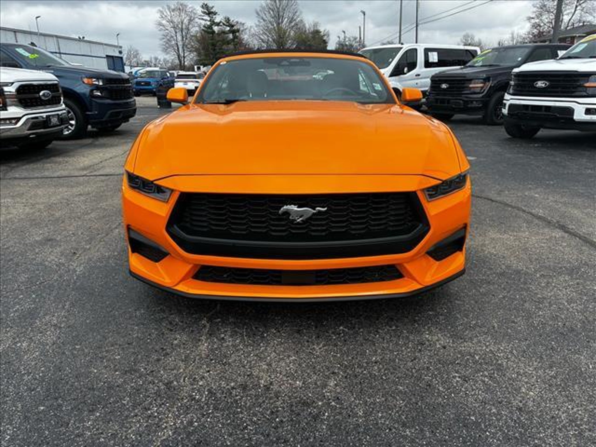 This vehicle is a 2026 Ford Mustang EcoBoost Premium Convertible with a carfax report available. It has driven 10,796 miles and is powered by a 2.3 liter EcoBoost Turbo I4 315hp 350 lb-ft engine with a turbocharged RWD drivetrain. The exterior of the car is orange and it has a black interior. It has great fuel economy with 22 mpg in the city and 33 mpg on the highway, making it an efficient choice for anyone looking for a reliable ride. Blind spot sensor and hill start assist are also included for added safety and convenience. This car is sure to turn heads wherever it goes! Contact Details: Town and Country Ford - Louisville, 6015 Preston Hwy, Louisville, KY, 40219, tbradley@tacford.com, (502) 964-8131.