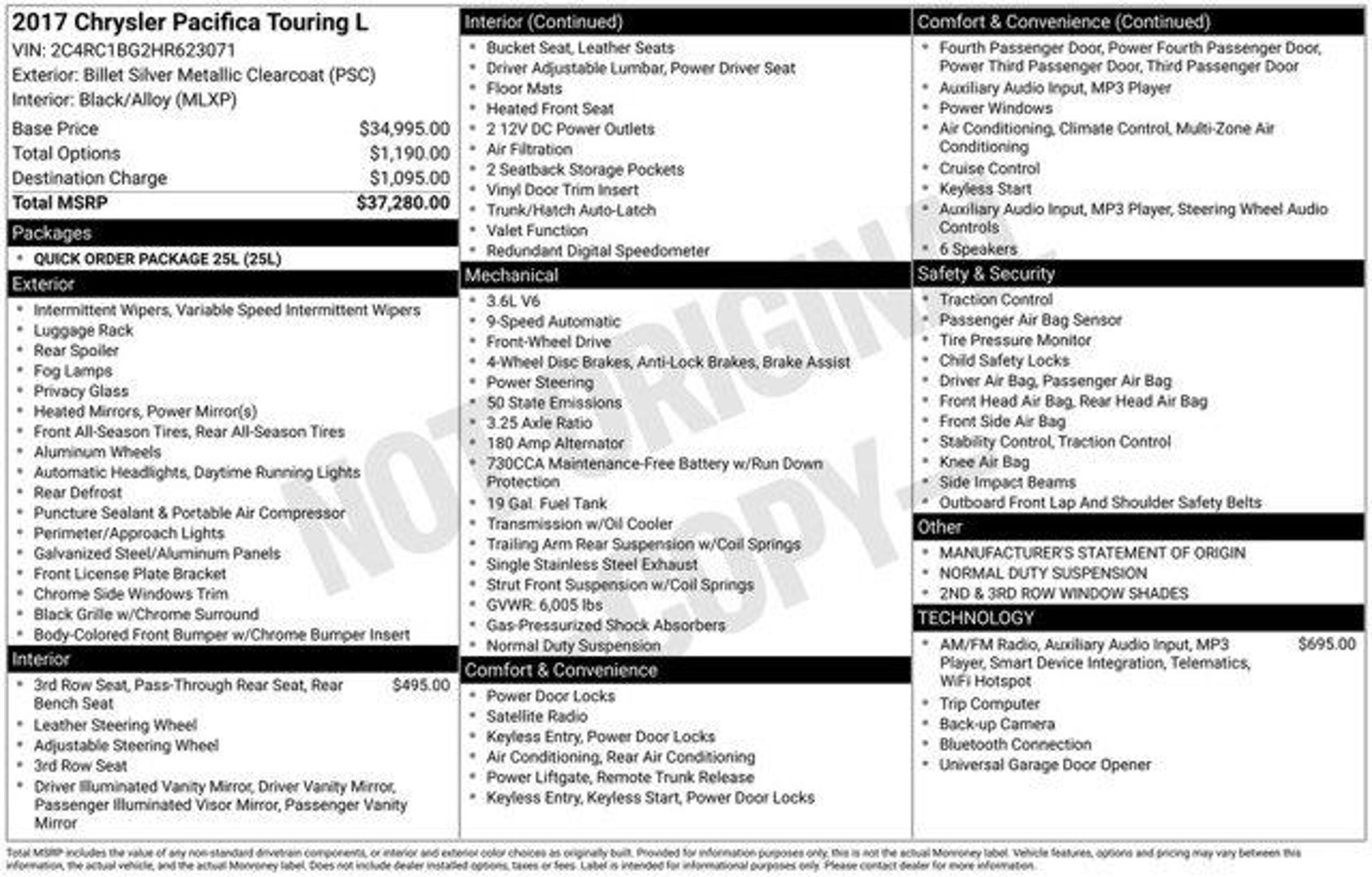 Discover the Versatility and Sophistication of the 2017 Chrysler Pacifica Touring L. This captivating minivan offers a refined driving experience, cutting-edge technology, and a wealth of premium features that will elevate your family's journeys.Equipped with a powerful 3.6L V6 engine and 9-speed automatic transmission, the Pacifica Touring L delivers an impressive blend of performance and efficiency, with an EPA-estimated 28 MPG on the highway. Indulge in the convenience of advanced connectivity, including the Uconnect 3C system with an 8.4-inch touchscreen display, navigation-capable technology, and SiriusXM satellite radio.- Uconnect 3C with 8.4 Display- 8 Passenger Seating- Blind Spot & Cross Path Detection- ParkSense Rear Park Assist with Stop- Alloy WheelsThe Pacifica Touring L's thoughtful design caters to your family's needs. Enjoy the comfort of dual-zone automatic climate control, power-adjustable driver's seat, and the versatility of split-folding third-row seats. Enhance your journeys with the convenience of a power liftgate and the added peace of mind provided by advanced safety features, including Blind Spot Monitoring and Rear Park Assist.Experience the perfect blend of style, technology, and functionality in the 2017 Chrysler Pacifica Touring L. This exceptional minivan is ready to elevate your family's driving experience. Visit our showroom today and let us demonstrate how the Pacifica Touring L can transform the way you move through life.With its striking silver exterior and well-appointed interior, the 2017 Pacifica Touring L is a true head-turner. Imagine the pride and confidence you'll feel behind the wheel of this sophisticated and capable family vehicle. Discover the joy of owning a Pacifica Touring L and let it become the centerpiece of your family's adventures.Don't miss the opportunity to make this exceptional Pacifica Touring L your own. Contact us today to schedule a test drive and experience the difference for yourself. We're confident you'll be impressed by the Pacifica's unparalleled combination of style, technology, and functionality.