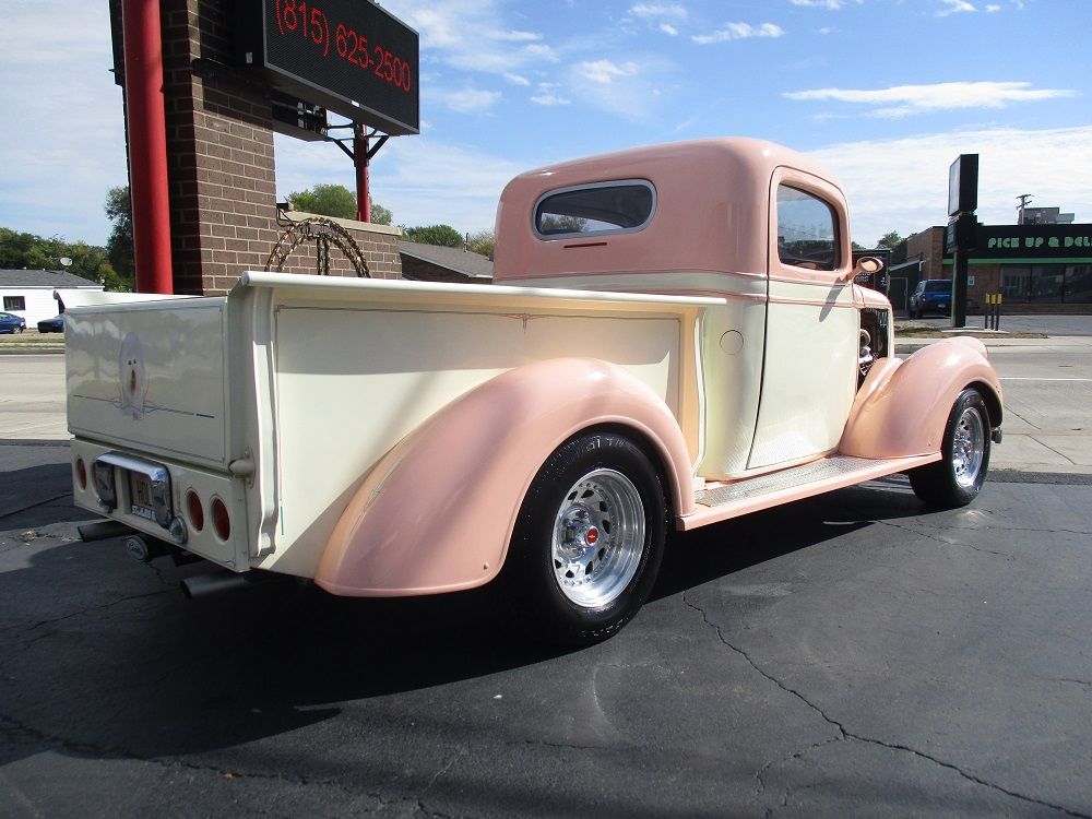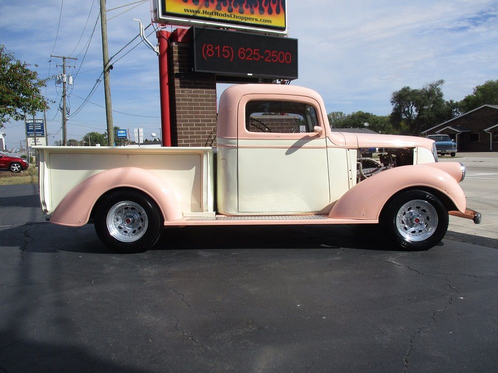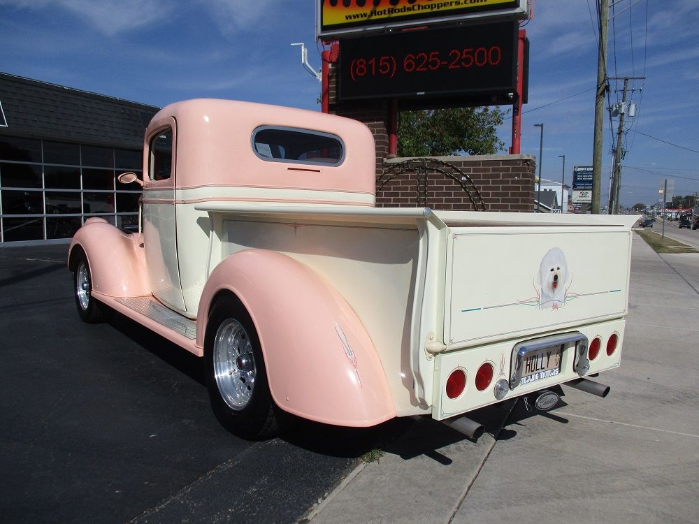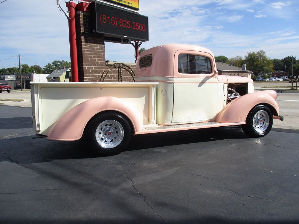 The 1937 Chevrolet truck introduced a more stylish, Art Deco-influenced design and an all-steel cab, making it a pivotal vehicle in the move toward more comfortable and modern pickups. This particular example was converted into a high-end street rod with state-of-the-art amenities. The heart of this sweet truck is a 500ci V8 Cadillac engine and T400 tranny from a 1976 El Dorado. The engine was bored out to 505ci and both it and the tranny were completely rebuilt before being stuffed in this sweet truck. It has a custom 2” X 4” boxed tube chassis fit with a 4-wheel disc brakes, front and rear independent suspension and a rear end all from a 1977 Jaguar. The cab, floor pan and doors were all extended 6 ½” giving you a little extra stretch. You will also appreciate the sunroof, the suicide doors with shaved door handles, electronic and manual door poppers, custom fenders, custom running boards and custom fender mounted headlight buckets, a rolled rear pan as well as the blinkers frenched into the custom mirrors the frenched in 3rd brake light and frenched in gas cap. The engine is fit with top-of-the-line performance goodies that are all chrome or polished. It is fed via an Edelbrock performance carb with electric choke and a Performer intake. Spark is handled by a Mallory Hi-Fire ignition, it has a set of 2 ½” Sanderson ceramic coated headers and it sounds just plain nasty ripping through its Thrush performance exhaust. It has full custom leather interior with Auto Meter gauges, a custom center console that houses a Kenwood BT stereo and speakers as well a variety of controls including the Vintage Air HVAC controls. You will also appreciate IDIDIT chrome tilt steering column with power steering and push-to-start ignition. Both the hood and custom tonneau cover have power actuators that you can raise or lower from inside the cab. The exterior is a two-tone Tangerine and Vanilla Shake with custom pinstriping, and tinted windows. The portrait of Holly on the tail gate as well as the names on the doors are on top of the clear coat so that they can be removed without painting. The appearance is all pulled together by a sweet set of American Racing polished rims wrapped in a set of BF Goodrich Radial TA’s. The bad news is that both of the doors were over extended enabling the back side of the doors to slightly crease the cab corners. There is not paint damage on the passenger sider but there is some minor paint damage on the driver side. We were planning to have this all fixed and list the truck for $49,900. Instead, we have decided to reduce the price by $15,000.00 and sell it as-is. Almost $100K has been invested in this truck and it has been driven just over 1,000 miles representing a chance for someone to get one heck of a deal!
