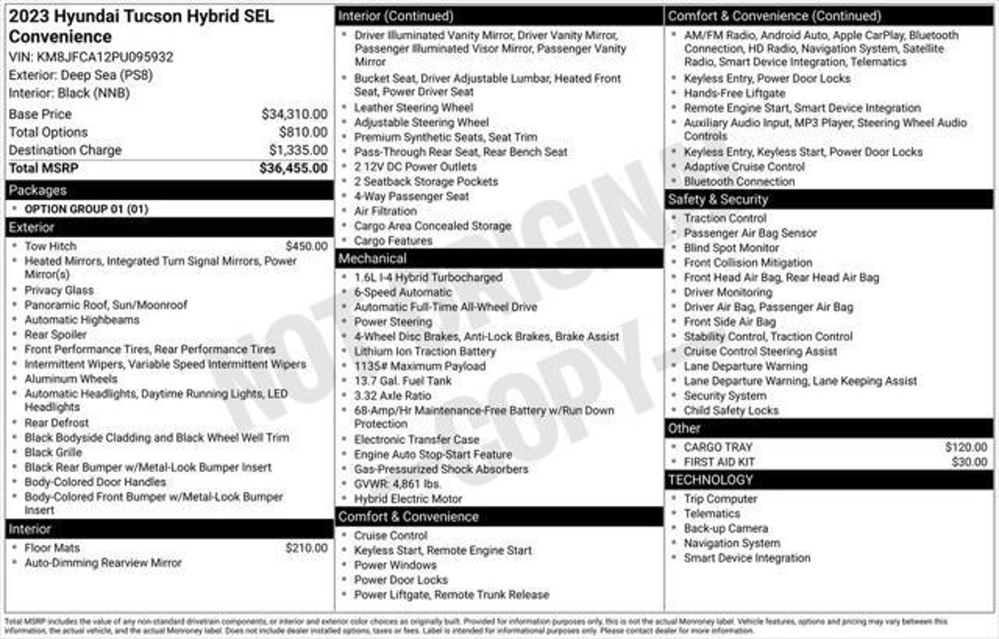 Discover the perfect blend of style, efficiency, and advanced technology in this stunning 2023 Hyundai Tucson Hybrid SEL Convenience. This exceptional SUV offers a compelling combination of performance, comfort, and cutting-edge features that make it an ideal choice for the modern driver. Boasting a dynamic I4 engine paired with a 6-speed automatic transmission and all-wheel drive, the Tucson Hybrid delivers an impressive 37 MPG in the city and 36 MPG on the highway, ensuring exceptional fuel economy without compromising power or capability. Elevate your driving experience with a host of premium features, including: "¢ ALL WHEEL DRIVE "¢ NAVIGATION "¢ REMOTE START "¢ HEATED FRONT ROW "¢ APPLE CARPLAY/ANDROID AUTO "¢ REAR BACK UP CAMERA "¢ PANORAMIC SUNROOF "¢ SIRIUS XM "¢ BLUETOOTH "¢ TOW HITCH This Tucson Hybrid also comes equipped with a comprehensive suite of advanced safety technologies, such as Forward Collision-Avoidance Assist, Lane Keeping Assist, Lane Following Assist, and Blind-Spot Collision-Avoidance Assist, ensuring you and your loved ones enjoy a secure and confident journey. Step inside and be captivated by the Tucson Hybrid's sophisticated interior, featuring a power driver's seat, automatic temperature control, and a stunning panoramic sunroof that floods the cabin with natural light. Connectivity is seamless with the intuitive AM/FM/HD/SiriusXM audio system, Apple CarPlay, and Android Auto integration. Whether you're commuting, embarking on a road trip, or navigating the demands of daily life, this 2023 Hyundai Tucson Hybrid SEL Convenience is the perfect companion. With its impressive fuel efficiency, advanced technology, and exceptional versatility, it's the ideal choice for discerning drivers seeking a truly remarkable SUV experience. Welcome to Castle Hyundai Oak Lawn"”your trusted local Hyundai dealership in Oak Lawn, IL. We proudly serve drivers in Burbank, Evergreen Park, Chicago Ridge, and surrounding Chicagoland communities with a reliable and customer-focused car-buying experience. Shop our extensive selection of new Hyundai models, certified pre-owned Hyundai vehicles, and quality used cars, including budget-friendly options under $10,000. Browse our Hyundai inventory online or visit our Oak Lawn showroom to see why so many customers choose Castle Hyundai for the best deals and service. We're your one-stop destination for sales, financing, and automotive support. Contact our team today at . Price does not include tax, title, and a doc fee of $367.70.