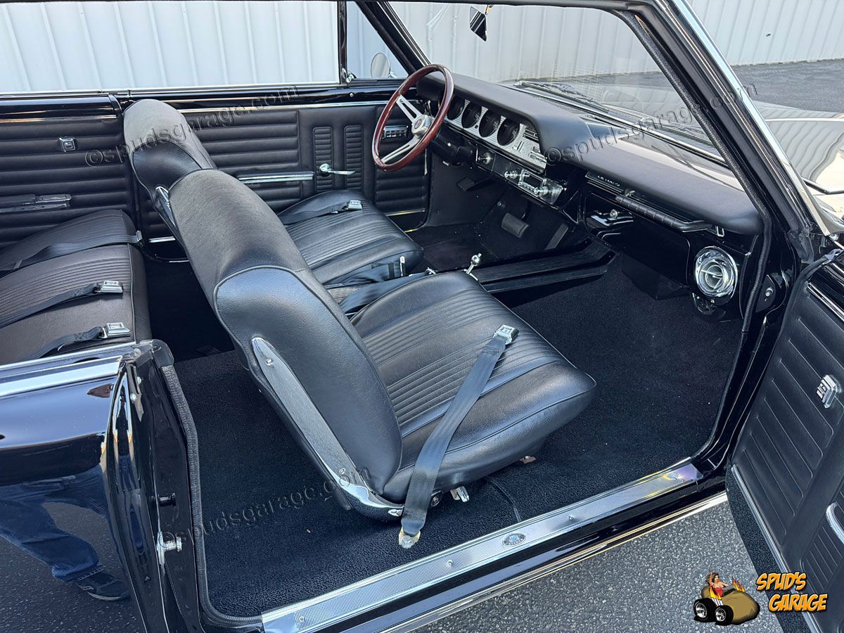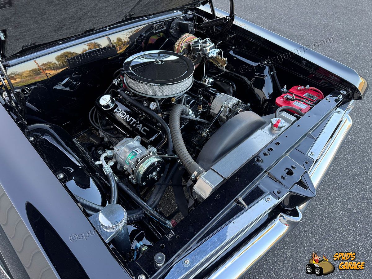 Exterior: Model #64-2237 2dr Sport Coupe (hardtop), original rust-free CA body, mild resto-mod, body-off frame rotisserie restoration, professional Onyx Black base-clear paint, trim-bright-work and trim restored, dual chrome sport mirrors, steel 15" body-color wheels, Pontiac Motor Division dog-dish hub caps, BF Goodrich Radial TA tires (Front 205/60R15-Rear 245/60R15).