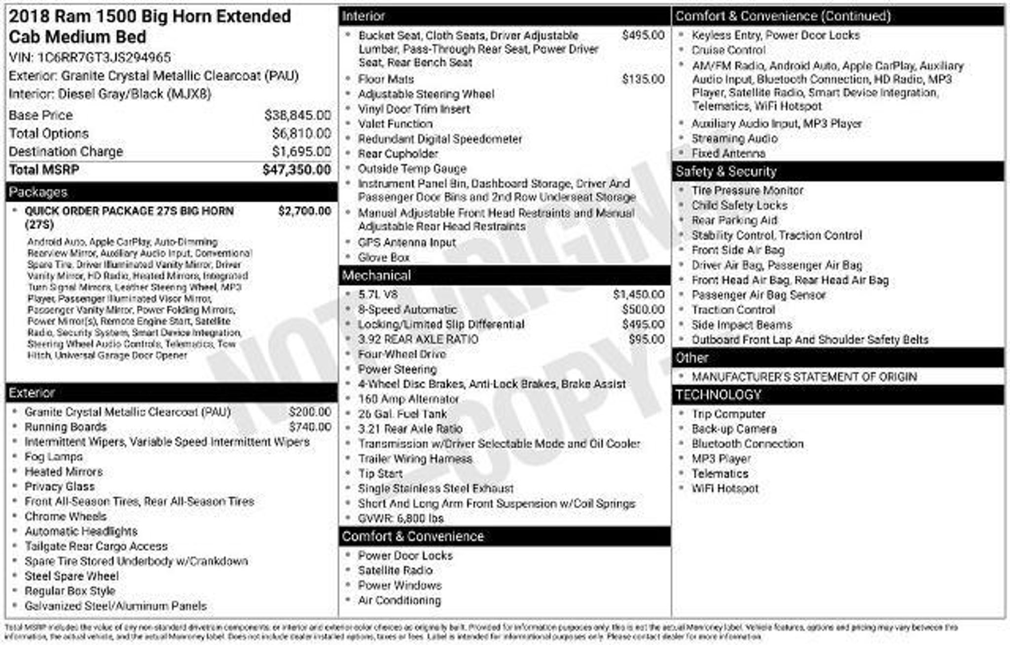 Recent Arrival! CARFAX One-Owner. Murray Ford Superstore of Starke is excited to offer this great-looking 2018 Ram 1500 in Granite Crystal Metallic Clearcoat This vehicle is readily available and comes with the following Big Horn Regional Package, Quick Order Package 27S Big Horn (1-Yr SiriusXM Guardian Trial, 115V Auxiliary Power Outlet, 40/20/40 Split Bench Seat, 8.4 Touchscreen Display, Apple CarPlay, Auto-Dimming Exterior Mirrors, Auto-Dimming Rear-View Mirror, Big Horn Badge, Bright/Bright Billets Grille, Charge Only Remote USB Port, Class IV Receiver Hitch, Dual Rear Exhaust w/Bright Tips, Electric Shift-On-Demand Transfer Case, Electroluminescent Instrument Cluster, Exterior Mirrors Courtesy Lamps, Exterior Mirrors w/Supplemental Signals, Folding Flat Load Floor Storage, Front Armrest w/3 Cupholders, Front Center Seat Cushion Storage, Front Fog Lamps, Glove Box Lamp, Google Android Auto, GPS Antenna Input, HD Radio, Integrated Voice Command w/Bluetooth, Leather Wrapped Steering Wheel, LED Bed Lighting, Media Hub (2 USB, AUX), Overhead Console w/Garage Door Opener, ParkSense Rear Park Assist System, Power 10-Way Driver Seat, Power Heated Fold-Away Mirrors, Power Lumbar Adjust, Power-Folding Mirrors, Premium Cloth 40/20/40 Bench Seat, Radio: Uconnect 4C w/8.4 Display, Rear 60/40 Split Folding Seat, Rear Dome w/On/Off Switch Lamp, Remote Start System, Security Alarm, SiriusXM Satellite Radio, Steering Wheel Mounted Audio Controls, Sun Visors w/Illuminated Vanity Mirrors, Universal Garage Door Opener, USB Host Flip, and Wheels: 20 x 8 Aluminum Chrome Clad), Ford Blue Advantage: Blue Certified Certified, 3.92 Rear Axle Ratio, 4-Wheel Disc Brakes, 6 Speakers, ABS brakes, Active Grille Shutters, Air Conditioning, Alloy wheels, AM/FM radio: SiriusXM, Anti-Spin Differential Rear Axle, Black Exterior Mirrors, Brake assist, Bumpers: chrome, Center Hub, Class IV Receiver Hitch (DISC), Compass, Delay-off headlights, Driver door bin, Dual front impact airbags, Dual front side impact airbags, Electronic Shift, Electronic Stability Control, Exterior Mirrors w/Heating Element, Front & Rear Rubber Floor Mats, Front anti-roll bar, Front Center Armrest w/Storage, Front reading lights, Front wheel independent suspension, Fully automatic headlights, Heated door mirrors, Illuminated entry, Low tire pressure warning, Manufacturer's Statement of Origin, Occupant sensing airbag, Outside temperature display, Overhead airbag, Overhead console, Panic alarm, ParkView Rear Back-Up Camera, Passenger door bin, Passenger vanity mirror, Power door mirrors, Power steering, Power windows, Radio data system, Rear anti-roll bar, Rear step bumper, Remote keyless entry, Speed control, Tachometer, Tilt steering wheel, Tip Start, Traction control, Trip computer, Variably intermittent wipers, Voltmeter, and Wheel to Wheel Side Steps; Certification Program Details: Ford Blue Advantage: Blue Certified * 139 Point Inspection * Transferable Warranty * Vehicle History * Warranty Deductible: $100 * Roadside Assistance * Limited Warranty: 3 Month/4,000 Mile (whichever comes first) after new car warranty expires or from certified purchase date * and 11,000 FordPass Rewards Points to use toward first maintenance visit 15 Year 150,000 mile warranty at no cost applies to all vehicles excluding Transit Vans, DRW Trucks, any SVT Models, or similar vehicles. See sales for details! All vehicles will have a $999.00 dealer fee added to the total sale price (excludes A,Z,D, and X plan customers). Taxes, tag, title fees and a $125 Electronic filling fee will be added to all vehicles in accordance with state laws of customers registering address. *** We make every effort to provide you with the most accurate, up-to-the-minute information, however it is your responsibility to verify with the Dealer that all details listed and installed options are accurate for this specific vehicle. To ensure accuracy, please contact the dealership to verify the exact options, features and prog