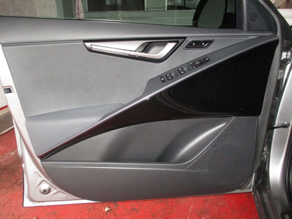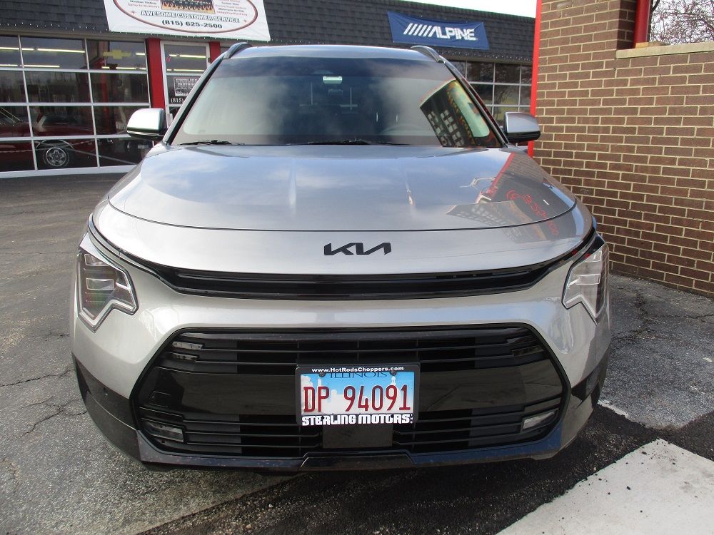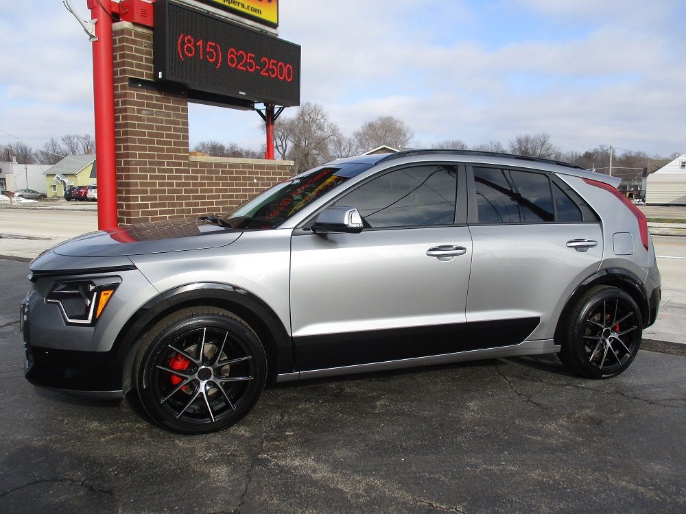 The Niro Hybrid is a compact crossover SUV that Kia introduced as a 2016 model. Introduced in 2023, the 2nd generation Niro features additional cargo space and is rated as the most economical hybrid SUV with a combined average fuel rating of 49 mpg as well as the subcompact SUV with the most cargo space. With the best-in-class driving range you can go further with fewer fill-ups without sacrificing a thrilling drive. The parallel hybrid system pairs an efficient 1.6L engine with an electric motor, a second-generation 6-speed dual-clutch automatic transmission that shifts gears quickly for seamless acceleration as well as regenerative braking technology. The SX Touring model is the top-of-the-line Niro model and includes features such as forward and rear collision avoidance, blind spot warning, lane assist, safe exit warning, smart cruise, front & rear park distance warning, highway driving assist, a 10.5” touchscreen stereo with Nav, CarPlay, Android Auto, BT, back-up camera, premium sound, Sirius/XM, a smart key, heated and ventilated front seats, a heated steering wheel, dual zone climate control, a power sunroof, LED projector headlights and fog lights, a power lift gate, 18” wheels, aluminum pedals, carpeted mats, an auto dimming mirror with home link and an interior light kit. We had the KIA emblems, the brushed stainless accents on both bumpers as well as the top side of the door handles painted gloss black and we had the upper chrome window trim painted matte black to