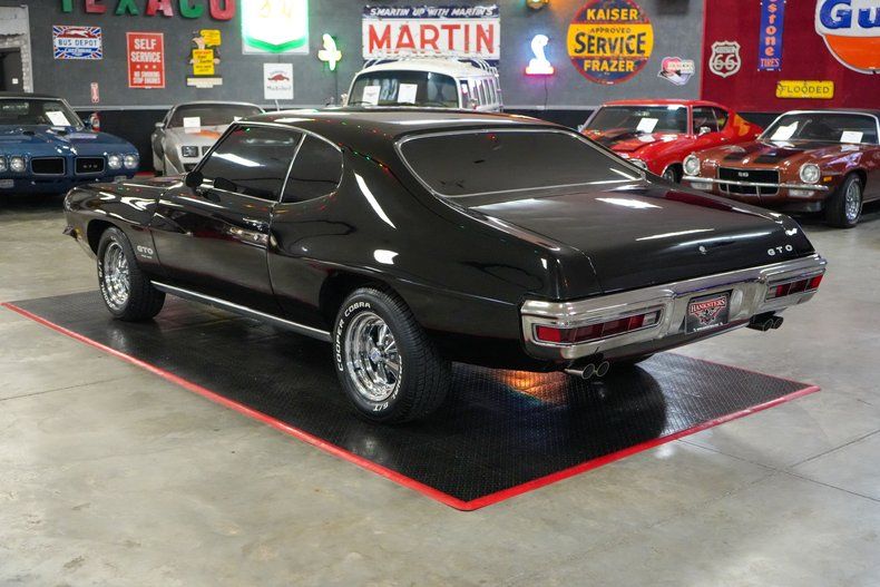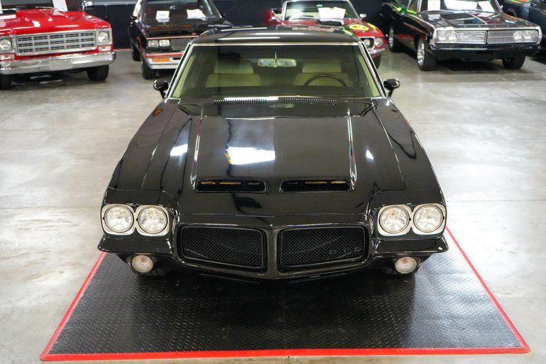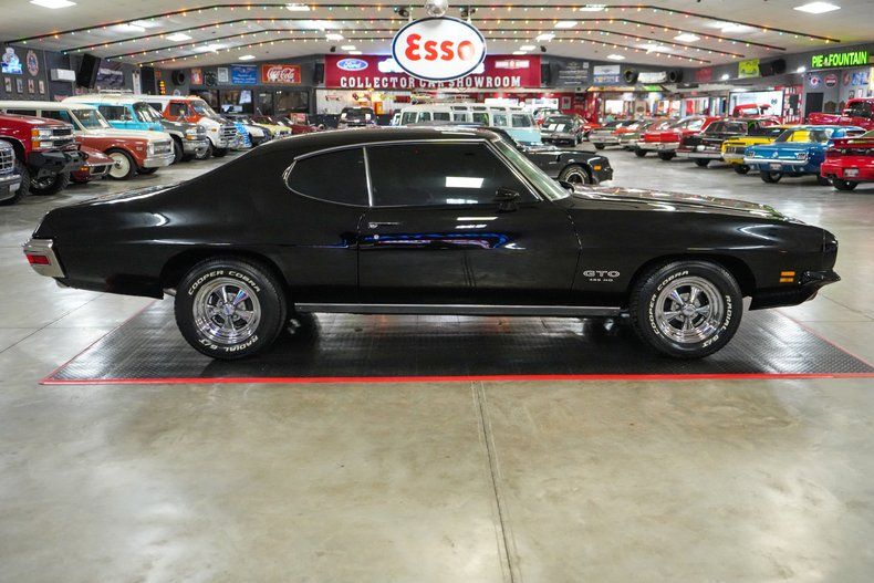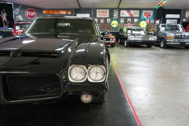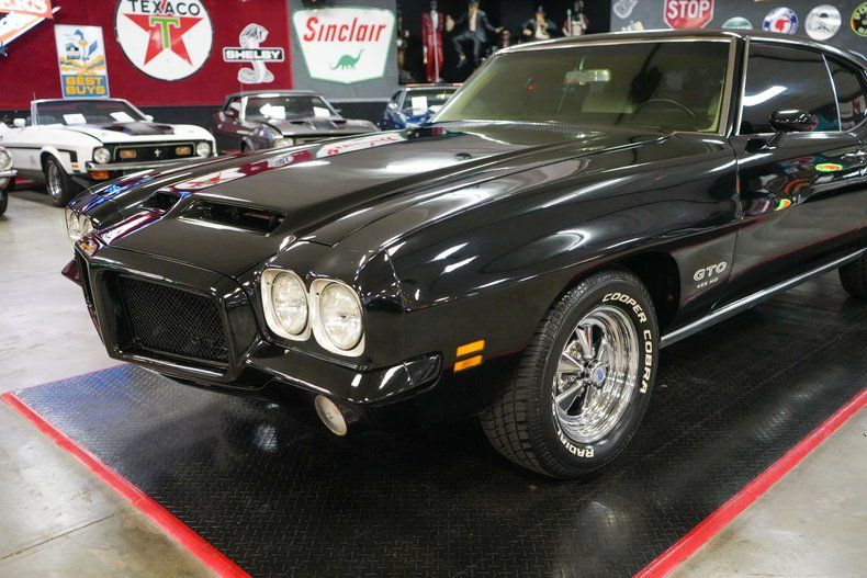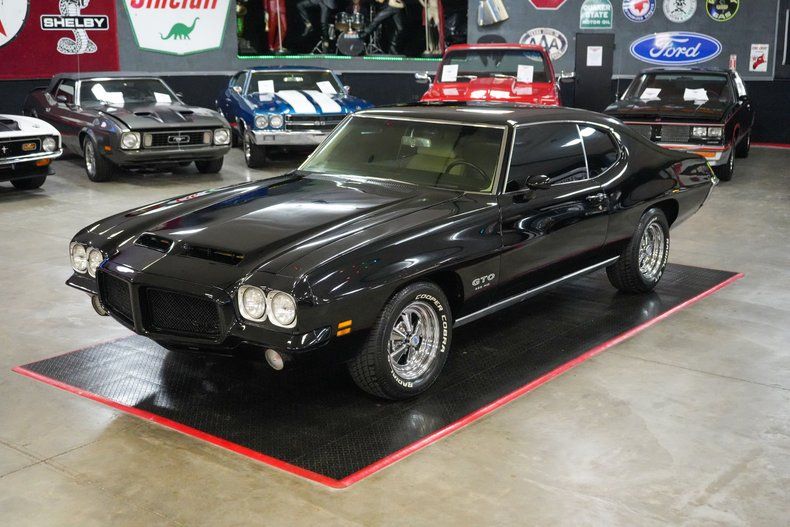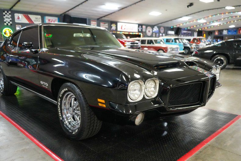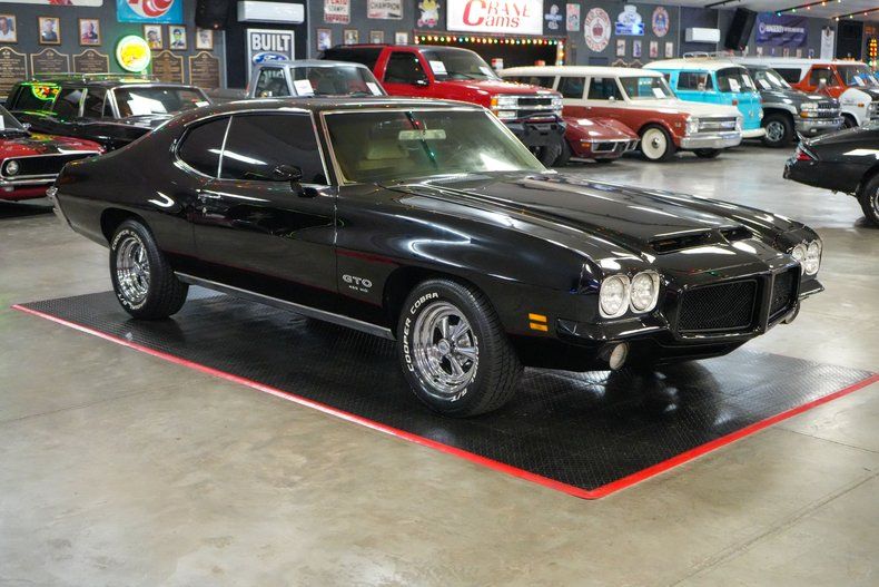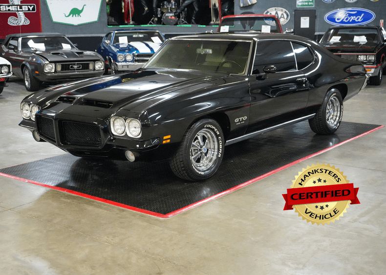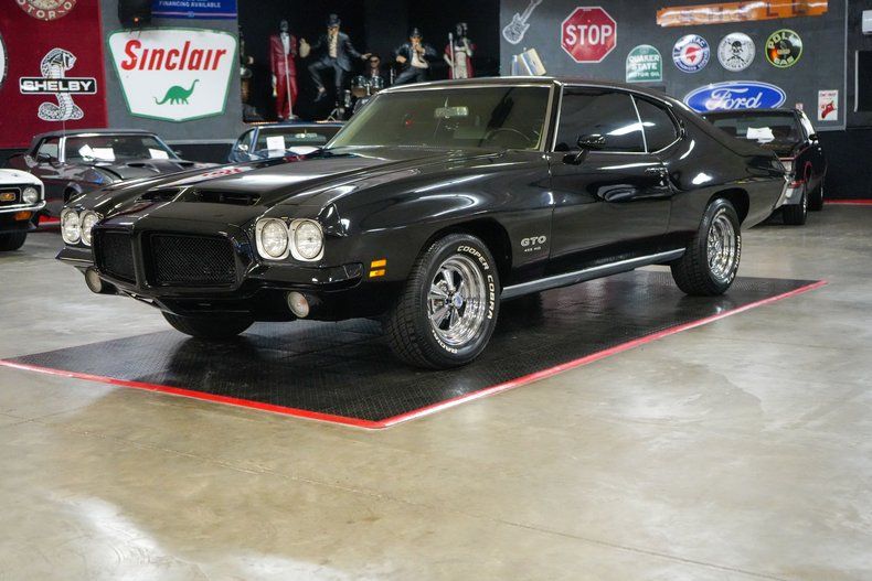 This 1971 Pontiac GTO is a true muscle car icon powered by a formidable 455 HO V8 paired with a Muncie 4-speed manual transmission. A 12-bolt POSI rear end with 3.55 gears delivers strong acceleration and classic street performance. Equipped with power steering, power brakes, and front disc brakes, it offers confident drivability. The white vinyl interior contrasts beautifully with the black exterior paint, while a Hurst shifter adds to the authentic muscle feel. Riding on 15-inch Cragar S/S wheels wrapped in wide BFGoodrich Radial T/A tires, this GTO combines aggressive stance, big-block torque, and timeless Pontiac heritage. THIS VEHICLE QUALIFIES FOR FREE SHIPPING AND A WARRANTY!!
