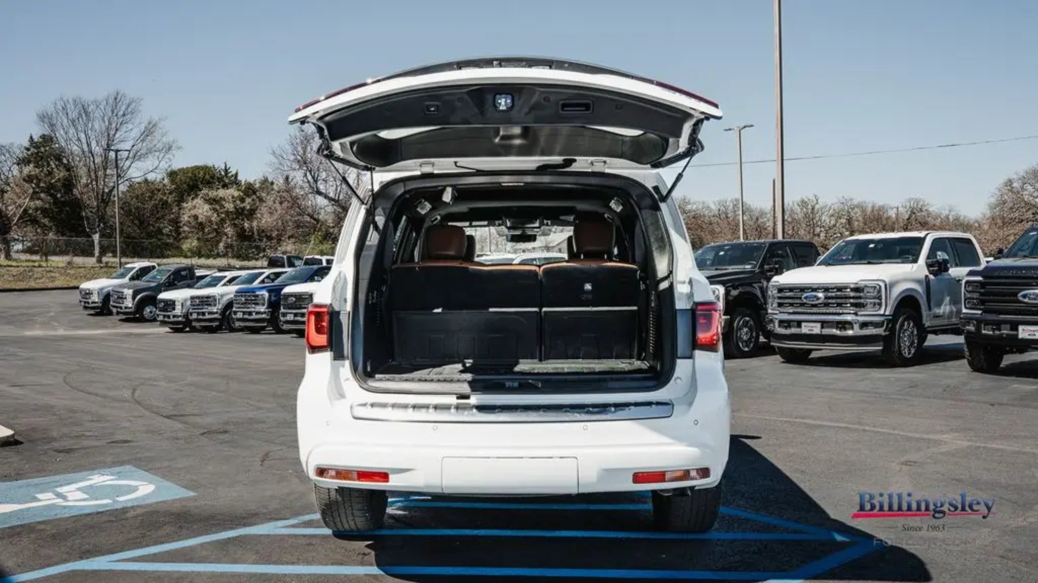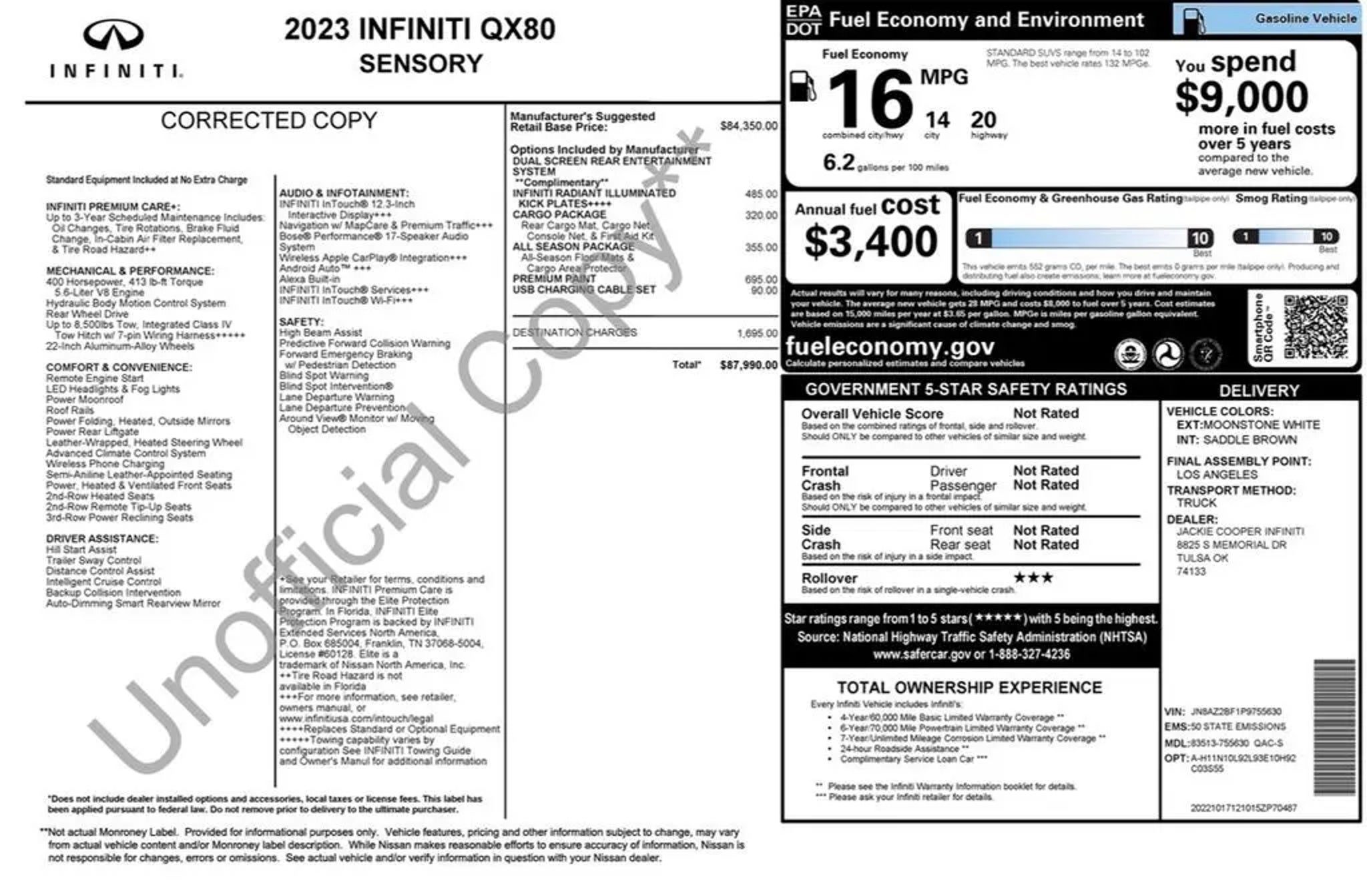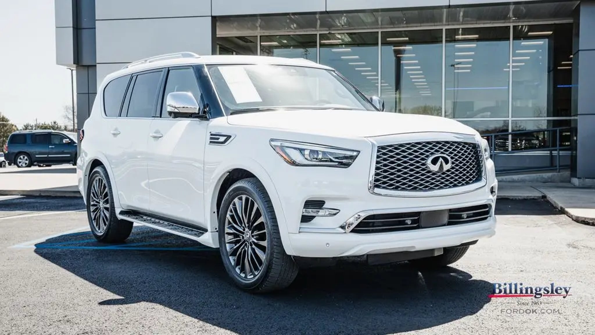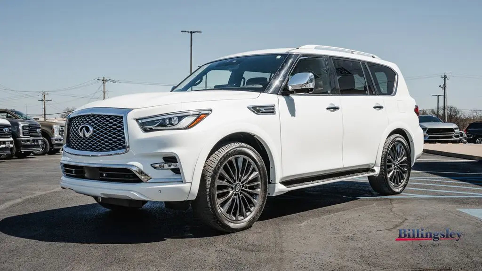 Moonstone White 2023 INFINITI QX80 Premium Select Sensory RWD . It has the 7-Speed Automatic 5.6L V8,3rd row split-bench, All-Season Floor Mats, All-Season Package, Auto tilt-away steering wheel, Automatic temperature control, Cargo Area Mat, Cargo Net, Cargo Package, Carpeted Cargo Mat, Center Console Tray, Console Net, First-Aid Kit, Heated door mirrors, Heated Front Bucket Seats, Heated steering wheel, Leather steering wheel, Leather-Appointed Seats, Memory seat, Navigation system: INFINITI InTouch Navigation, Power door mirrors, Power Liftgate, Power moonroof, Premium audio system: Bose, Rear air conditioning, Split folding rear seat, Wheels: 22 x 8.0 Dark Chrome Cast Aluminum-Alloy. Recent Arrival! Odometer is 16818 miles below market average!