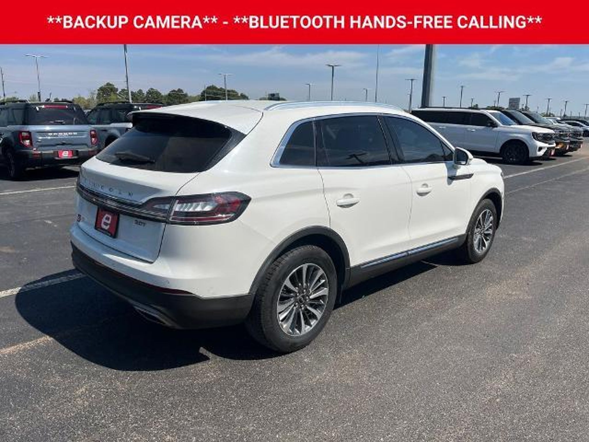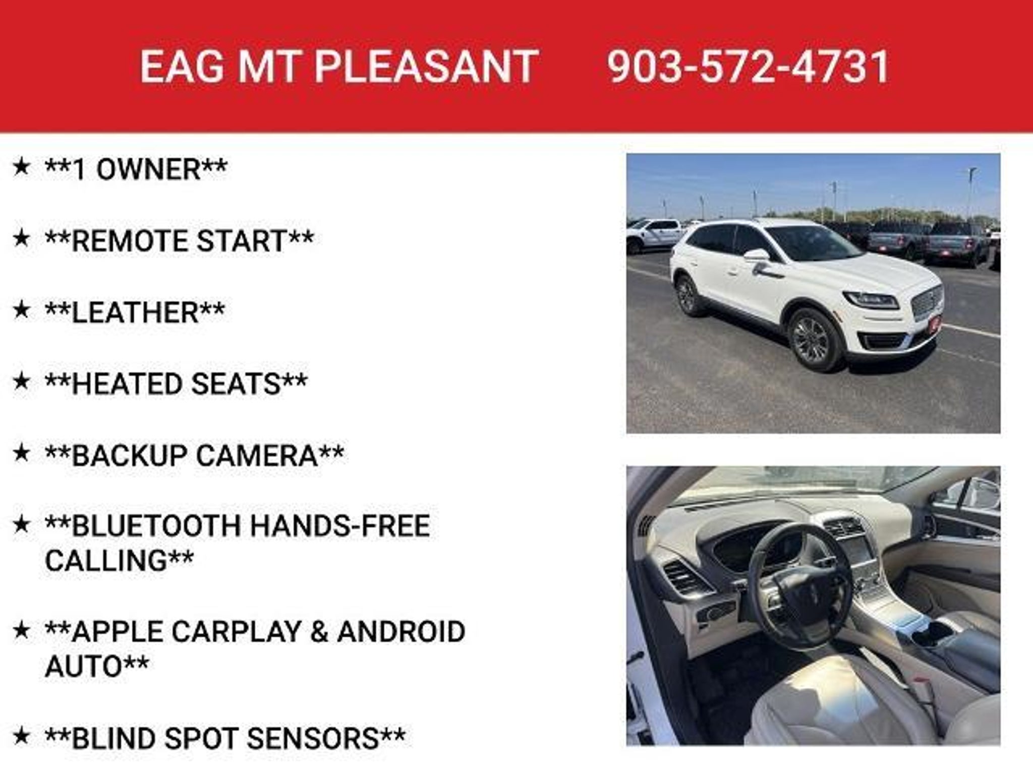 Discover the refined elegance and advanced technology of the 2020 Lincoln Nautilus Standard. This exceptional SUV seamlessly blends style, comfort, and performance, making it the perfect choice for the discerning driver. - **1 OWNER** - **REMOTE START** - **LEATHER** - **HEATED SEATS** - **BACKUP CAMERA** - **BLUETOOTH HANDS-FREE CALLING** - **APPLE CARPLAY & ANDROID AUTO** - **BLIND SPOT SENSORS** - **LANE-KEEPING ASSIST** - Power Liftgate w/Hands Free Functionality - Universal Garage Door Opener Powered by a 2.0L Turbocharged engine and paired with an 8-Speed Automatic transmission, the Nautilus delivers an exceptional driving experience with an EPA-estimated 21 city and 26 highway MPG. Its sleek, modern exterior in Pristine White is complemented by the Satin Roof Rack Side Rails, creating a sophisticated and refined appearance. Step inside the Nautilus and you'll be greeted by a wealth of premium features, including Heated Lincoln Soft-Touch Front Bucket Seats, a Power Liftgate, and a state-of-the-art SYNC 3 infotainment system with navigation, Apple CarPlay, and Android Auto. The Blind Spot Sensors and Lane-Keeping Assist technologies provide added peace of mind, while the Backup Camera and Bluetooth Hands-Free Calling keep you connected and in control. Discover the perfect blend of luxury, technology, and performance in the 2020 Lincoln Nautilus Standard. This SUV is designed to elevate your driving experience and leave a lasting impression. Schedule a test drive today and experience the difference for yourself. This vehicle is located at EAG Mt. Pleasant, but can be made available upon request. The price listed does not include tax, title, license, or documentation fees ($225). We are located just west of Titus Regional Medical Center on the I-30 frontage road.